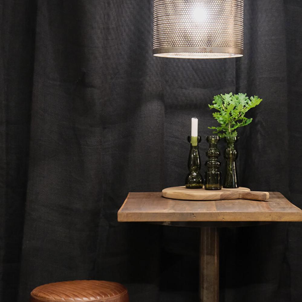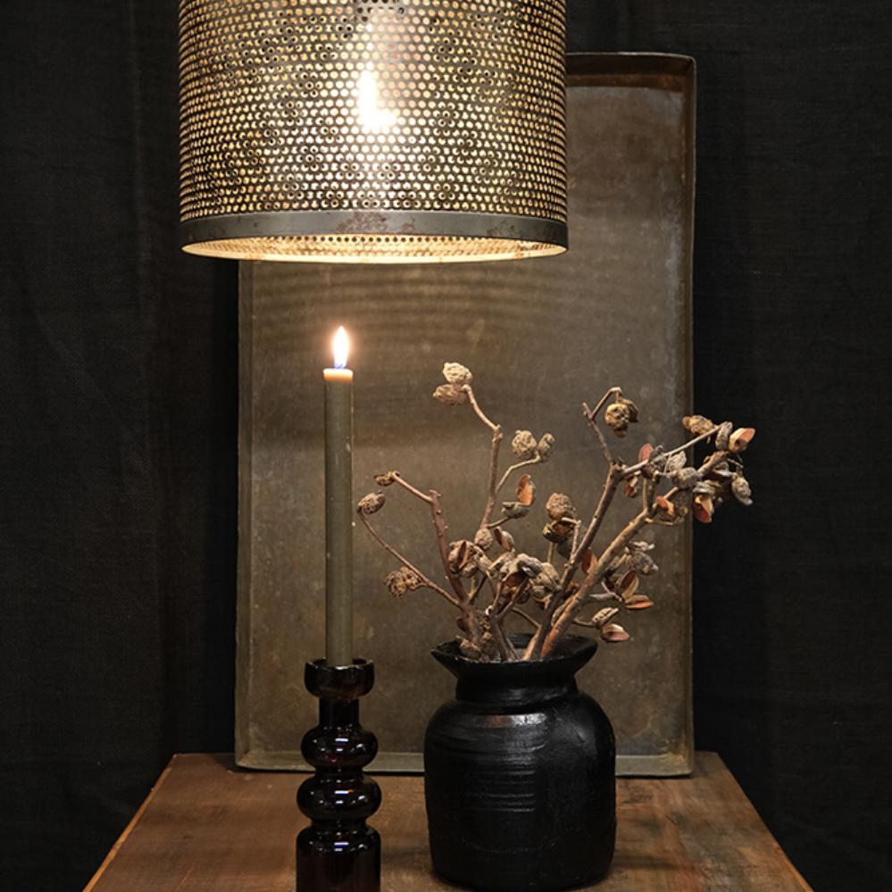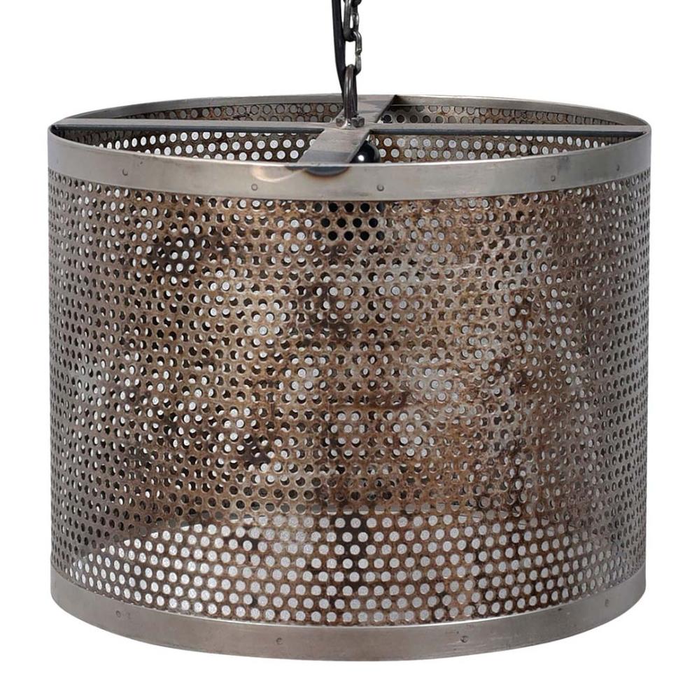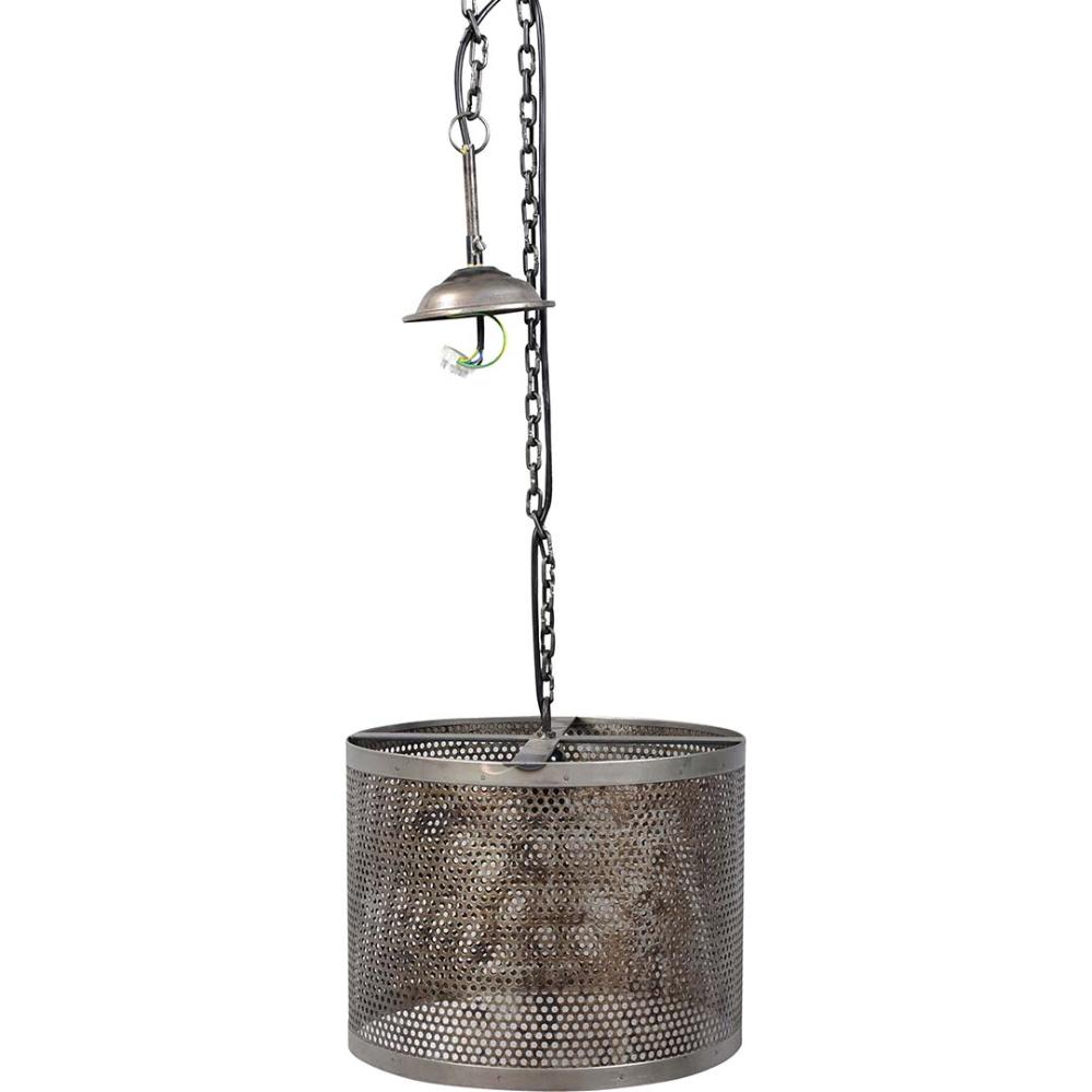 Kelly takes the breath away from most people. The patinated and perforated shade of the rustic iron lamp spreads a raw and industrial atmosphere, no matter what room it lights up. An iron chain is attached to the patinated lampshade and canopy, which adds an extra rustic touch to the lamp.