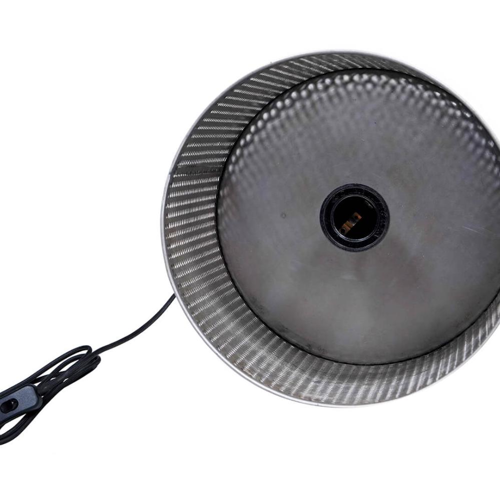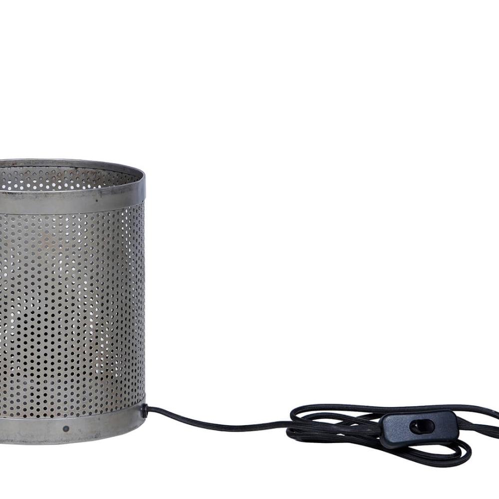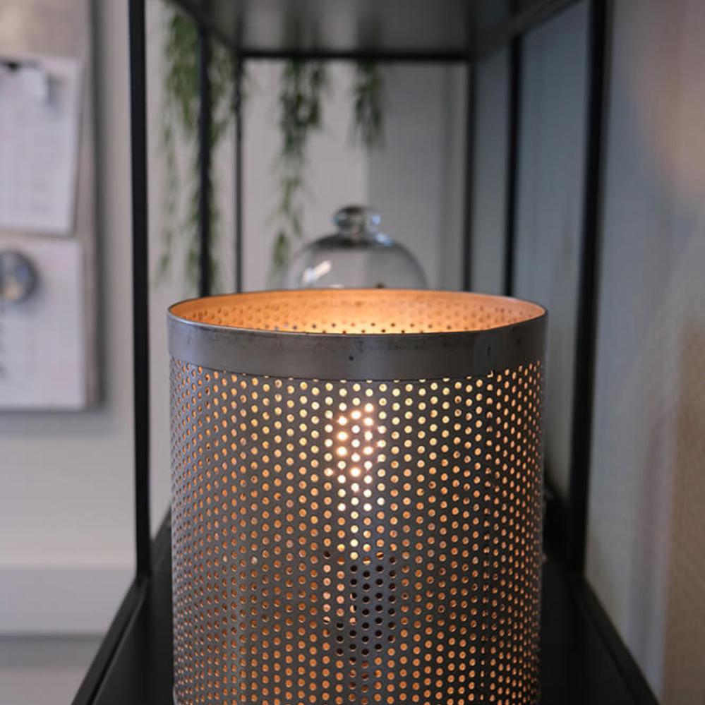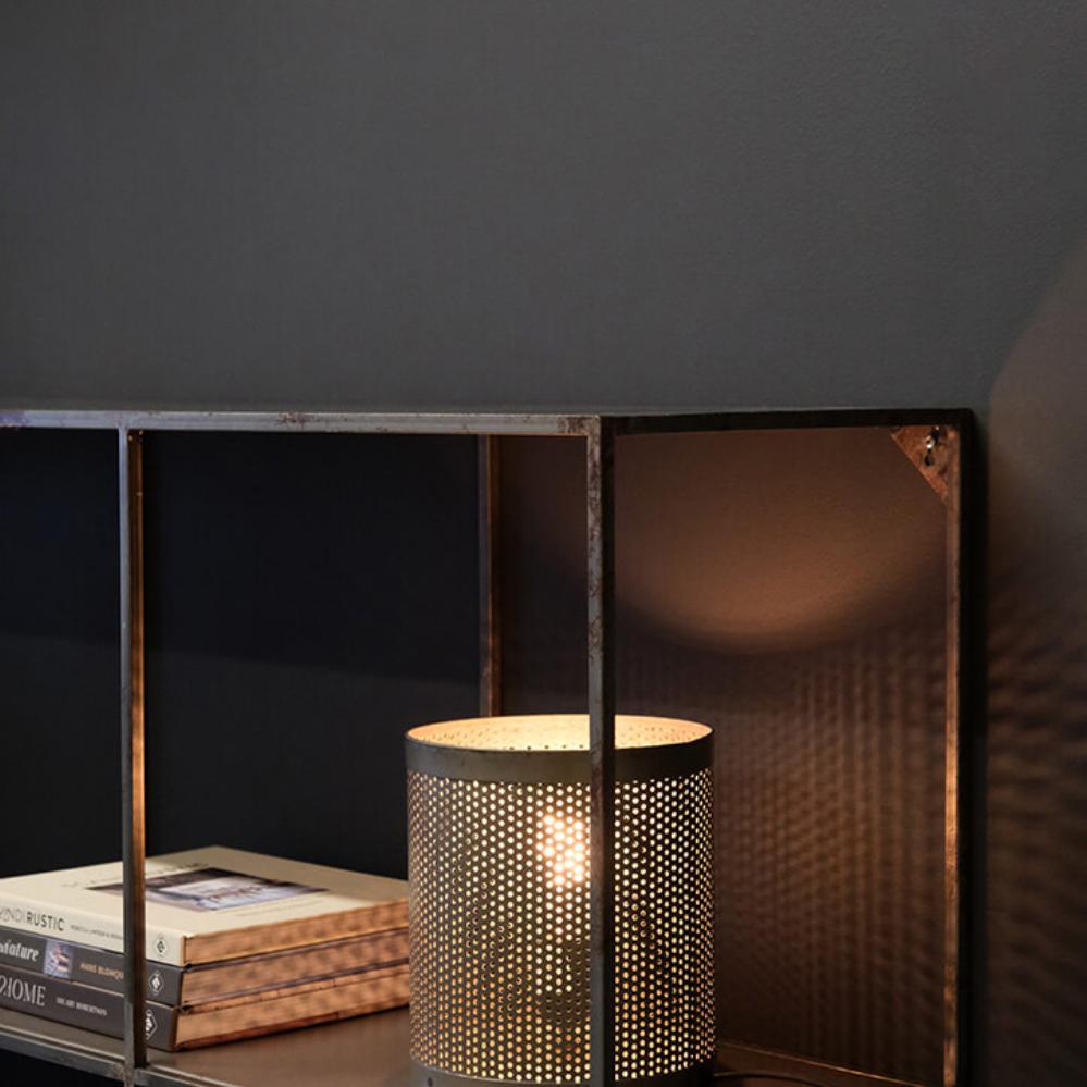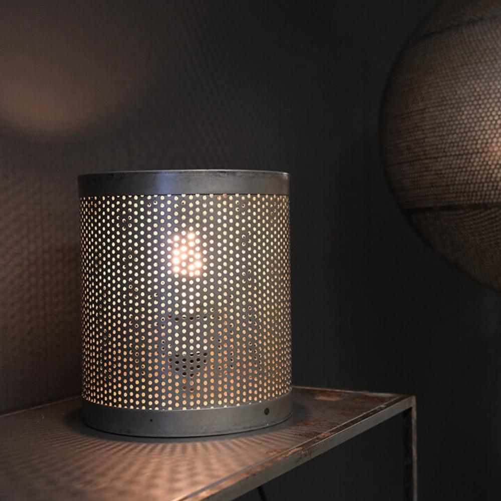 Raw and industrial table lamp with edge. The table lamp is made of rustic iron with a perforated lampshade that gives a beautiful sparkling light. The table lamp fits into a stylish and personal interior and it looks super cool with one of our LED bulbs.