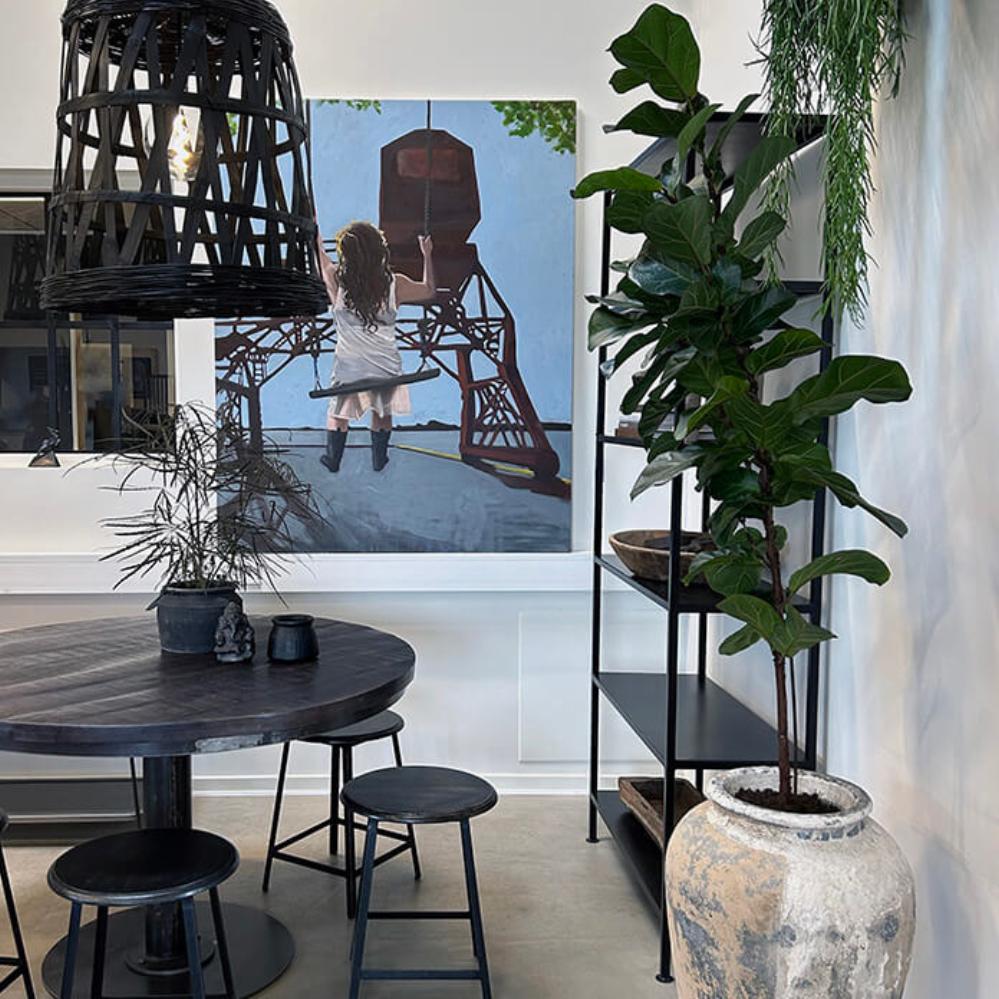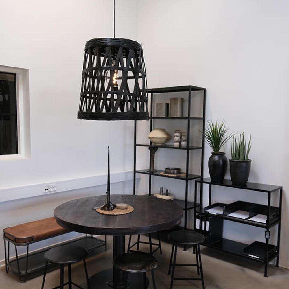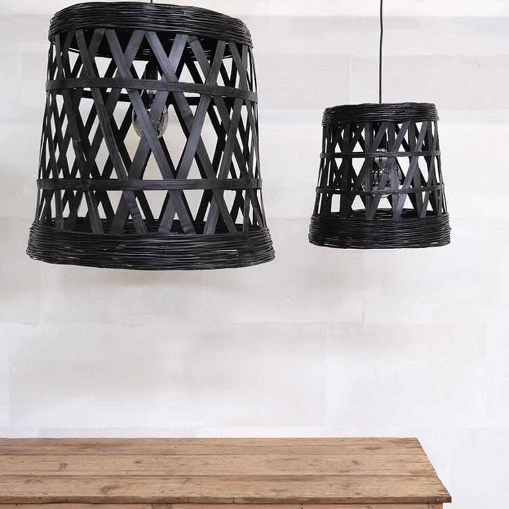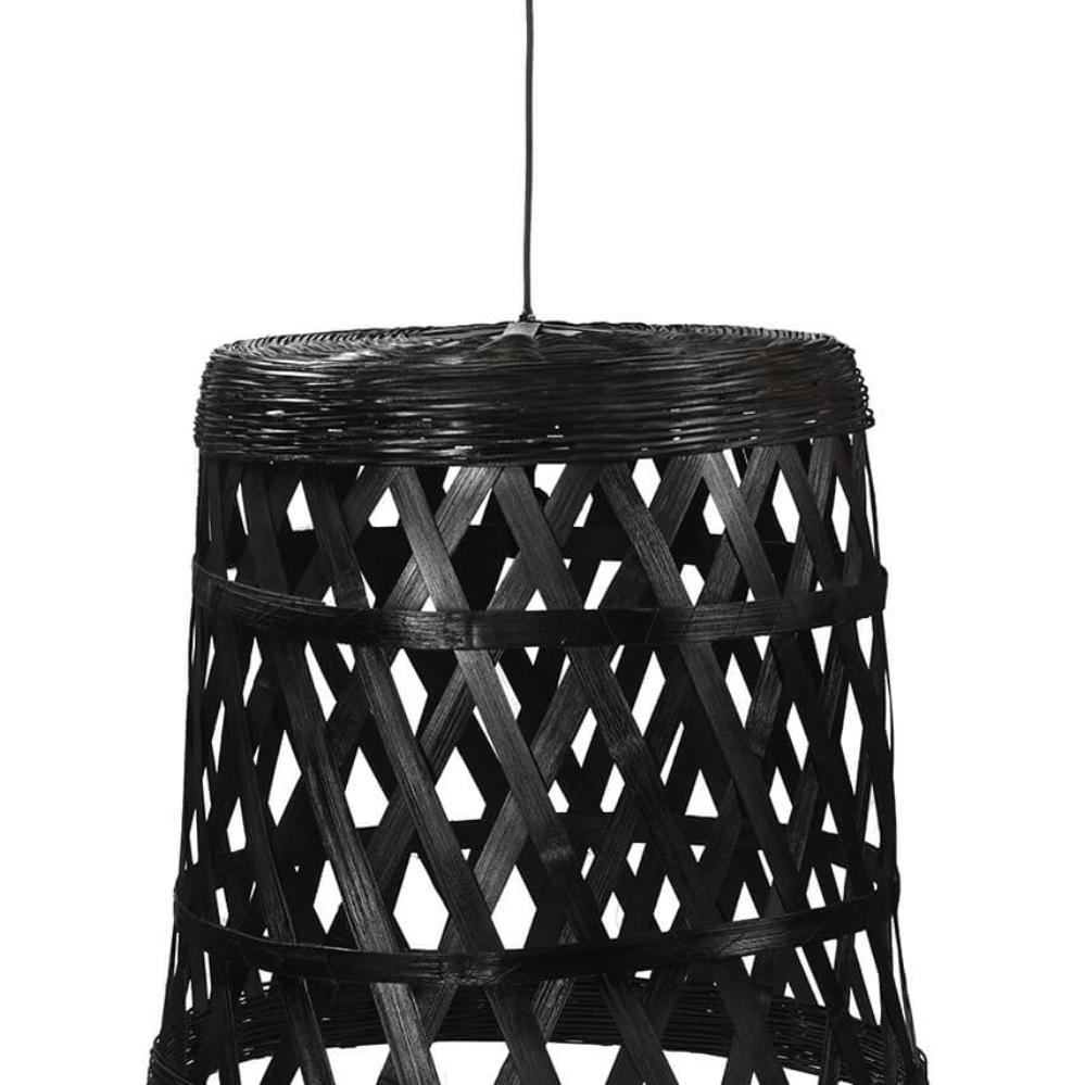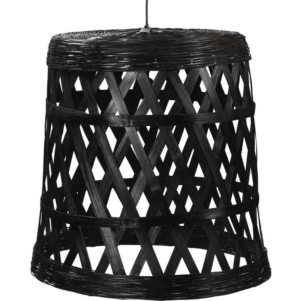 Handwoven lampshade in black-painted bamboo. The lampshade can be used wherever you want to add a natural lightness to your decor. Originally, this lampshade was intended as a giant basket, but when we turned it upside down, magic arose and a lamp was created. This giant lamp requires space, but you will get an amazing wow effect in the room. Because the lamp is handmade, please note that there may be variation and small differences in both finish and color saturation from lamp to lamp. The top of the lamp has a diameter of 61 cm. This lamp is also available in medium M08354 and small M08355.