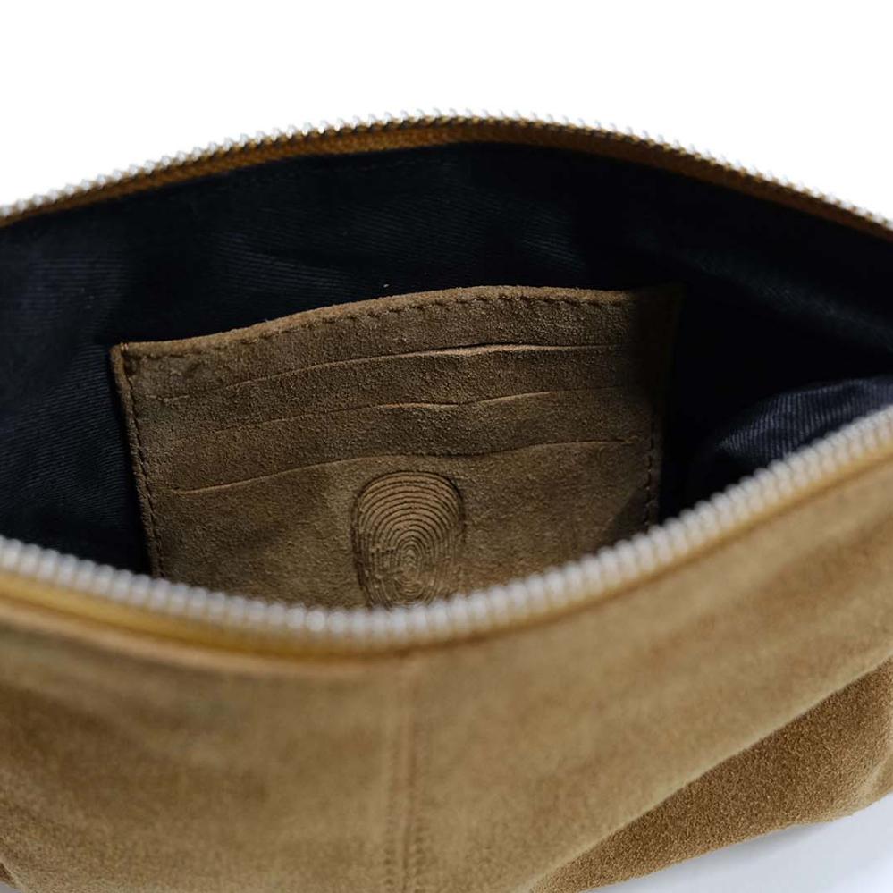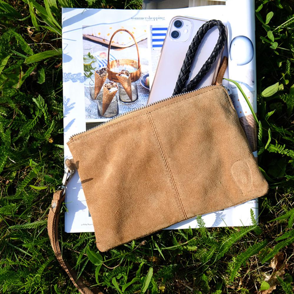 A stylish suede clutch with a detachable wrist strap. The bag closes with a zipper and features a practical inner pocket with zipper and three credit card slots. Use it as a purse, for your phone, or as an nice small bag for a night out. A timeless design with many versatile uses.