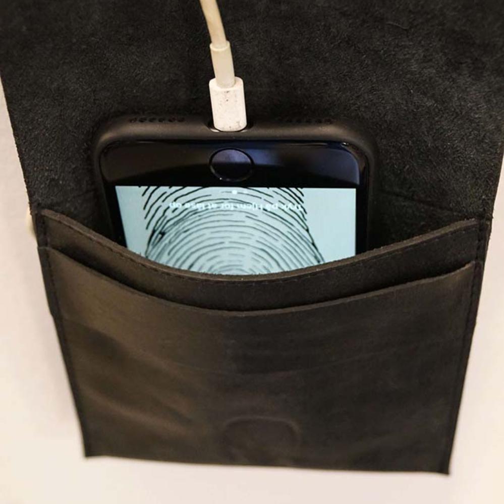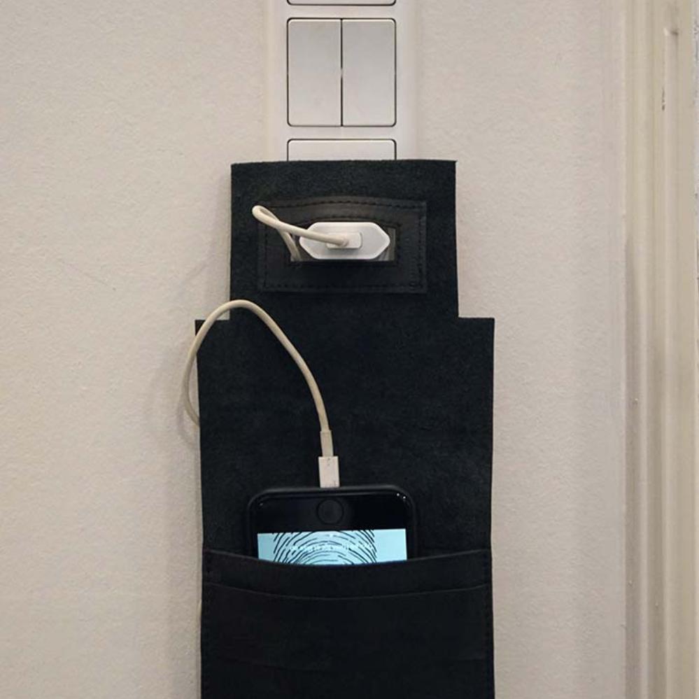 Wall hanging cell phone charger holder in leather. Go all-in on cell phone accessories with this cool leather mobile docking station.