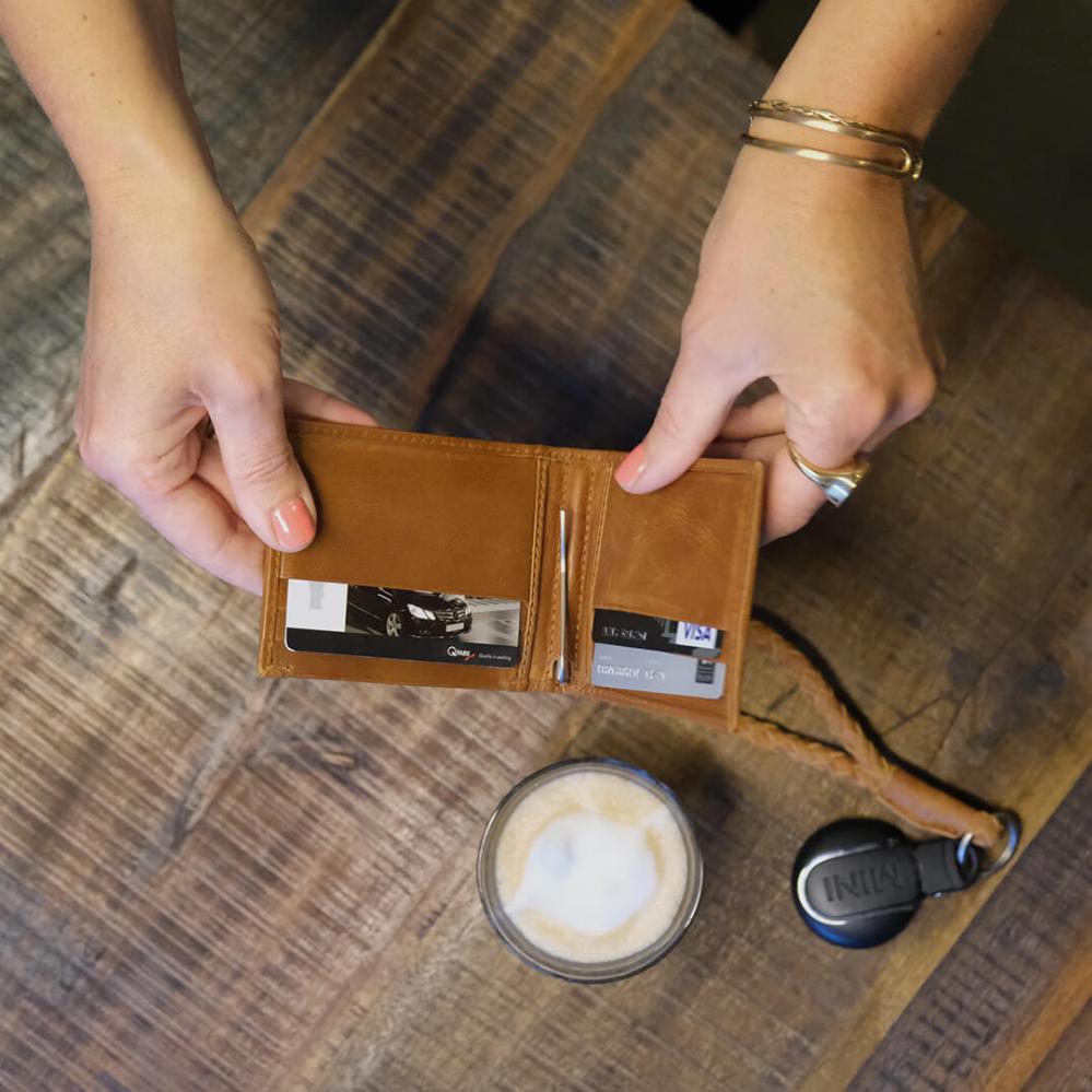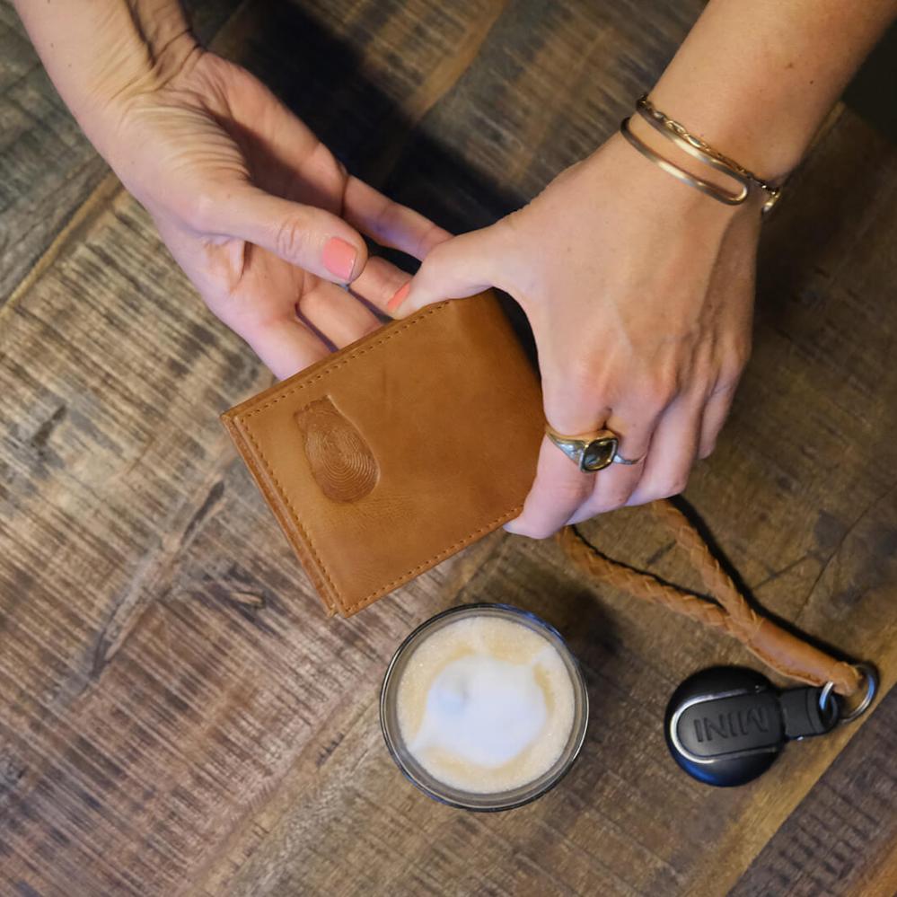 Brown wallet in a simple and classic design. Holds banknotes, receipts and cards. The money clip is located in the center of the wallet, making it easy to get to your cash when you open the wallet. You find a pocket for receipts and 6 card slots in the wallet. The wallet is made of soft black leather and is very slim which means that it does not take up much space in the pocket.