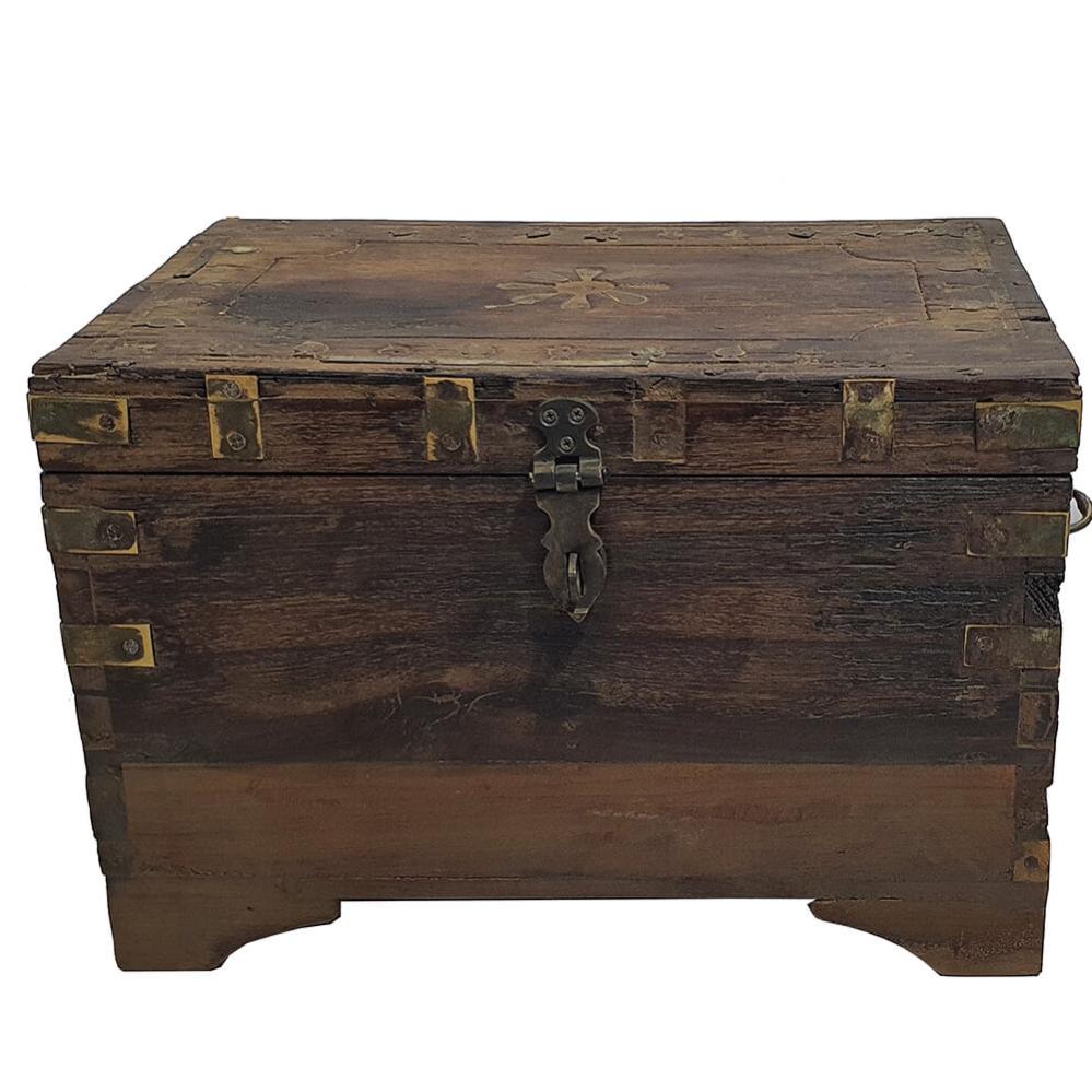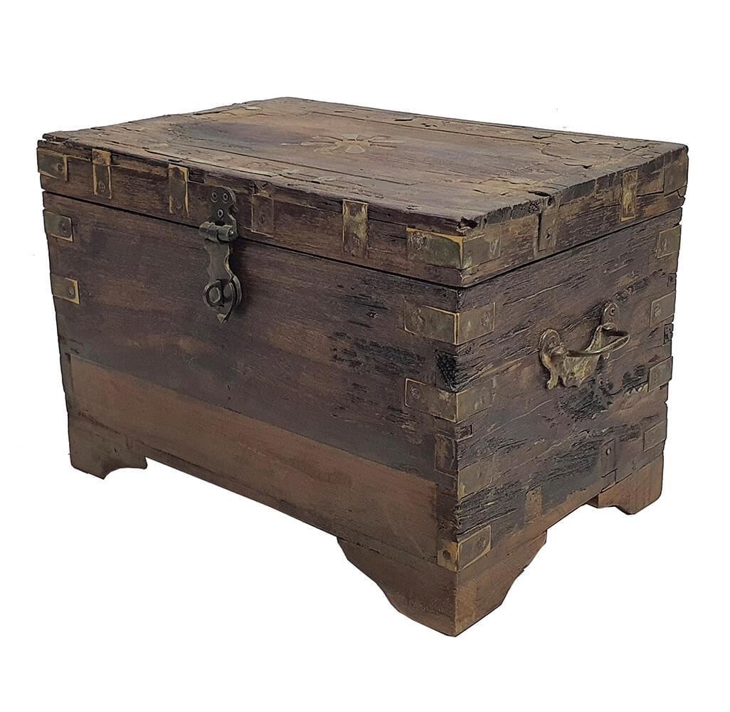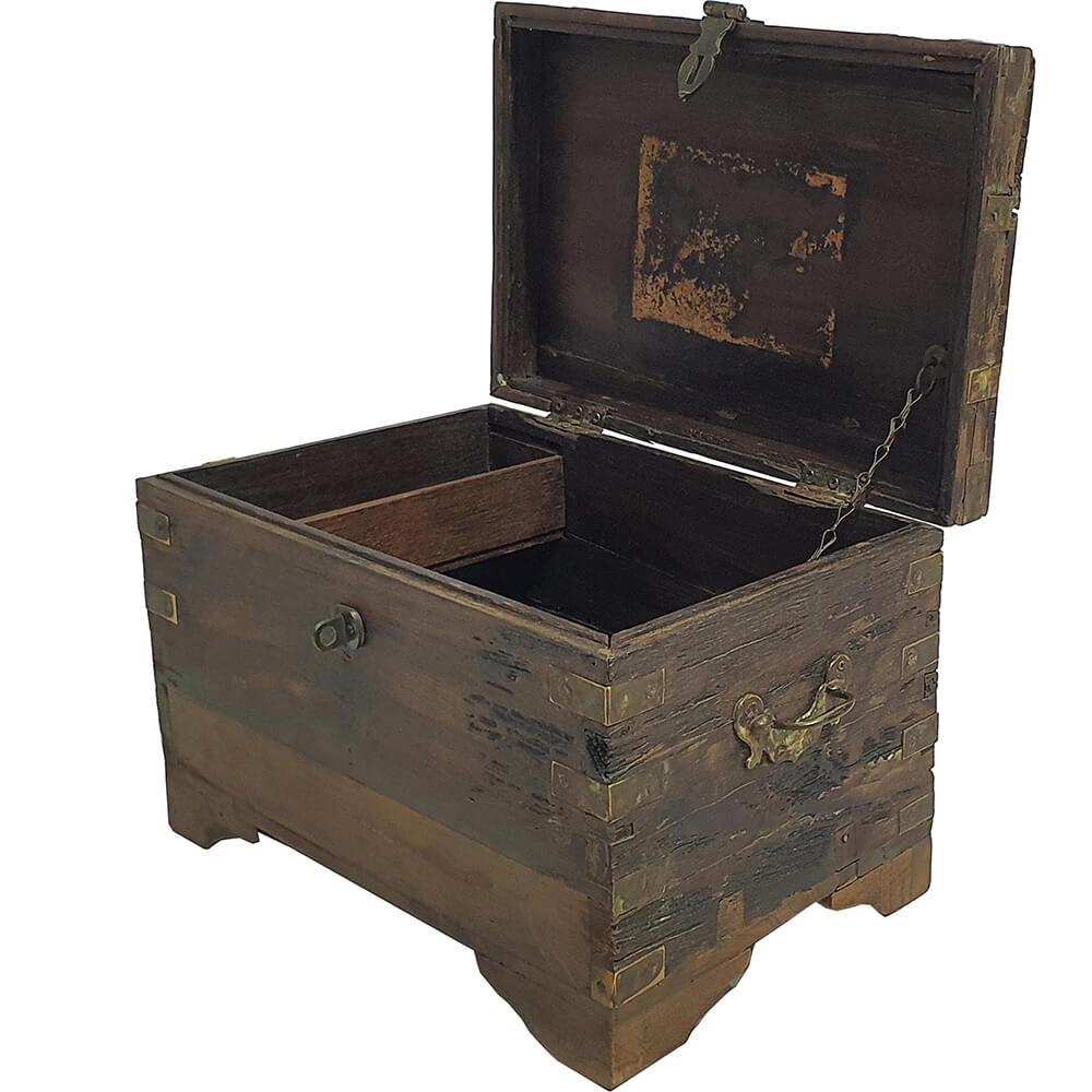 This charming wooden chest exudes a sense of history and solid craftsmanship. Made from dark wood with a clear patina from years of use, it features brass fittings that reinforce the corners, giving it both a robust and decorative look. The side handles make it easy to move. Inside, the chest offers a practical compartment layout with a smaller section. Perfect for storing small items that might otherwise get lost at the bottom. The lid is held securely in place with a classic clasp and chain, which also ensures it can stay open without closing unexpectedly. An authentic and functional storage solution for everything from blankets and games to your most secret treasures.