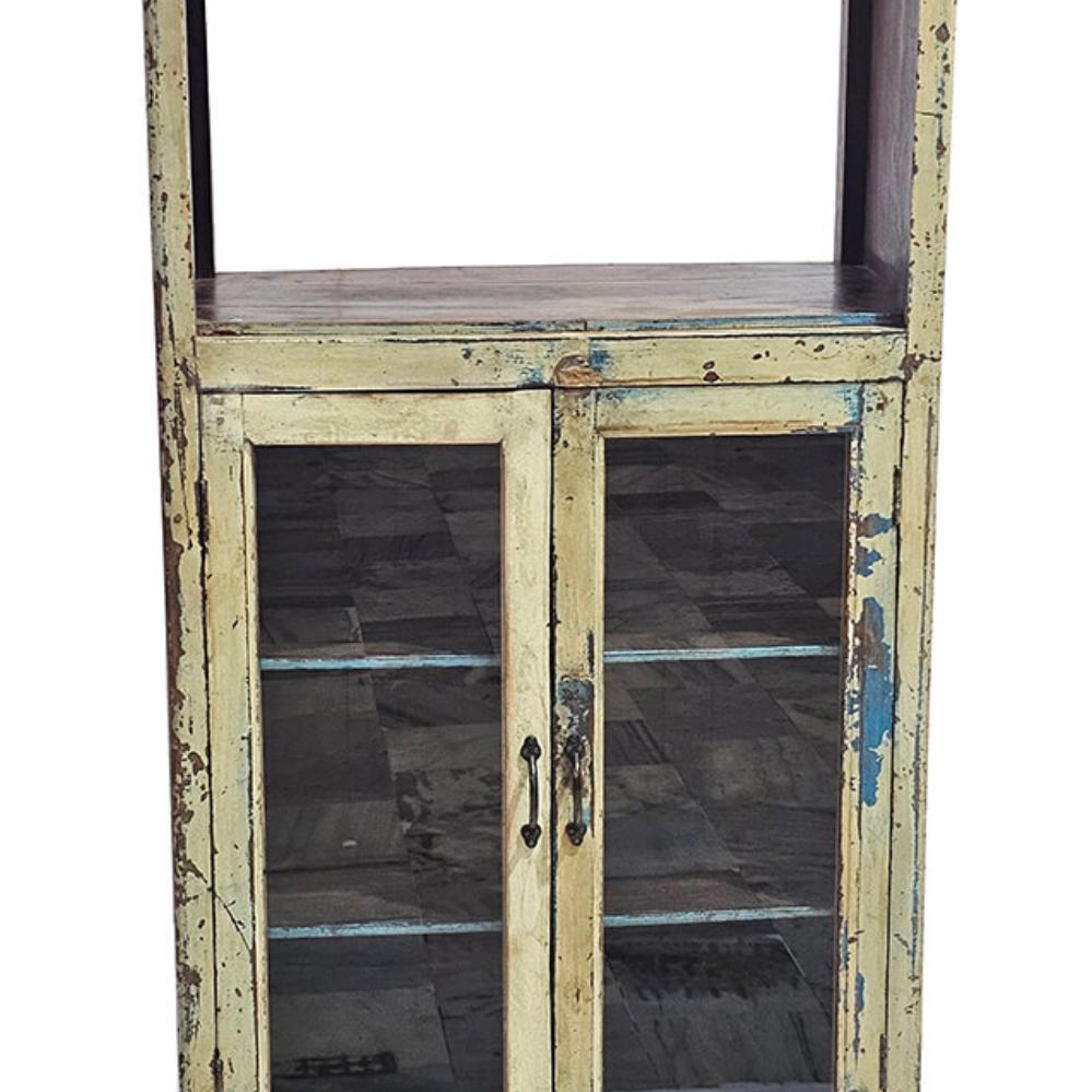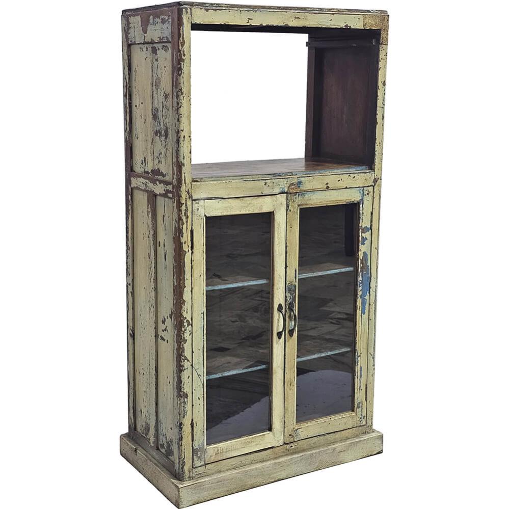 This charming display cabinet exudes personality and a sense of history. Made of wood with a beautifully worn patina in light green tones, its layered paint and aged surface tell a story all their own. The double glass doors create a light and airy look, making it ideal for showcasing glassware, ceramics, or decorative items, while the open top shelf provides extra storage or a perfect display space. This cabinet fits beautifully into any room of the home, as well as in a shop or café, where it adds warmth and authenticity. The combination of glass, wood, and natural patina makes it a unique piece that brings both character and edge to your interior.