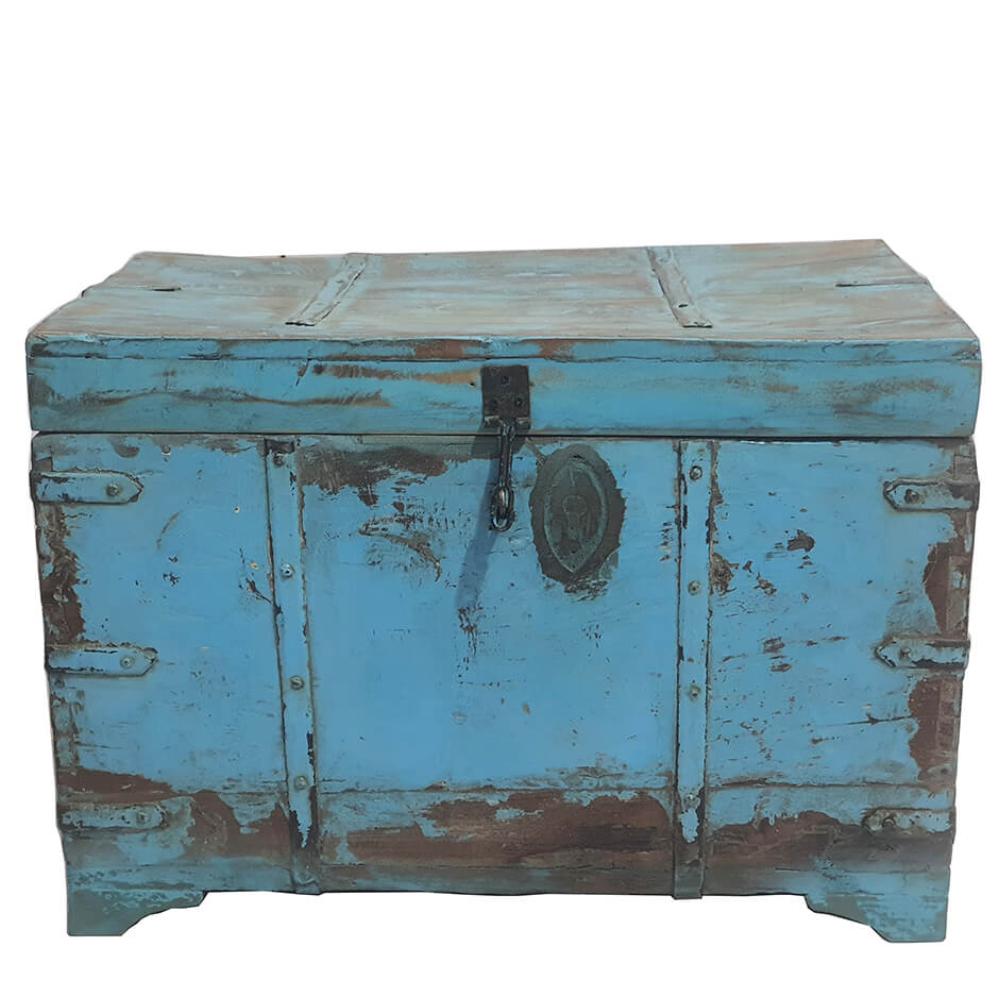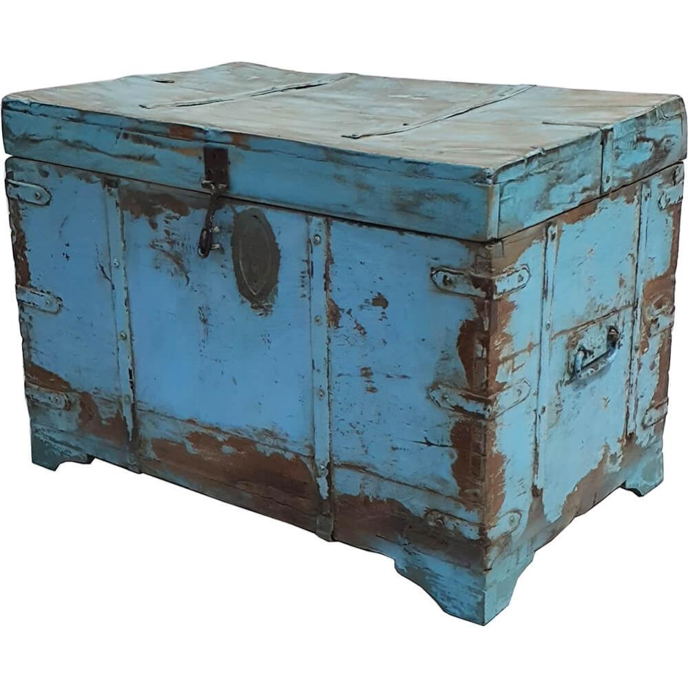 This beautiful old wooden chest in blue-painted wood is full of soul and history. The worn surface reveals underlying wood tones, giving the piece a vibrant and authentic look. The combination of bright blue paint and natural patina makes it a striking eye-catcher in any interior. It features practical side handles and a simple latch, hinting at a functional past, perhaps as a travel trunk or storage chest. Whatever its former life, it still has plenty to offer and is perfect for storing anything from textiles and toys to magazines or small treasures. A one-of-a-kind piece with personality that adds colour and edge to both modern and rustic spaces.