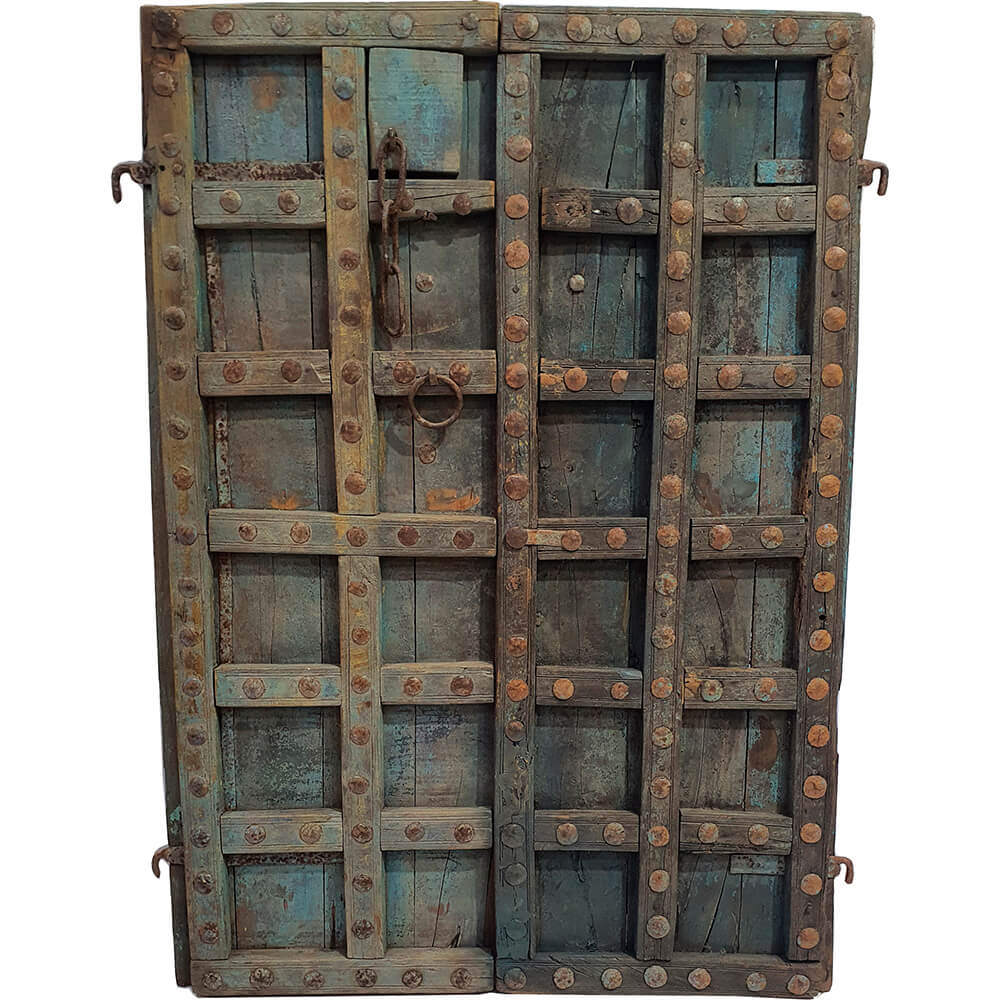 This old wooden door is a striking and authentic piece of craftsmanship. It is constructed from solid wooden panels, assembled and reinforced with many original iron studs. The surface of the wood is shaped by the passage of time and shows a beautiful natural patina with muted shades of blue-green, brown, and grey, reflecting many years of use and wear. The original iron fittings, ring handle, and locking mechanism add character and tell the story of the door’s previous life. Small cracks, irregularities, and traces of earlier repairs have been preserved, giving the door depth and personality. Today, the door is perfectly suited as a decorative element in the interior. It can be used as wall décor, a sliding door, a room divider, or as a dramatic backdrop in a space where warmth, history, and authenticity are desired. A door for those who appreciate reuse, unique materials, and furniture with soul and a story to tell.