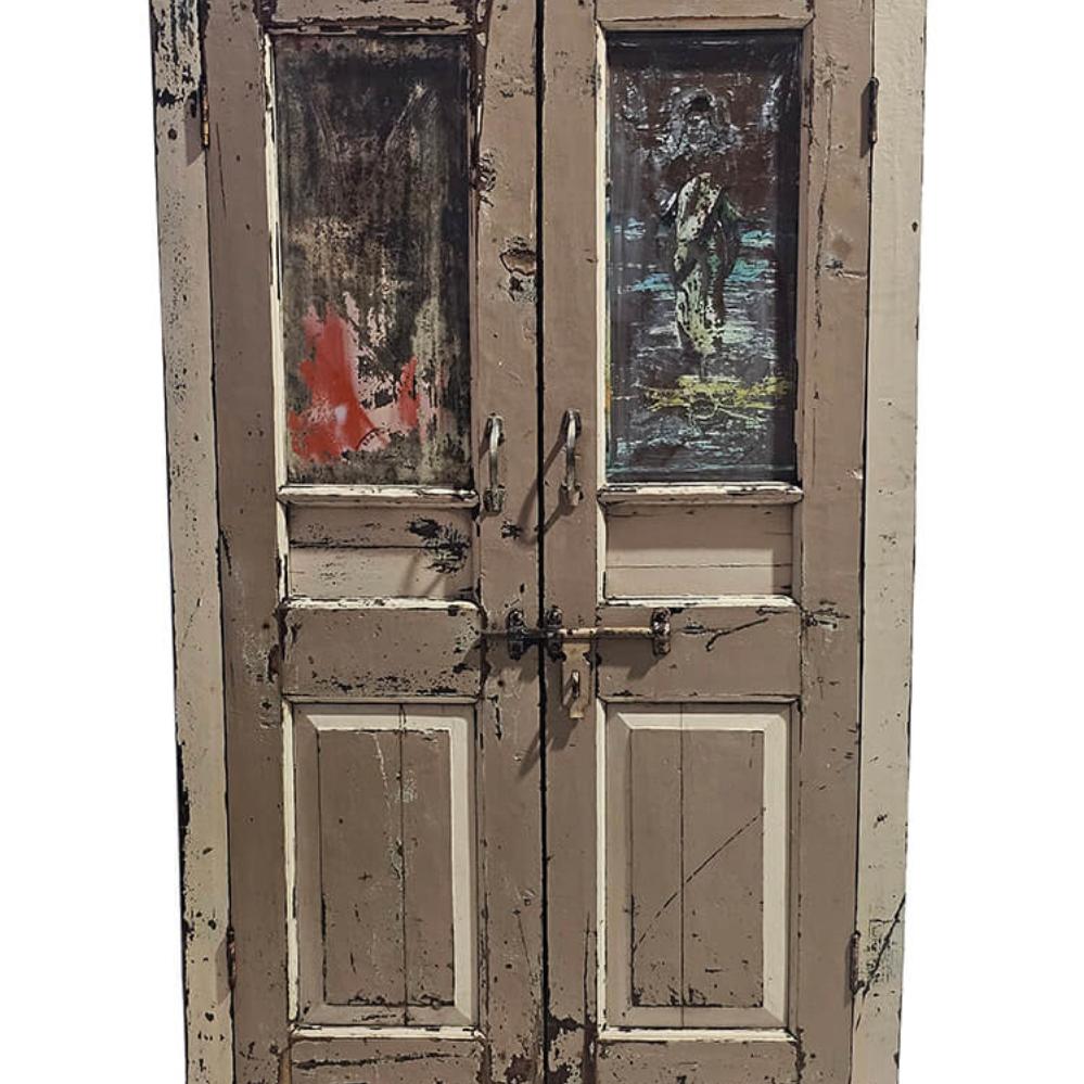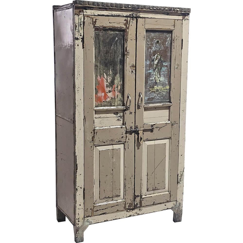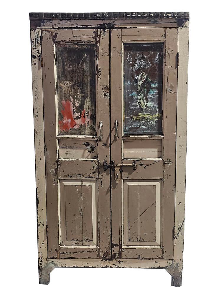 This unique cabinet is a true story told in wood and colour. The pastel-colored paint is beautifully worn, revealing decades of use and gentle wear. On the upper door panels, two handpainted motifs are tucked away, one depicting an Indian female figure, slightly faded but still captivating. These paintings add a deeply personal and historical feel to the piece. The cabinet has two doors and stands firmly on small, cut-corner legs. Its solid wood construction gives it weight and presence, while the simple handles and fittings enhance its rustic character. A standout piece that will catch the eye of history lovers and interior enthusiasts alike.