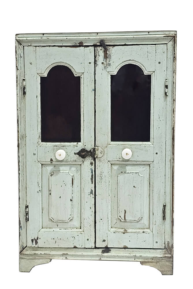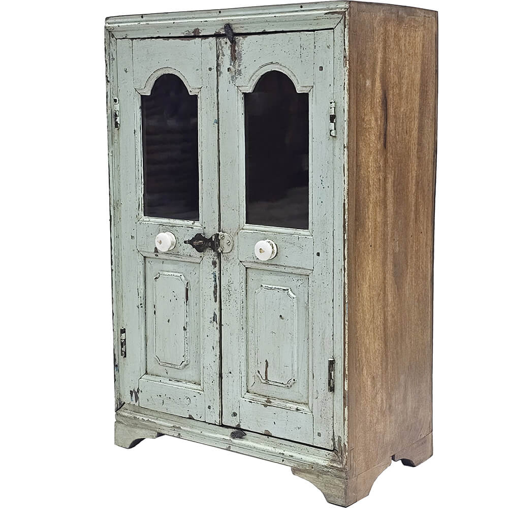 This gorgeous display cabinet is a unique piece with plenty of character and history. Made of wood, it features two beautifully carved doors with glass panels that give it a light and elegant look. The lovely green patina with natural wear enhances its authentic appearance and adds a rustic, timeless touch. Decorative porcelain handles and a classic locking mechanism bring a sense of craftsmanship and nostalgia. Use the cabinet to showcase your porcelain, glassware, or favorite treasures, and create a warm, inviting atmosphere in your interior.