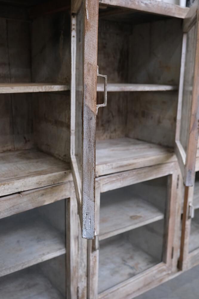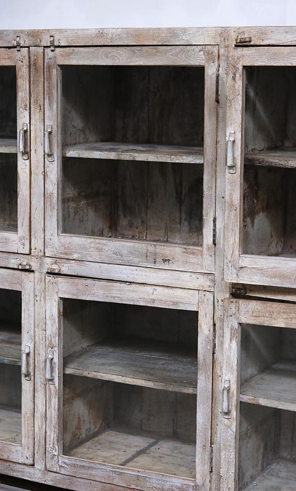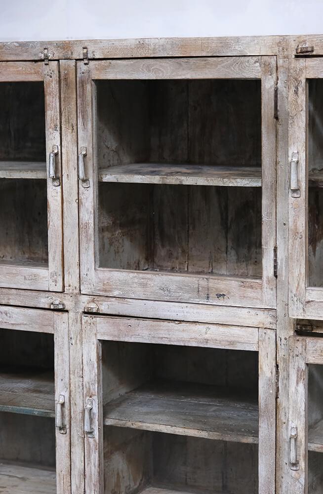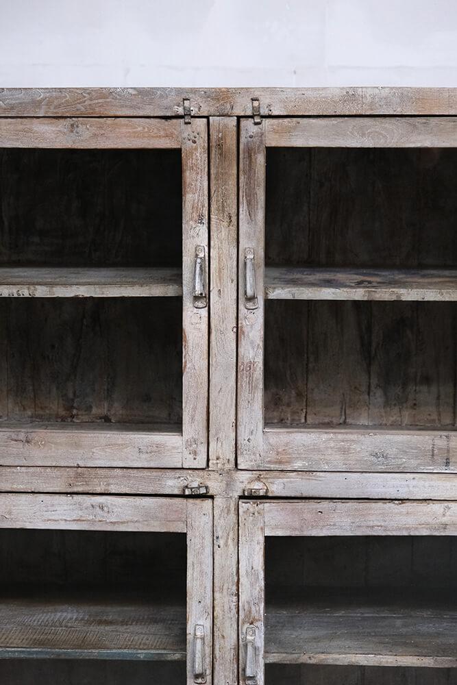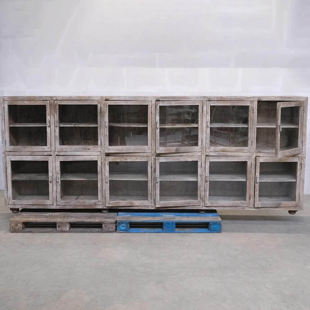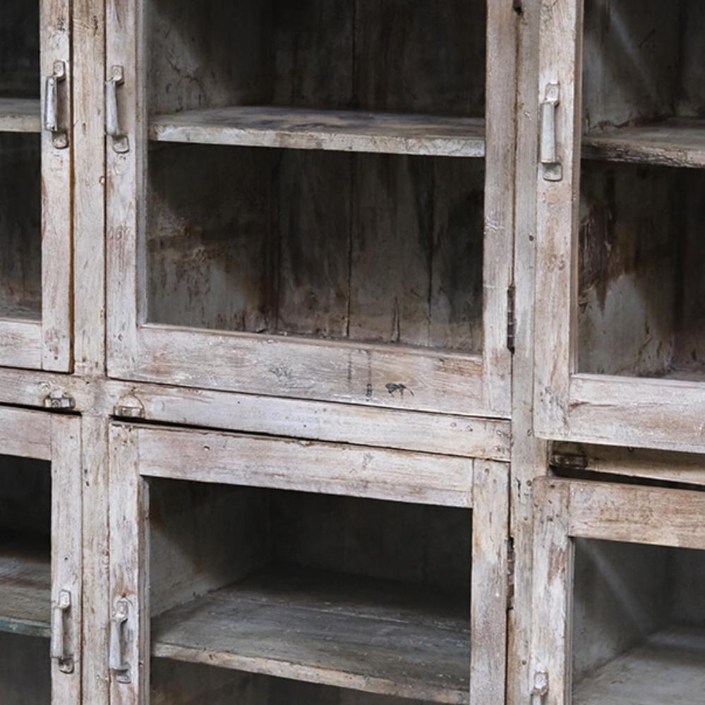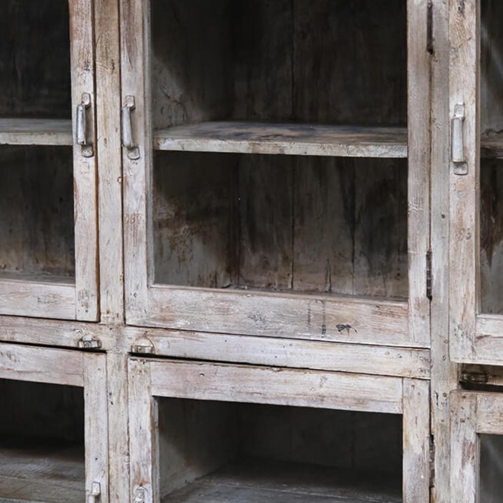 This fantastic old display cabinet is an eyecatcher like no other. A large, solid and raw cabinet with 12 glass doors, each offering storage space with style. The patinated surface in soft, muted tones tells a story of a long life and gives the cabinet an authentic charm that only true vintage can offer. Perfect for those who want to combine practical storage with decorative value. Use it for tableware, books, clothes, shoes or beautiful items. There’s plenty of room behind those weathered glass doors. A one-of-a-kind with edge and character that fits beautifully into industrial, rustic, modern or eclectic interiors. Yes, it takes up space, but it gives back so much more.