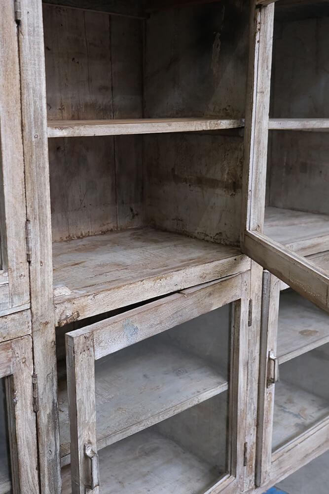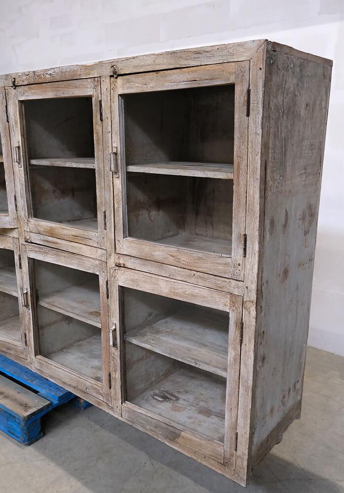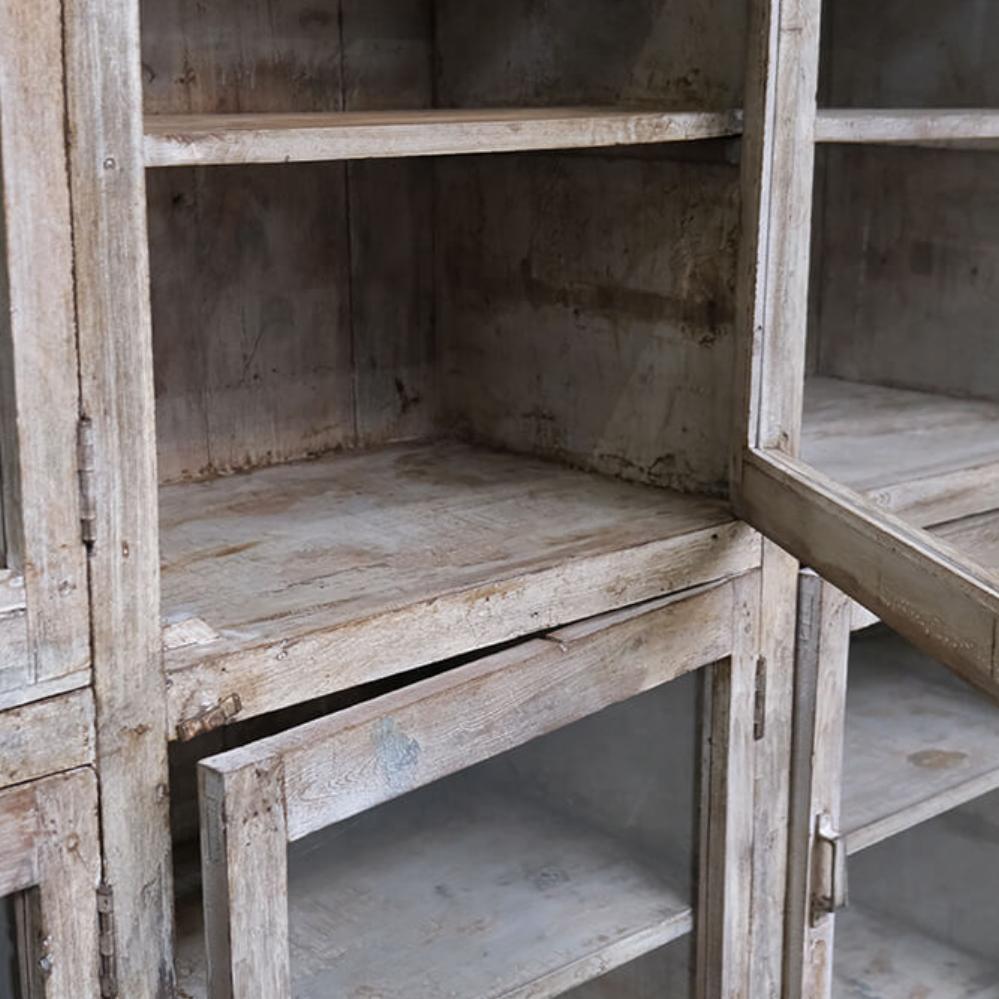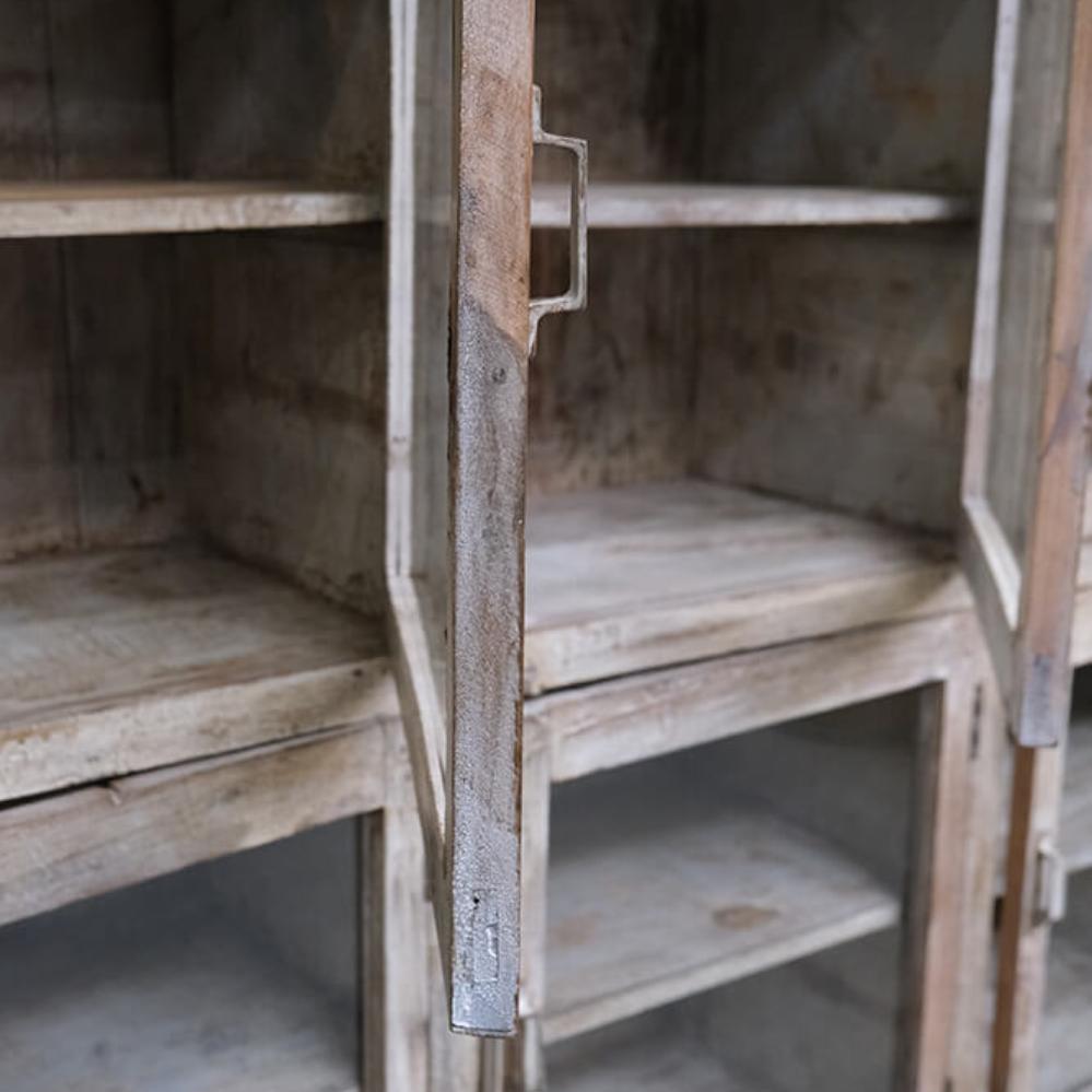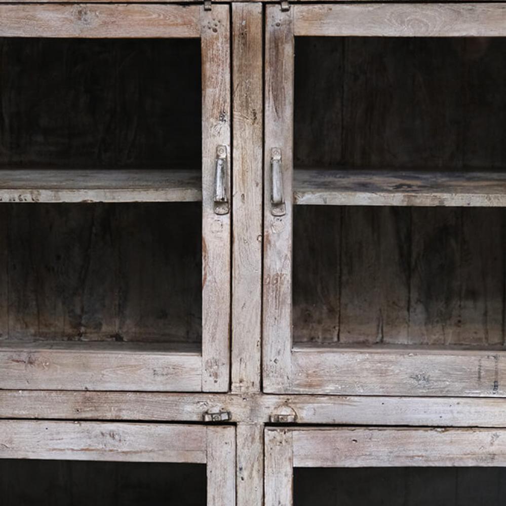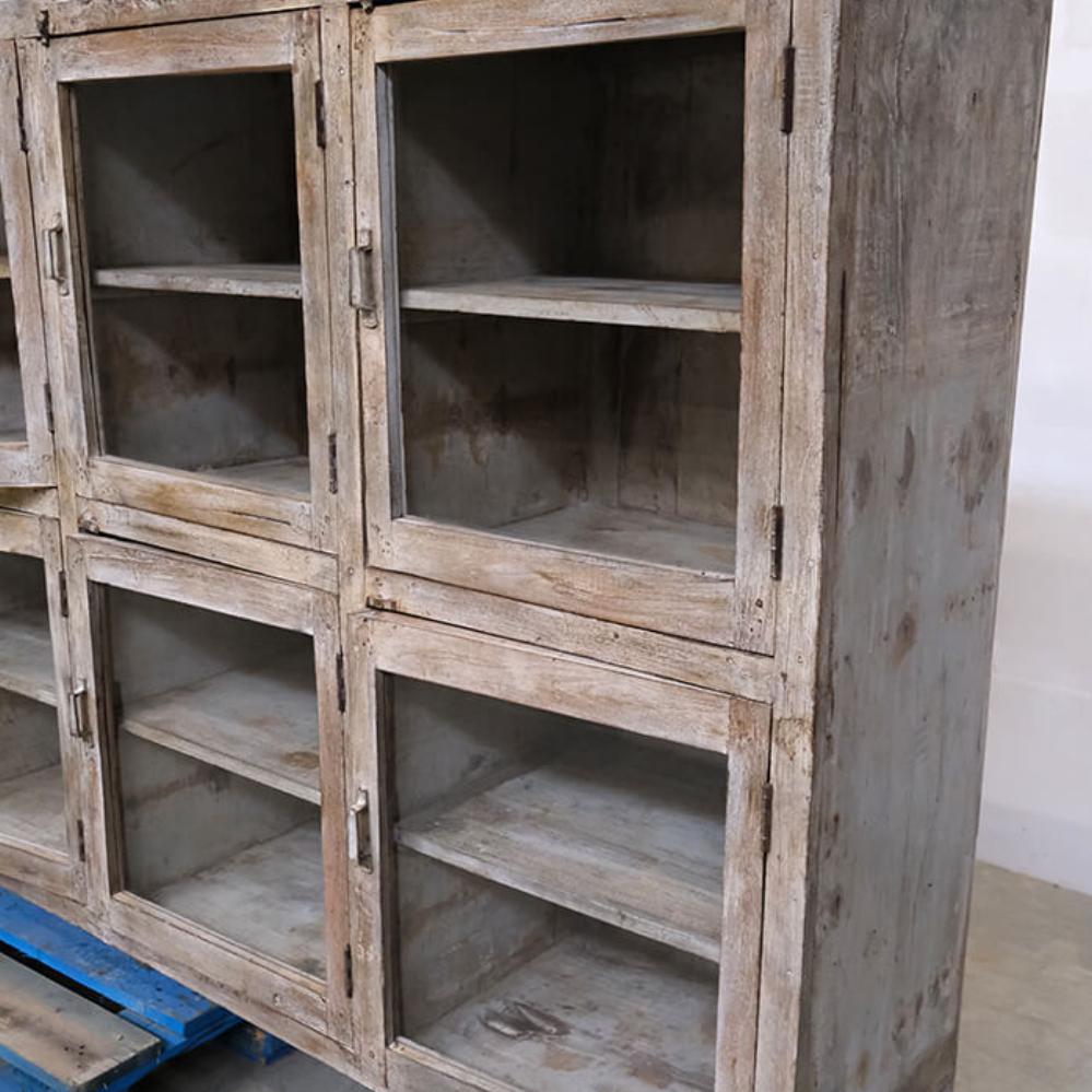 This fantastic old display cabinet is an eyecatcher like no other. A large, solid and raw cabinet with 12 glass doors, each offering storage space with style. The patinated surface in soft, muted tones tells a story of a long life and gives the cabinet an authentic charm that only true vintage can offer. Perfect for those who want to combine practical storage with decorative value. Use it for tableware, books, clothes, shoes or beautiful items. There’s plenty of room behind those weathered glass doors. A one-of-a-kind with edge and character that fits beautifully into industrial, rustic, modern or eclectic interiors. Yes, it takes up space, but it gives back so much more.