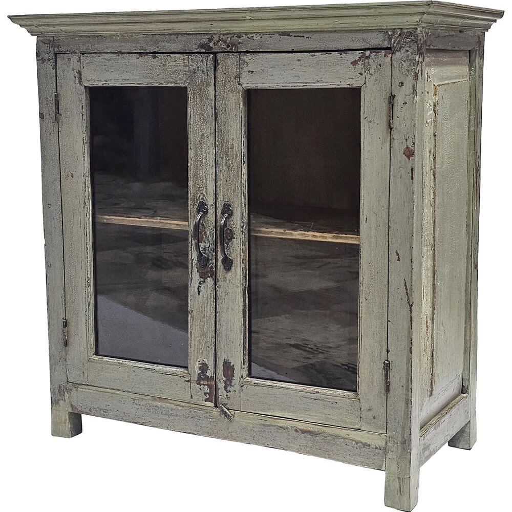 This charming old sideboard is a one-of-a-kind piece with clear character and history. The wooden sideboard has a beautifully patinated surface and two glass doors, and exudes a light and inviting look. The muted color tones and worn details tell the story of years of use and craftsmanship. Inside, there’s plenty of storage space, ideal for tableware, books, or decorative objects you want to display. An authentic piece of furniture that brings warmth and personality into any setting, whether it’s a private home, a shop, or a café.