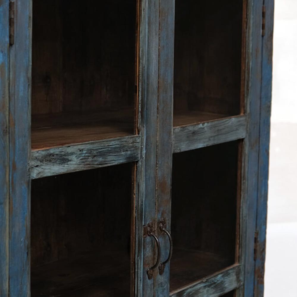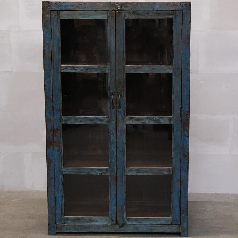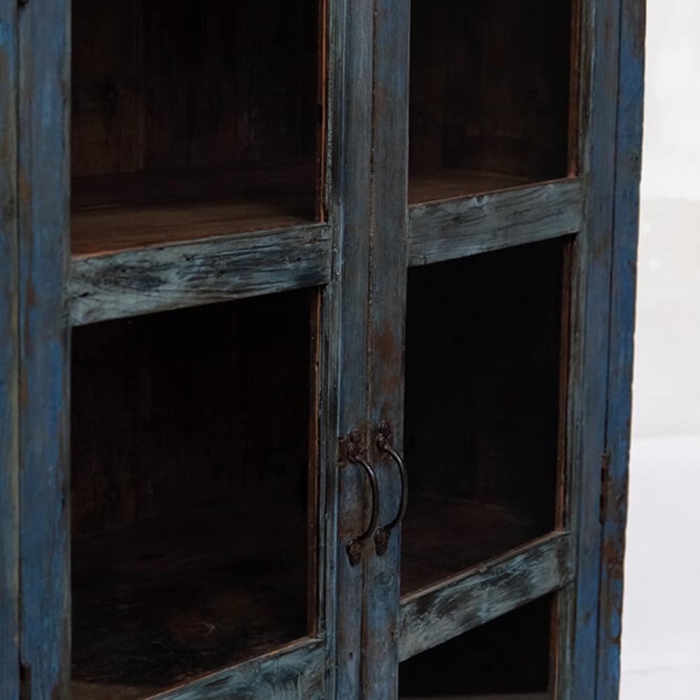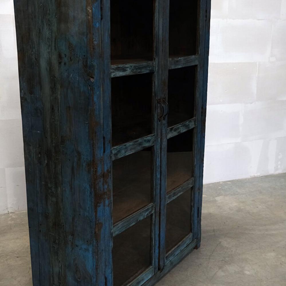 This spacious, old display cabinet has a beautiful and authentic patina. With its two glass doors and roomy interior, the cabinet is perfect for showcasing anything from tableware and decorative items to books and trinkets. The deep blue color of the wood combined with the old metal handles gives the cabinet a raw yet rustic look that fits perfectly into a vintage-style interior. This cabinet is not only functional but will also add plenty of character and soul to your decor.