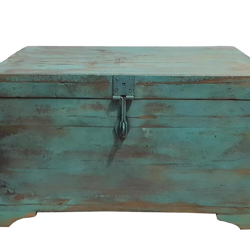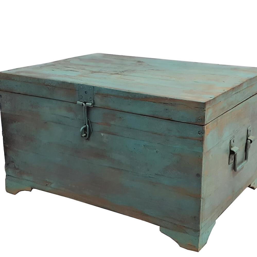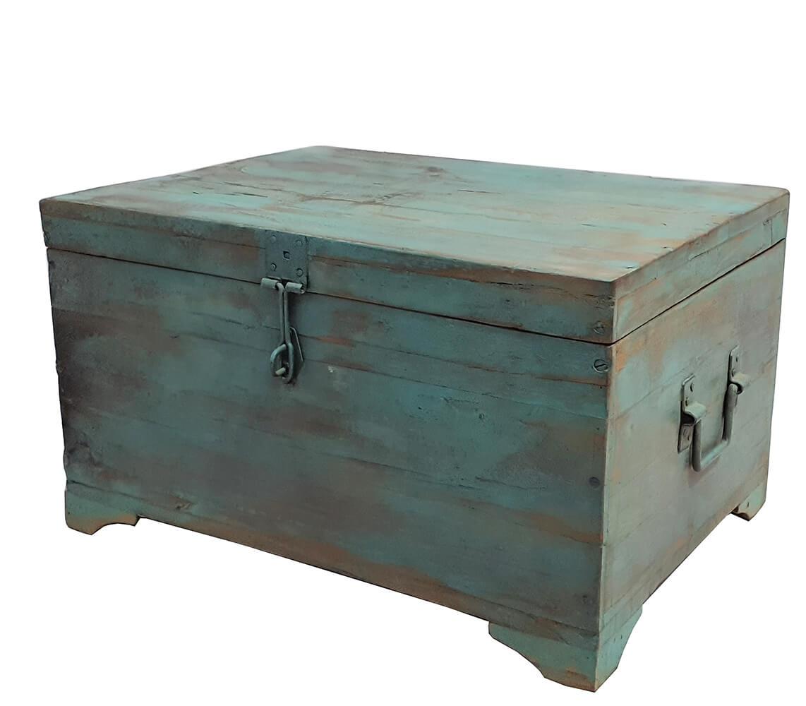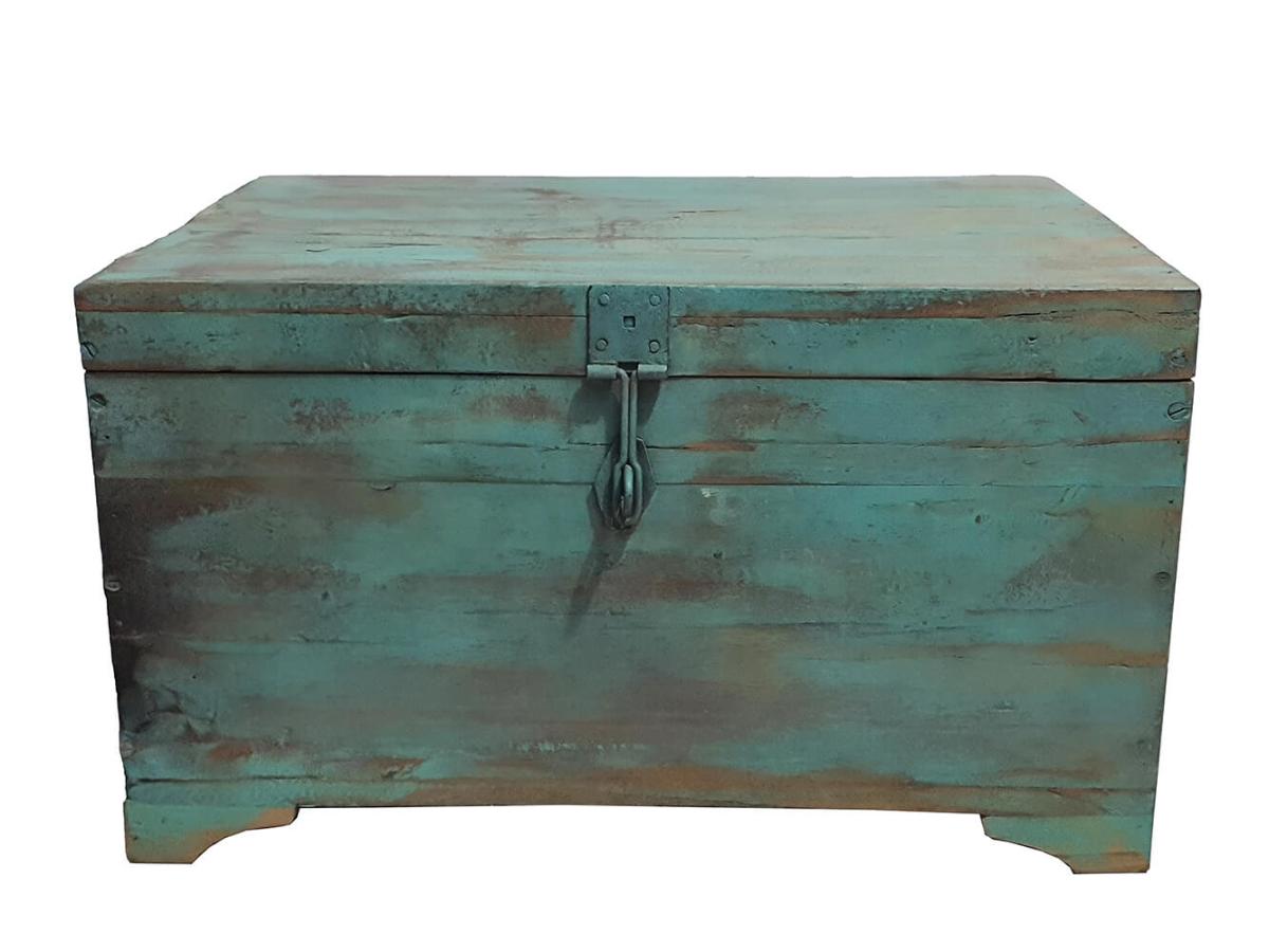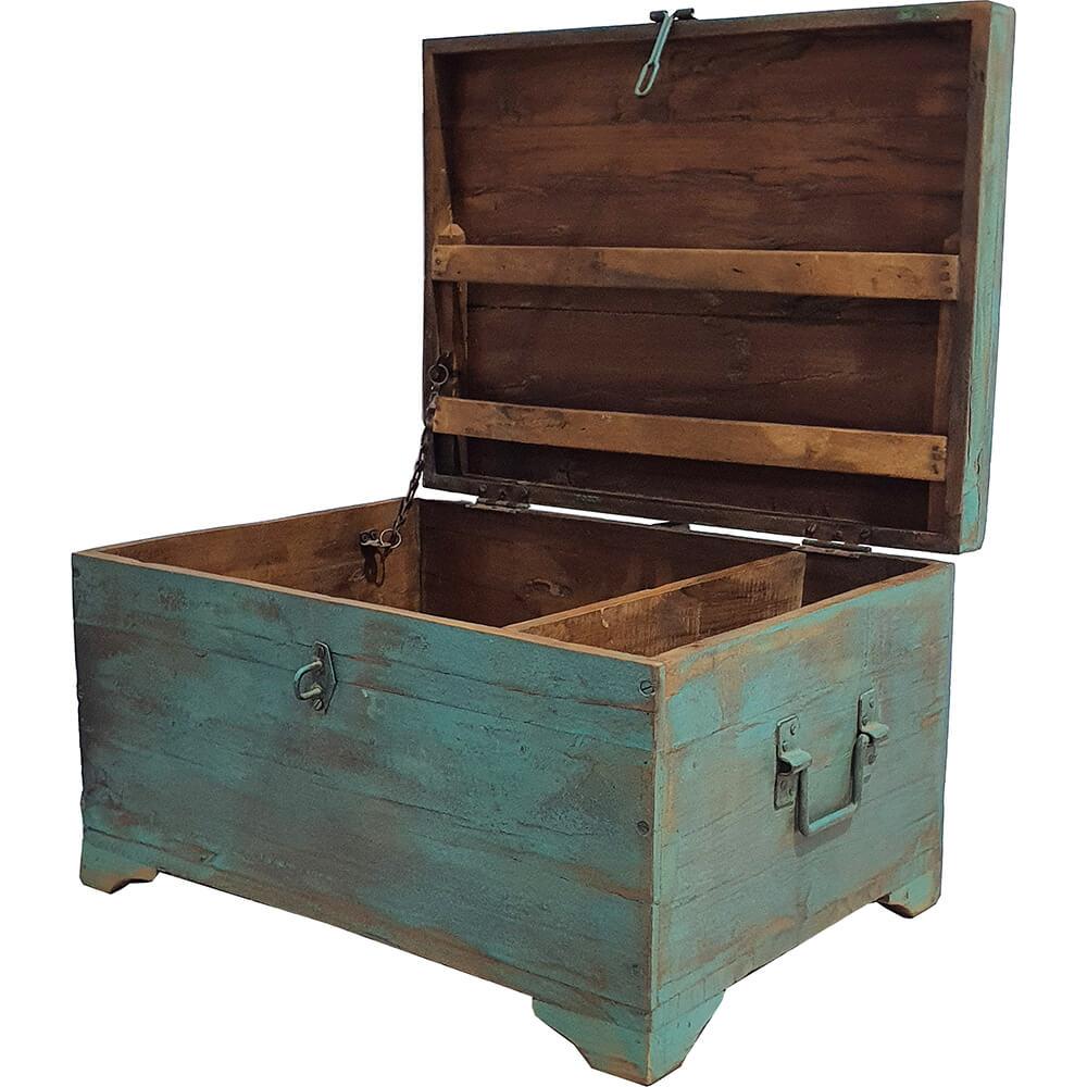 This charming wooden chest has seen its fair share of life and is now ready for a new chapter, complete with lid, handles and practical interior compartments. The worn turquoise-green paint and robust wood with visible signs of use give the chest a raw and honest look. Inside, the chest is divided into several compartments, making it easy to organise everything from books and textiles to toys or creative odds and ends. The lid closes with a simple, functional latch, and the sturdy handles on the sides make it easy to move around. Use it for storage, as a coffee table or simply as a decorative piece with lots of personality. A unique find that beautifully combines function, history and charm.