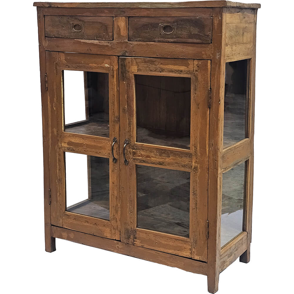 Looking for a new display cabinet? Then this one is truly something special. Made from rustic wood with glass on three sides, it has a light and airy look that fits beautifully into any space. The cabinet features two glass doors and two practical drawers at the top, perfect for storing everything from small treasures and tableware to everyday essentials. The natural wood and visible craftsmanship give it a warm and authentic character, while the side glass panels allow light to flow through and highlight whatever you choose to display inside. A versatile piece that fits just as well in a home as it does in a shop or café.