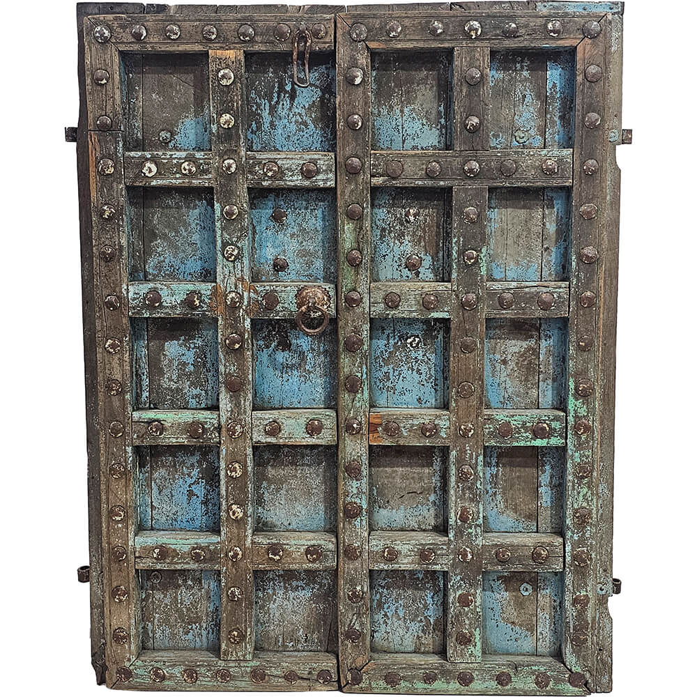 This rustic door is full of character and raw details. The peeling blue paint creates a lively, patinated look in which the wooden surface and traces of time clearly stand out. The many sturdy iron fittings and studs emphasize the door’s solid construction and add a bold, almost industrial expression. The colour play shifts beautifully between blue, grey, and dark wood tones, making the door a natural focal point in any space. It works perfectly as a decorative wall element or as a creative reuse in your home, shop, or café. A door with plenty of personality that adds warmth, edge, and history to the interior, and easily becomes the first thing people notice.