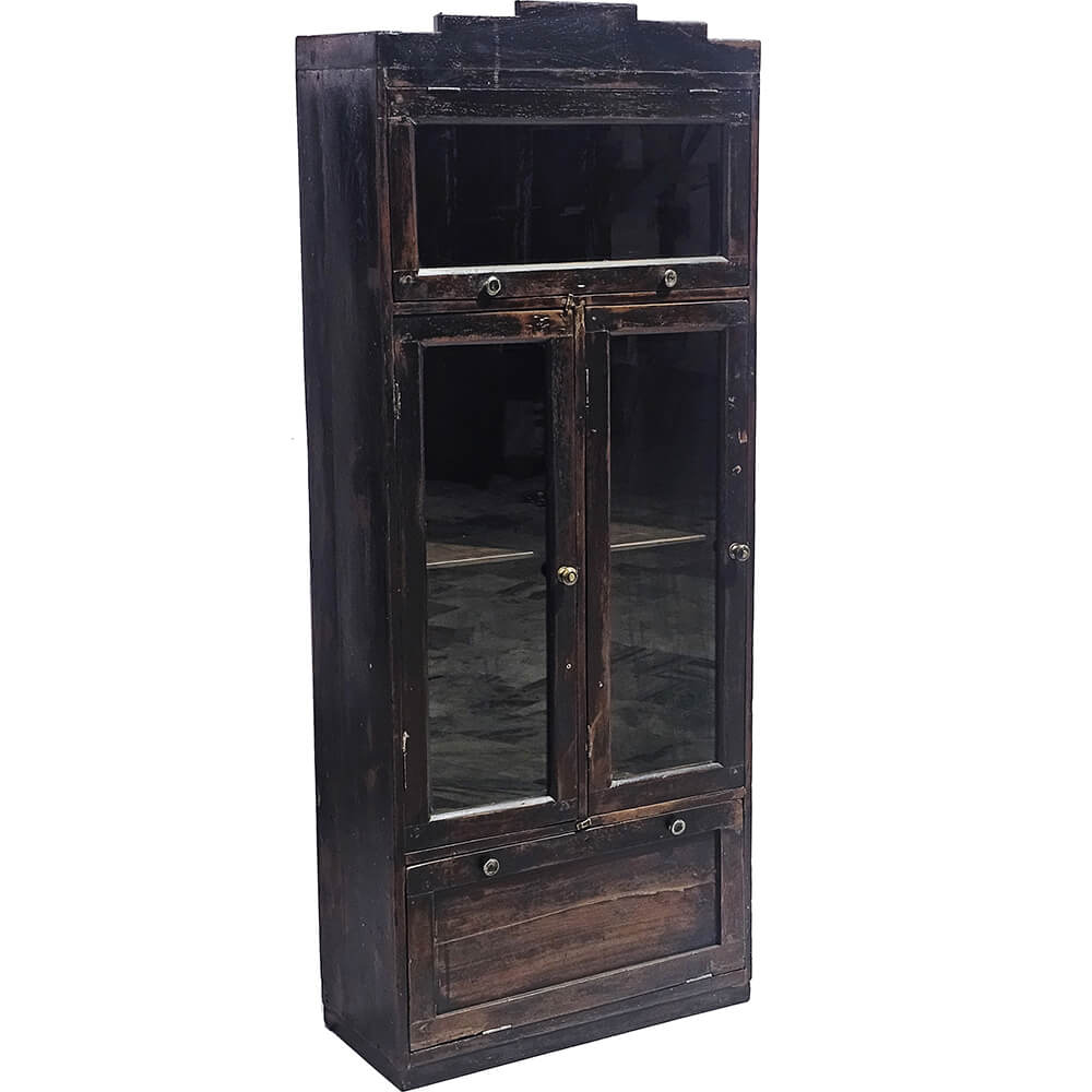Here’s a charming cabinet full of personality and depth. The dark brown wood and naturally aged surface give it a warm and calming presence. The cabinet is divided into three sections, a top glass door, two middle doors with glass panels, and a solid lower door, offering both variety and functionality. It’s a piece that invites everyday use. Show off your treasures behind the upper doors and keep the practical things tucked away below. The small metal handles add to the rustic feel without stealing the spotlight. A quiet statement piece that brings character and calm to any living room, dining area, or hallway.