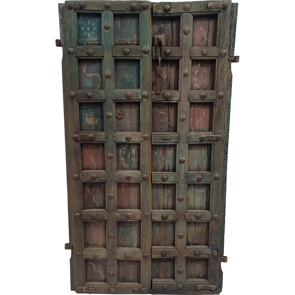 This old wooden door is a striking and atmospheric piece of craftsmanship with plenty of soul. The door is built from heavy wooden planks, divided into a panelled structure and assembled with many original iron studs, giving it a solid and authentic expression. The surface of the wood shows clear signs of time, with beautiful colour nuances in muted green, brown, and grey tones, where the original paint has gradually worn away, adding depth and character. The rustic iron fittings, the old locking mechanism, and the small iron details underline the door’s history and high level of craftsmanship. Every irregularity, crack, and patinated surface tells the story of many years of use and makes the door completely unique. Today, the door works perfectly as a decorative focal point in the interior, whether used as wall décor, a room divider, or as a raw and atmospheric element in private homes, shops, or cafés.