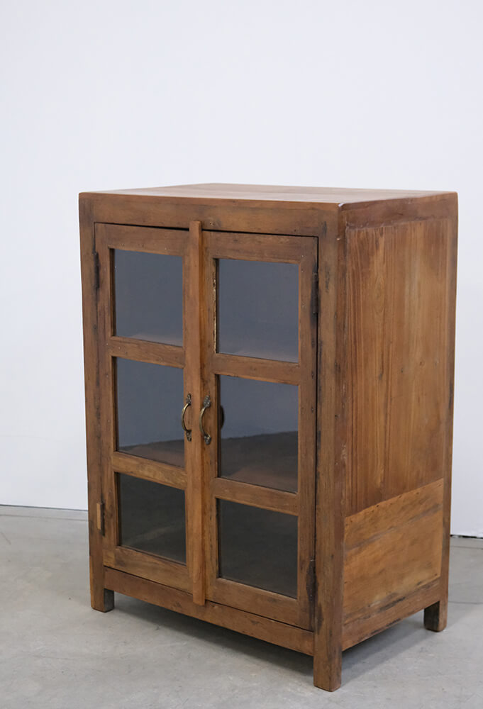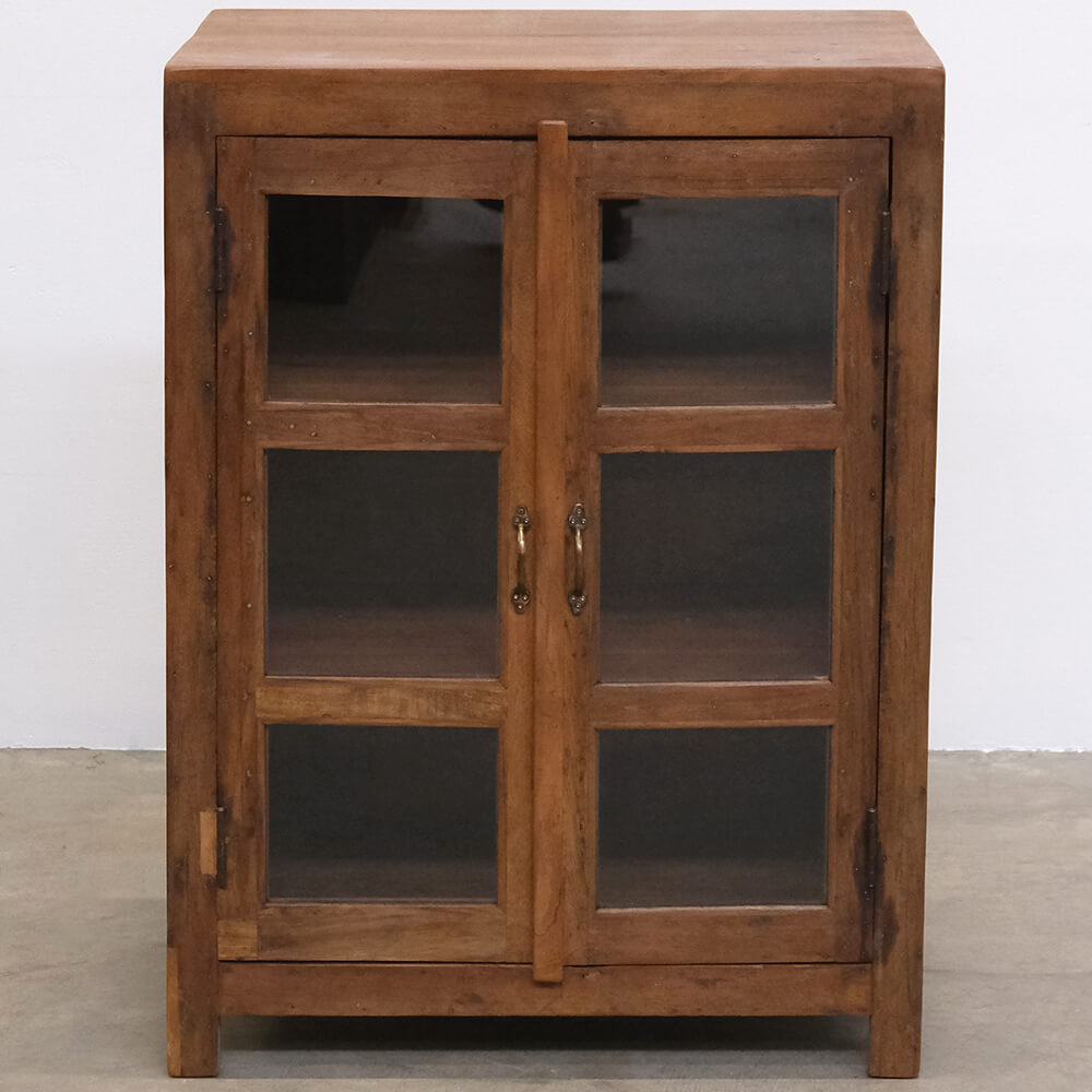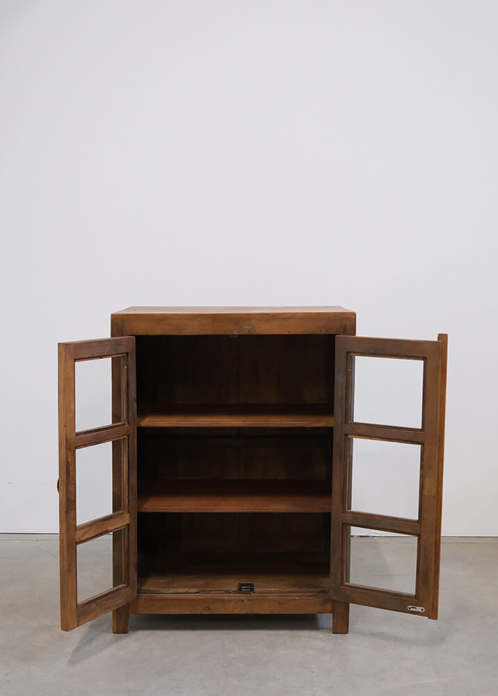This display cabinet with two shelves and two glass doors is a classic and timeless piece of furniture made from solid wood with a warm, natural look. The wood surface shows patina and visible grain patterns, which give the cabinet character and a calm, authentic appearance. The two glass doors let light in and make it easy to display the contents, while also protecting them from dust. Inside, the cabinet is fitted with two shelves, providing ample space for storage and display of glassware, porcelain, books, or decorative objects. The simple metal handles support the classic design without drawing attention away from the natural beauty of the wood. The display cabinet fits beautifully into the kitchen, living room, or dining room and can easily be combined with both modern and more rustic interiors. A functional piece of furniture with plenty of charm.