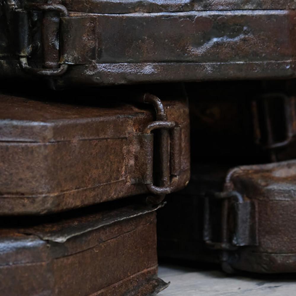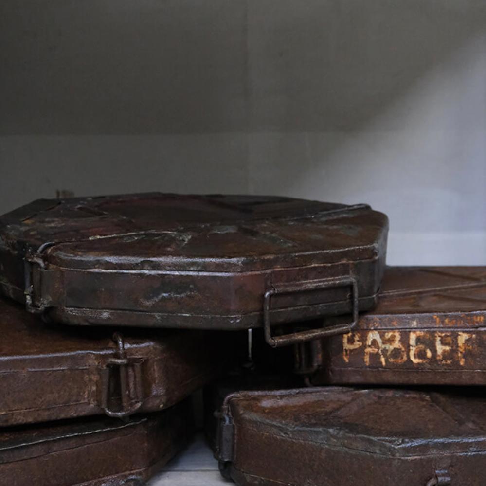 Immerse yourself in the world of cinematic history with these authentic Indian vintage film reel cases. These cases have housed film reels from the golden era of Bollywood and are now ready to add a touch of history and charm to your decor. The solid iron cases were designed to protect fragile film reels. If you don't have any to store, they can also be repurposed for storing other items, or used as a distinctive and decorative piece in your interior.