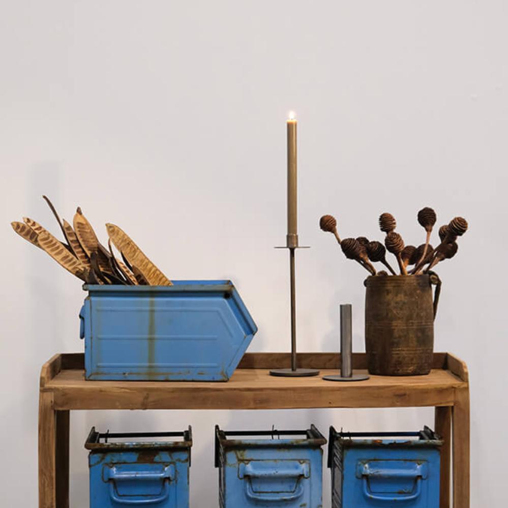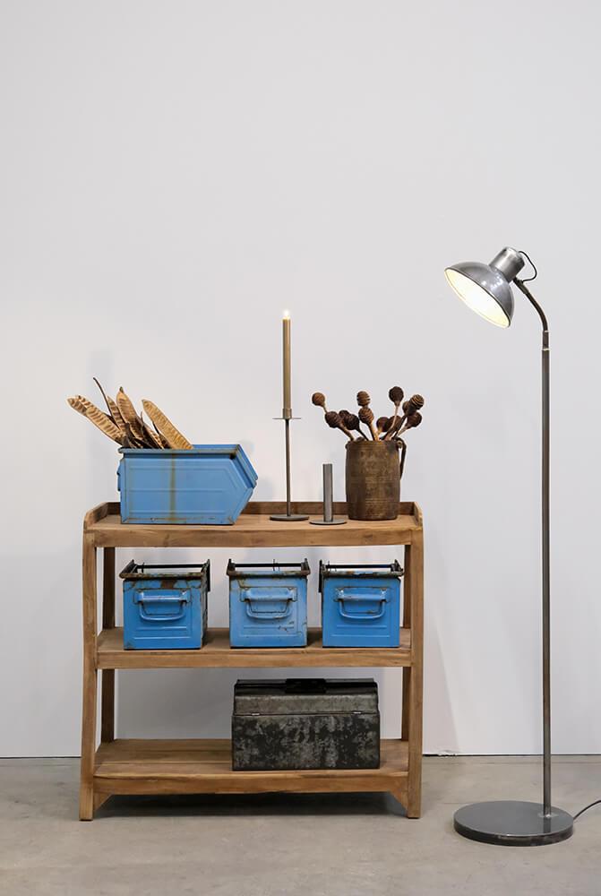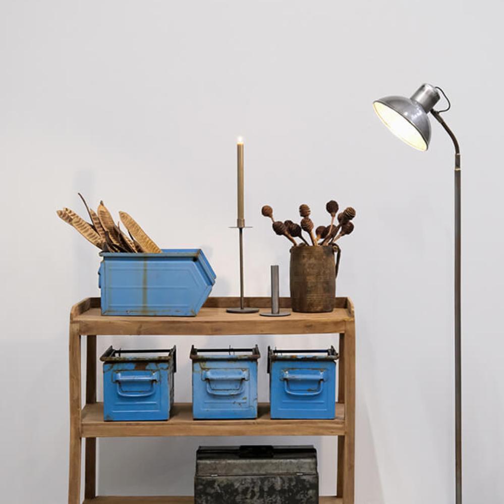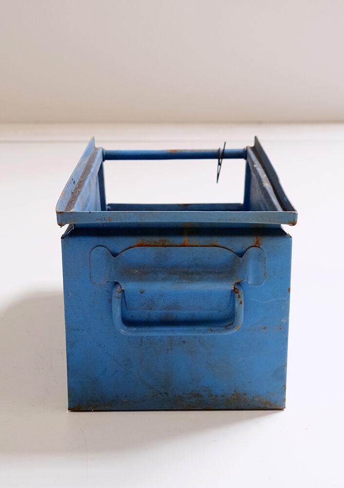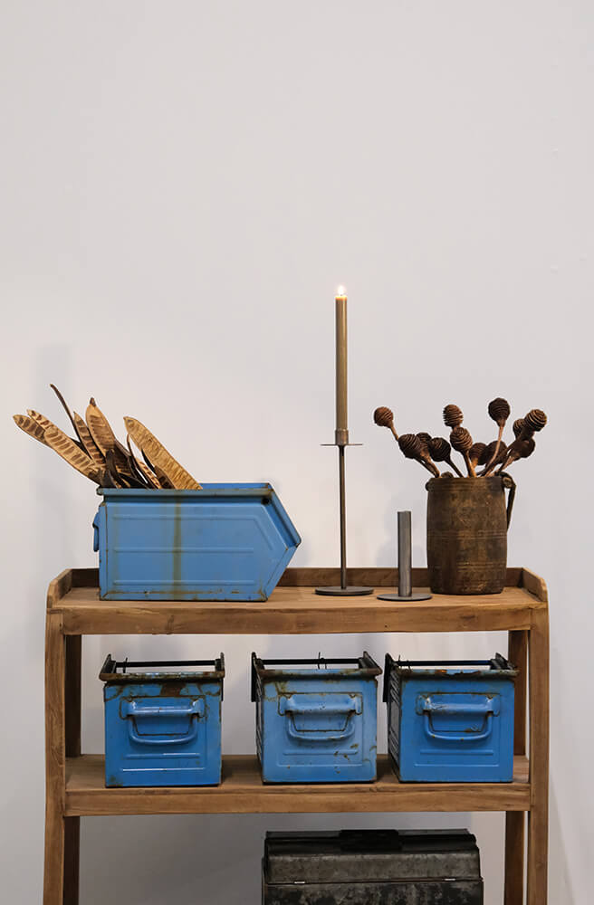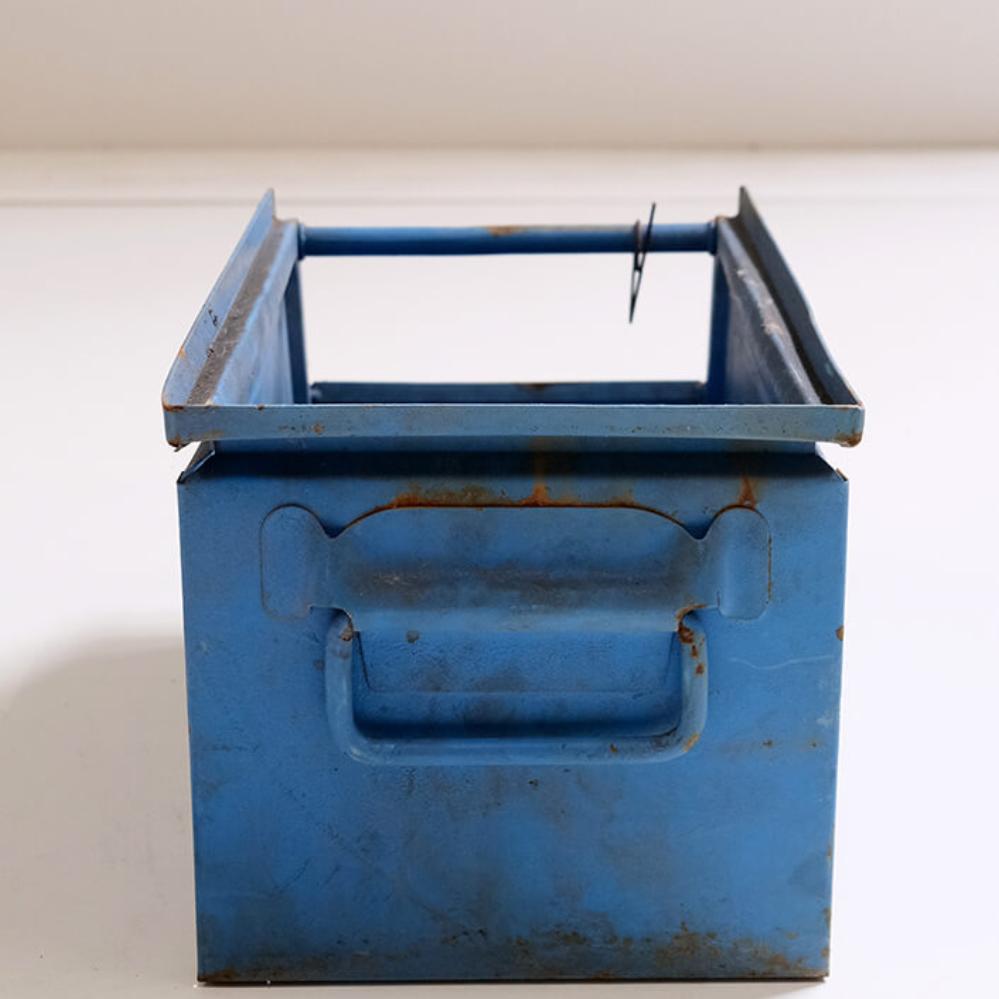 These old blue metal boxes exude industrial charm and raw patina. They were once used in workshop environments, and it shows in all the right ways, with small traces of wear that tell stories of many years of use. The sturdy boxes are not only practical but also decorative. Use them in the kitchen for spices and bottles, in the workshop for screws and tools, or in the living room for magazines and small items. They also work perfectly in a shop or café, where they can be used to present products in a cool and unique way. Each box is unique in its appearance, with slight variations in color tones and patina. That’s exactly what gives them their charm. A beautiful combination of functionality, nostalgia, and raw industrial style that adds character to any interior.