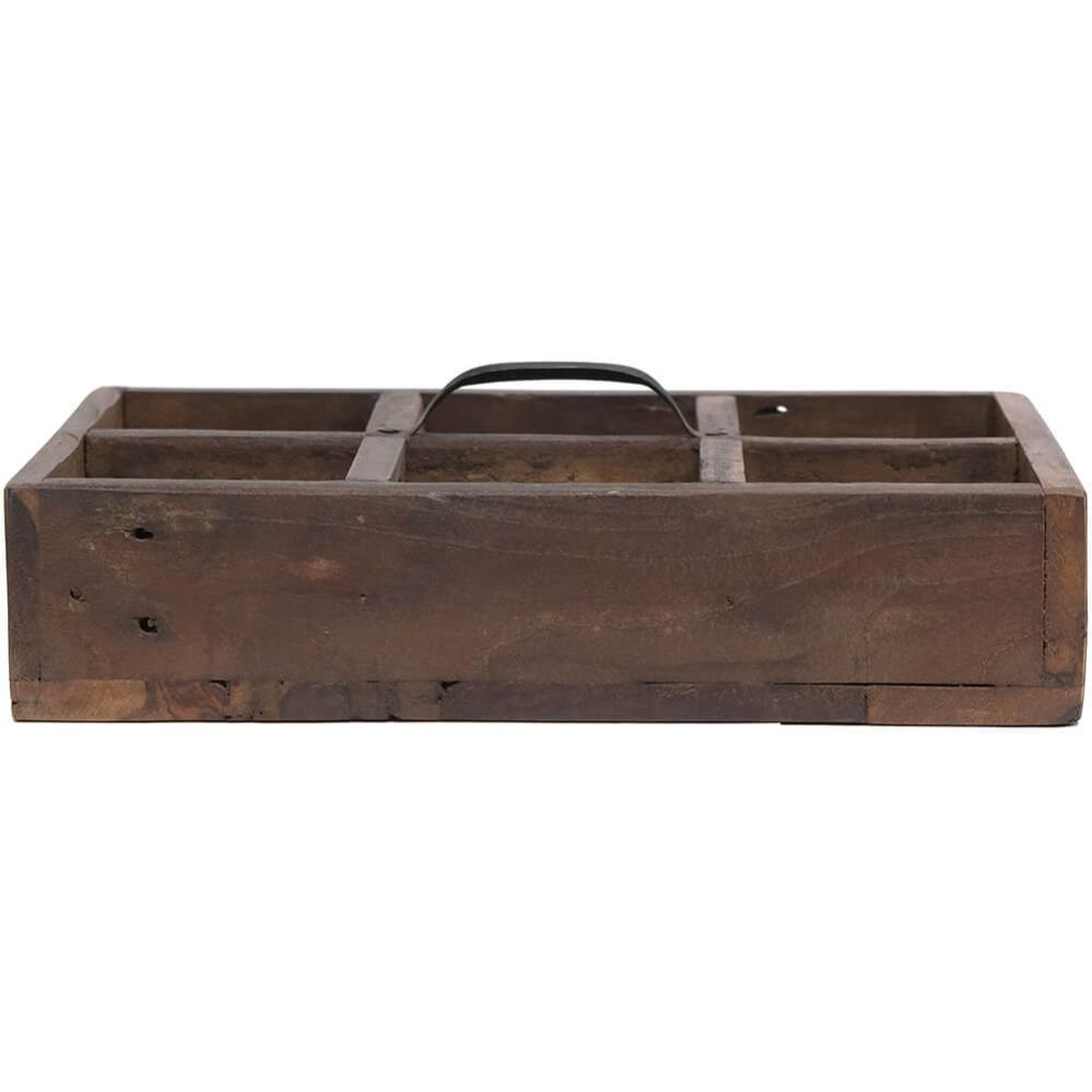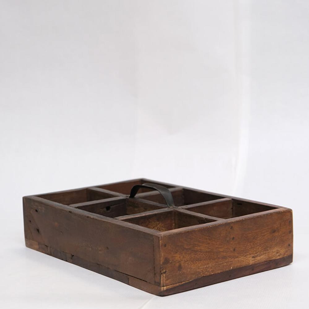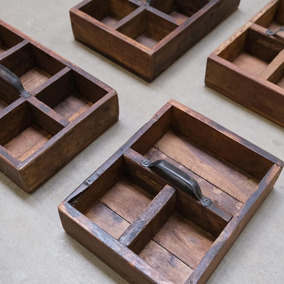 These wooden boxes with handles offer raw storage with quirky charm. Made from reclaimed wood, they are full of scratches, color variations, and small imperfections that only true craftsmanship and a previous life can bring. Each box is equipped with a sturdy metal handle and divided into either 3 or 6 compartments, making it easy to keep small items organized in style. Widths vary from 21 to 32 cm, and just like good friends, no two boxes are exactly alike. The imperfections are part of the charm. Use the box in your café or restaurant for cutlery, napkins, or spices. Or at home for hobby supplies, oils, or as rustic decoration on shelves and tables. A storage box that adds both function and edge to any interior.