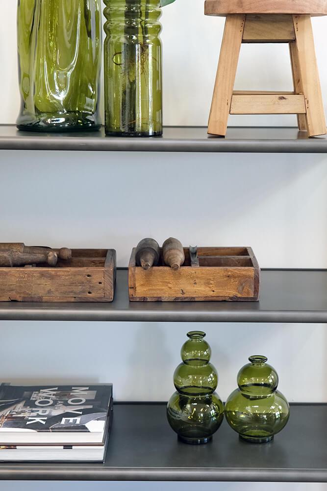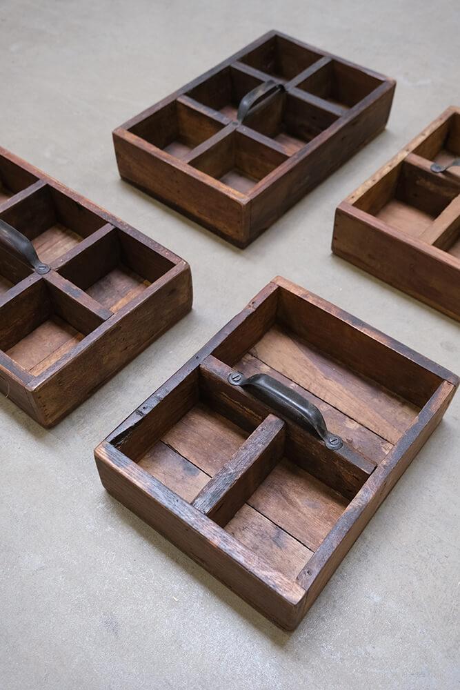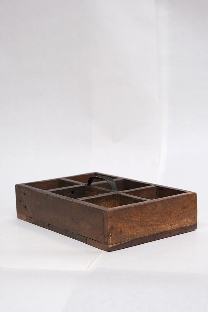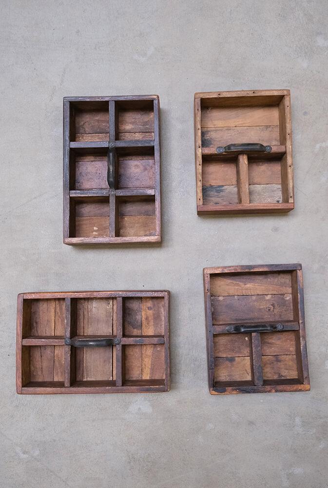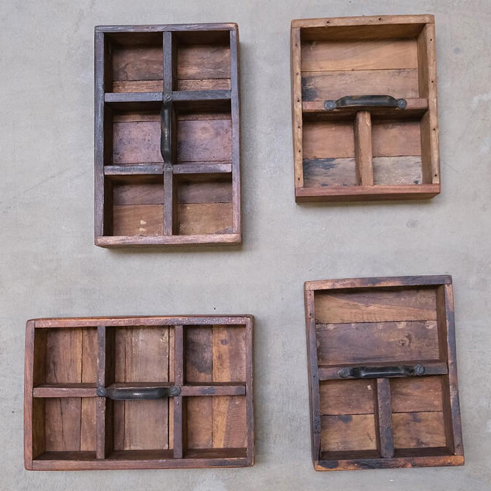 These wooden boxes with handles offer raw storage with quirky charm. Made from reclaimed wood, they are full of scratches, color variations, and small imperfections that only true craftsmanship and a previous life can bring. Each box is equipped with a sturdy metal handle and divided into either 3 or 6 compartments, making it easy to keep small items organized in style. Widths vary from 21 to 32 cm, and just like good friends, no two boxes are exactly alike. The imperfections are part of the charm. Use the box in your café or restaurant for cutlery, napkins, or spices. Or at home for hobby supplies, oils, or as rustic decoration on shelves and tables. A storage box that adds both function and edge to any interior.