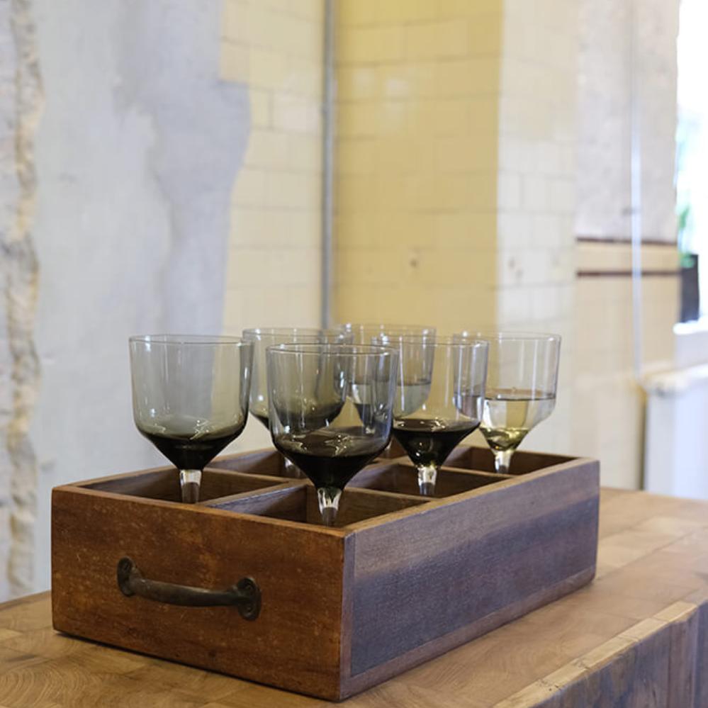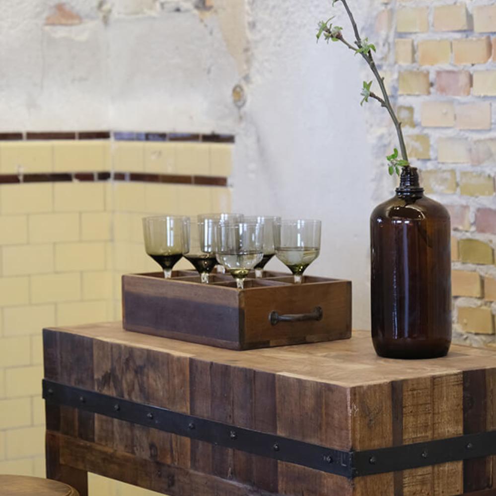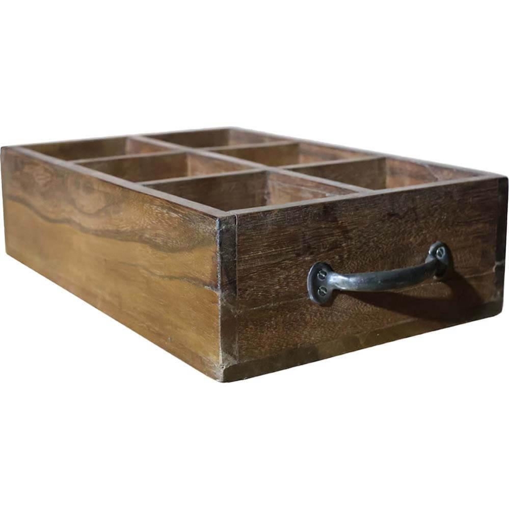 This sturdy wooden box with six practical compartments and two metal handles is both functional and decorative. Made from reclaimed wood, it features a natural patina and an authentic, rustic look. The box is perfect for storing small items, oils, or office supplies and can be easily moved around thanks to the handles. Each compartment provides excellent organisation while adding a touch of raw charm to your decor, whether in the kitchen, office, or restaurant.