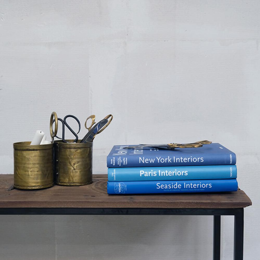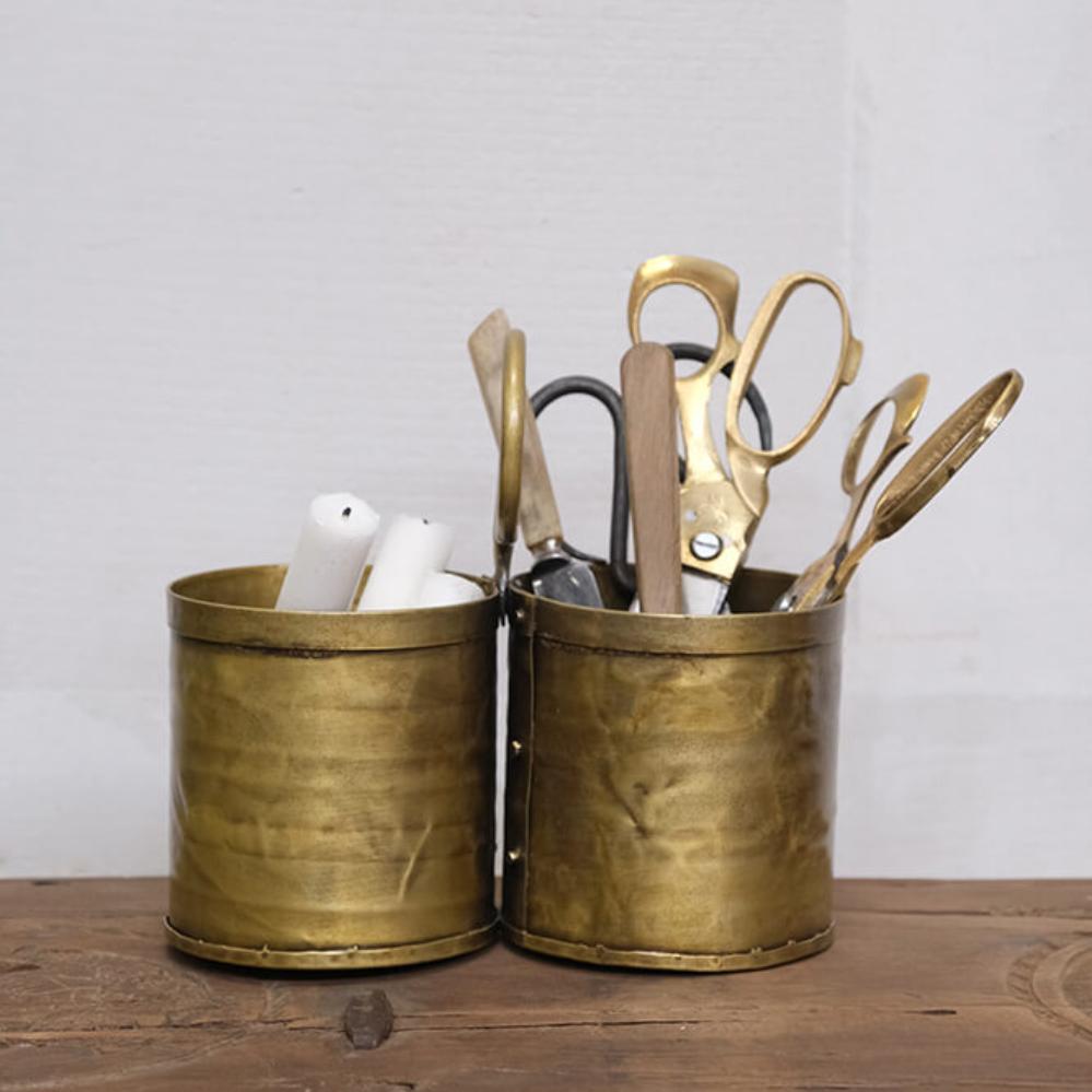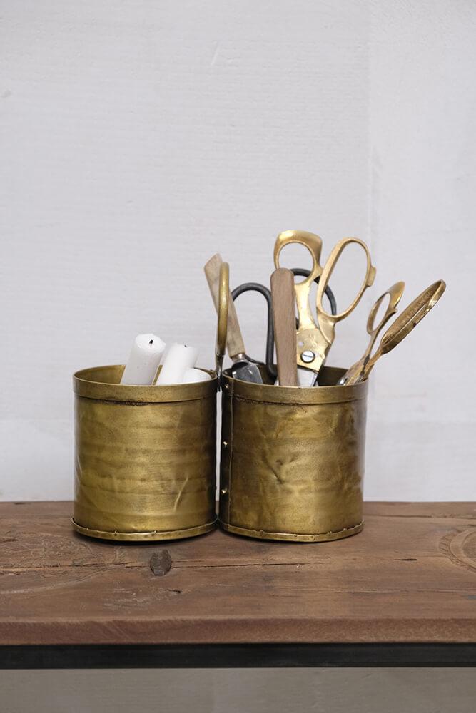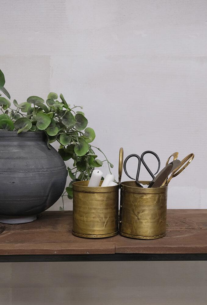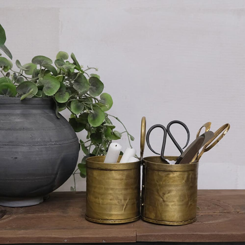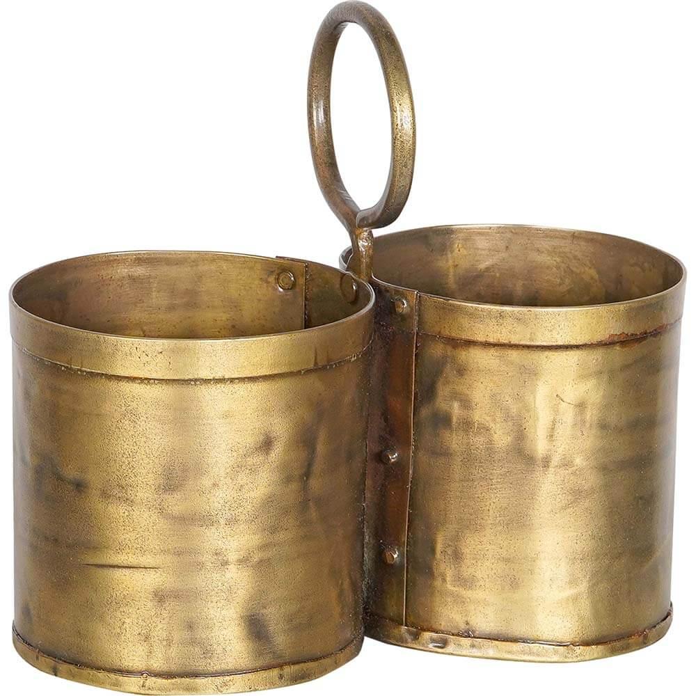 This charming cutlery holder with a brass finish combines functionality with edgy style. The two compartments are perfect for organizing cutlery or kitchen utensils, while the practical ring handle makes it easy to move around. The handcrafted look and warm brass finish add a touch of vintage style, making it perfect for both rustic and modern interiors. Use it on the dining table, kitchen counter, or as a decorative storage solution for office supplies or small plants. A versatile and stylish addition to any room. Each container itself is 11 cm high.