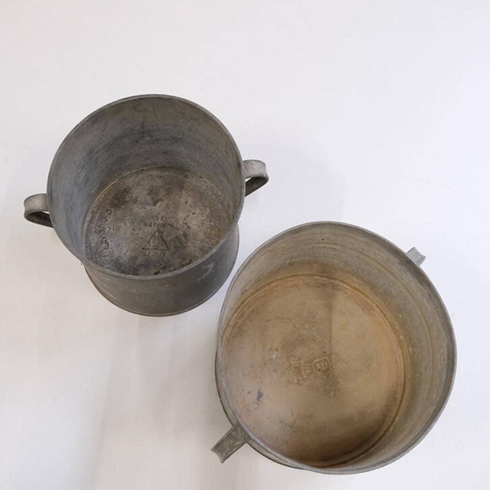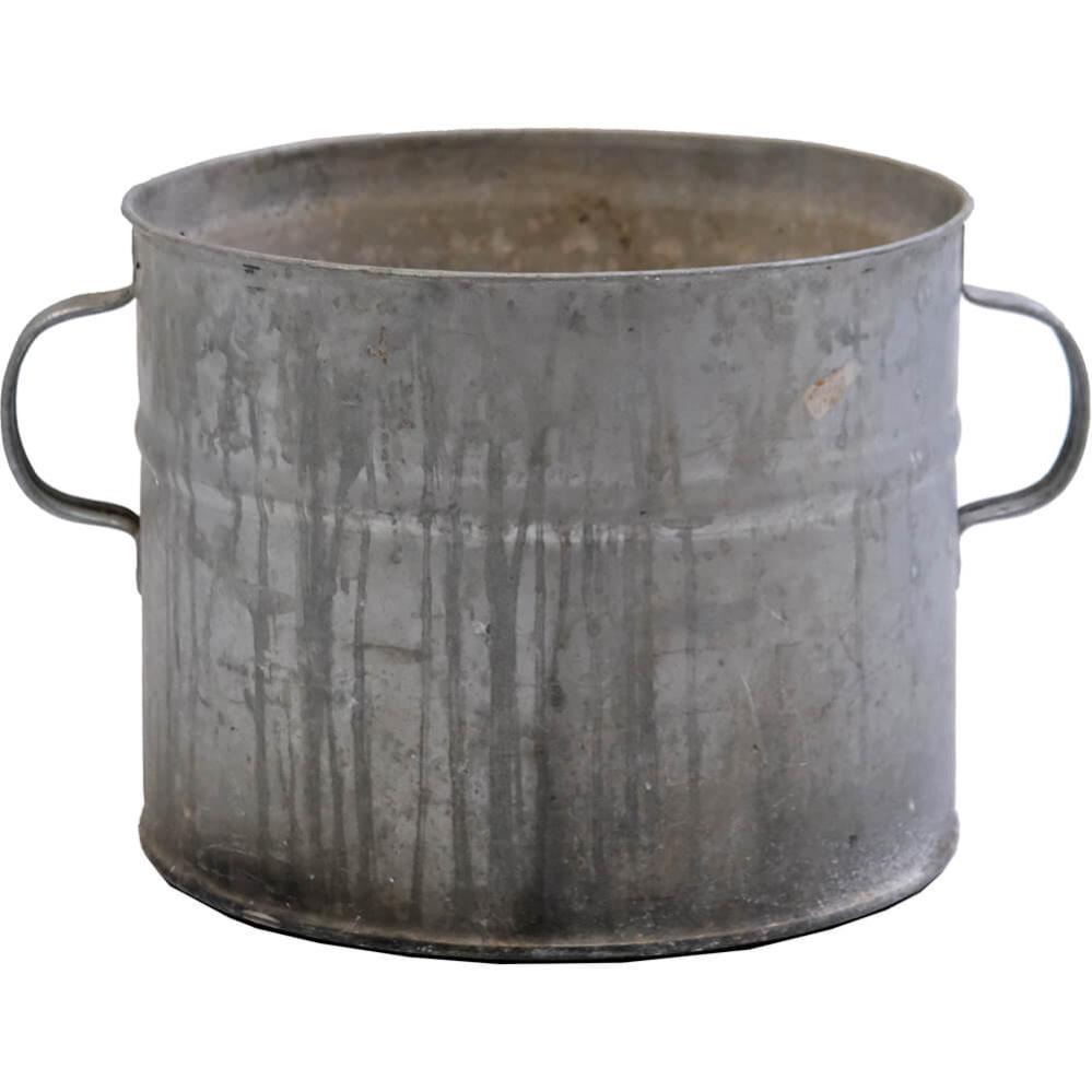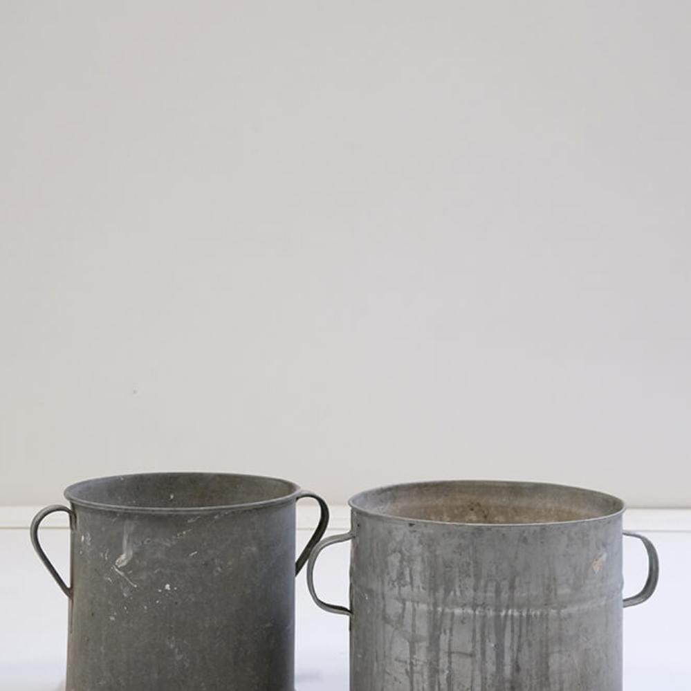 Charming old zinc buckets with practical side handles that make them easy to move. The buckets vary slightly in height, width, and appearance, and it is precisely these small differences that give them their special character. The raw surfaces with beautiful traces of use and patina tell a story of time and wear, making them perfect as decorative elements. Use them as plant pots, for trash cans, for storage, or in shop interiors, where they bring an authentic, industrial vibe.