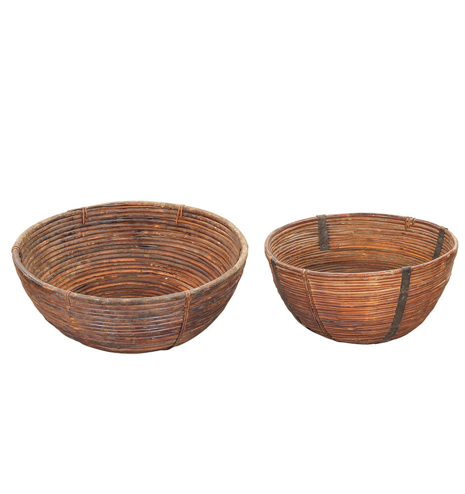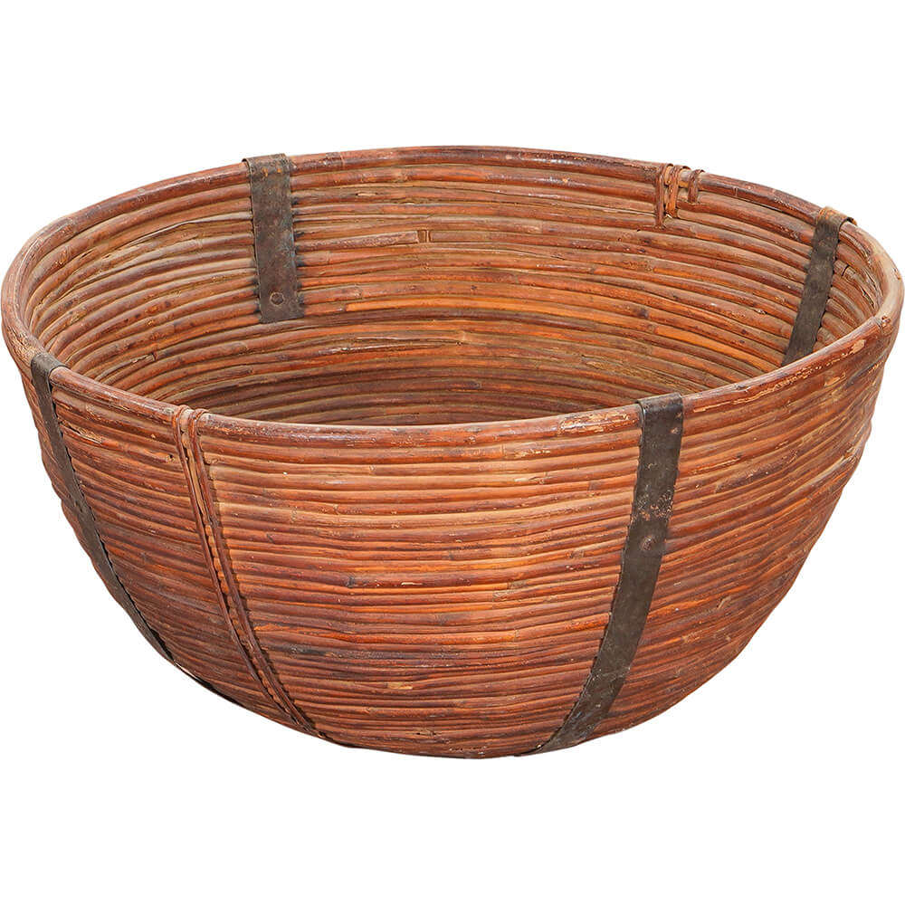 This bamboo basket is not trying to be perfect. It was found in India and clearly shows signs of a life in use. The bamboo is slightly uneven and full of small variations that make each basket a little different. The dark metal bands hold everything together, like a belt that has been wrapped around it for years. And it works. Use it as a large fruit bowl on the kitchen counter. Not for the perfect, polished apples, but for lemons, onions, garlic, and everything that is allowed to be a bit messy. It adds weight and calm to otherwise everyday items. Or place it in the bathroom with rolled-up towels. It works surprisingly well, like taking something very practical and giving it a bit of edge. It can do more than just hide clutter. It can also be the piece that brings a room together. You will not get two that are the same. And that is exactly the point.