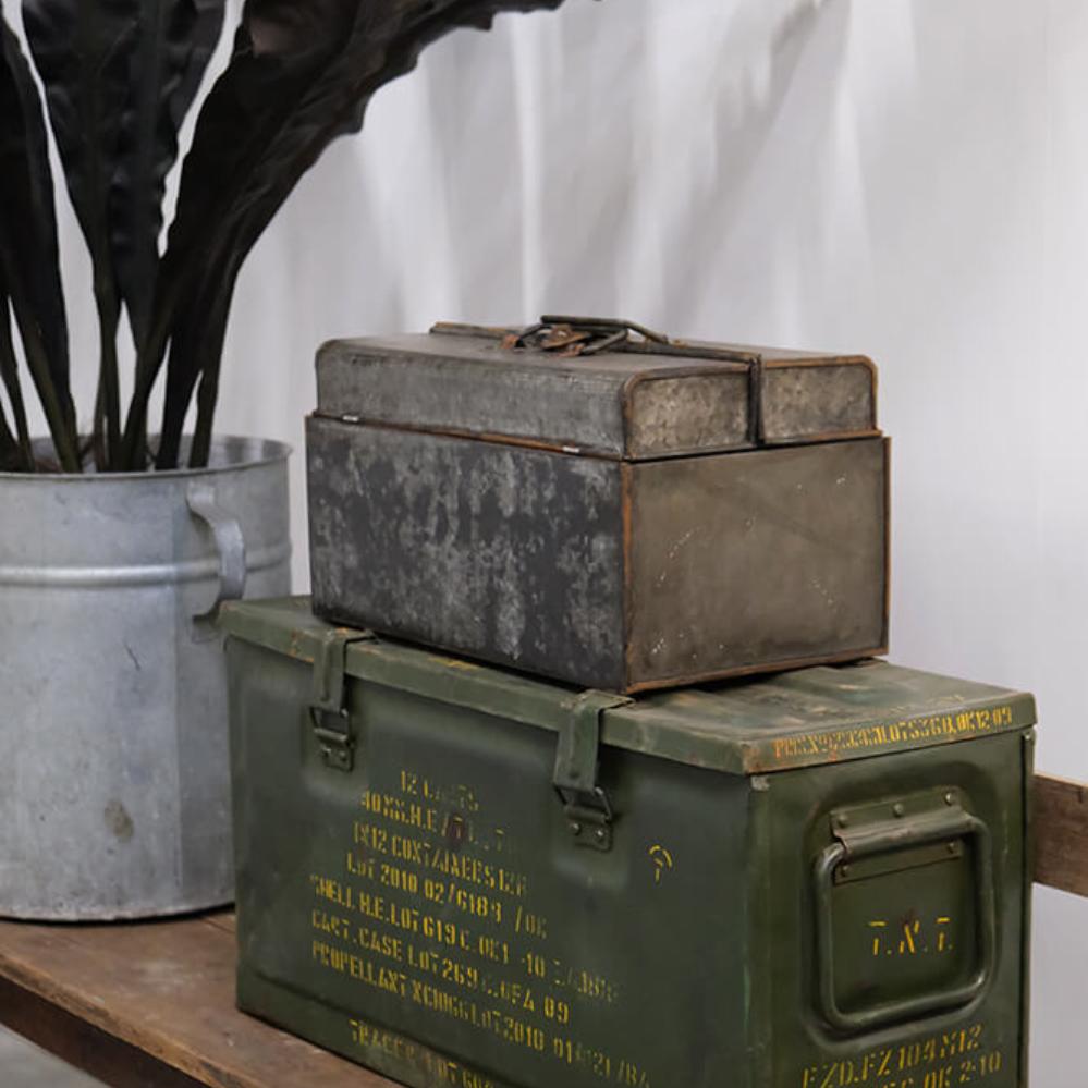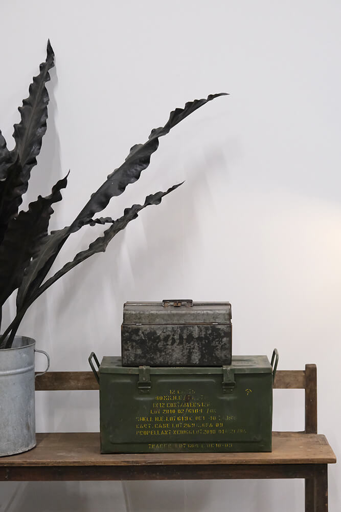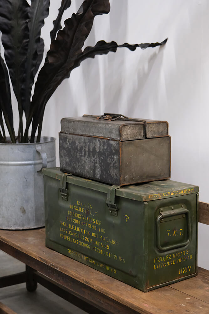 Rustic, raw, and with a story to tell. This original military box in solid, patinated iron has been through a lot – and it shows in all the right ways. The deep green color, distinctive yellow markings, and sturdy locking clasps give it an authentic industrial charm. Use it as a raw storage solution in a shop, a cool side table in a lounge, or even as a statement piece in a bar or restaurant. Its practical size makes it easy to place, while the solid metal construction ensures durability. A cool box with plenty of authenticity and edge.