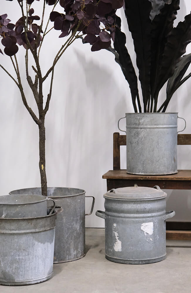 Beautiful tall zinc buckets with classic side handles. The design is simple and industrial, but small variations in shape, surface, and patina ensure that each bucket has its own unique charm. They can be used in many ways, such as rustic plant pots on the terrace, for storing firewood or newspapers, for trash cans, or as decorative elements in a shop or café, where they add an authentic vintage feel. The sturdy handles make them easy to move around wherever you want to place them.
