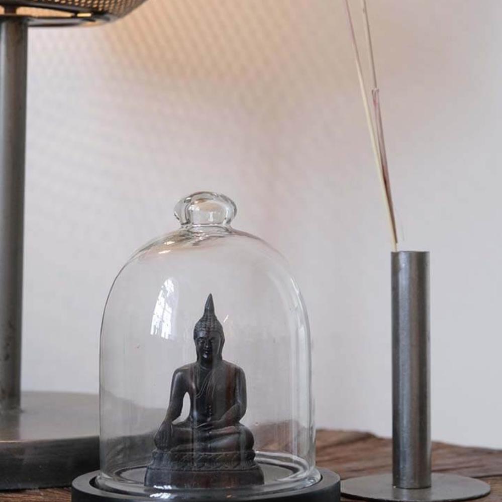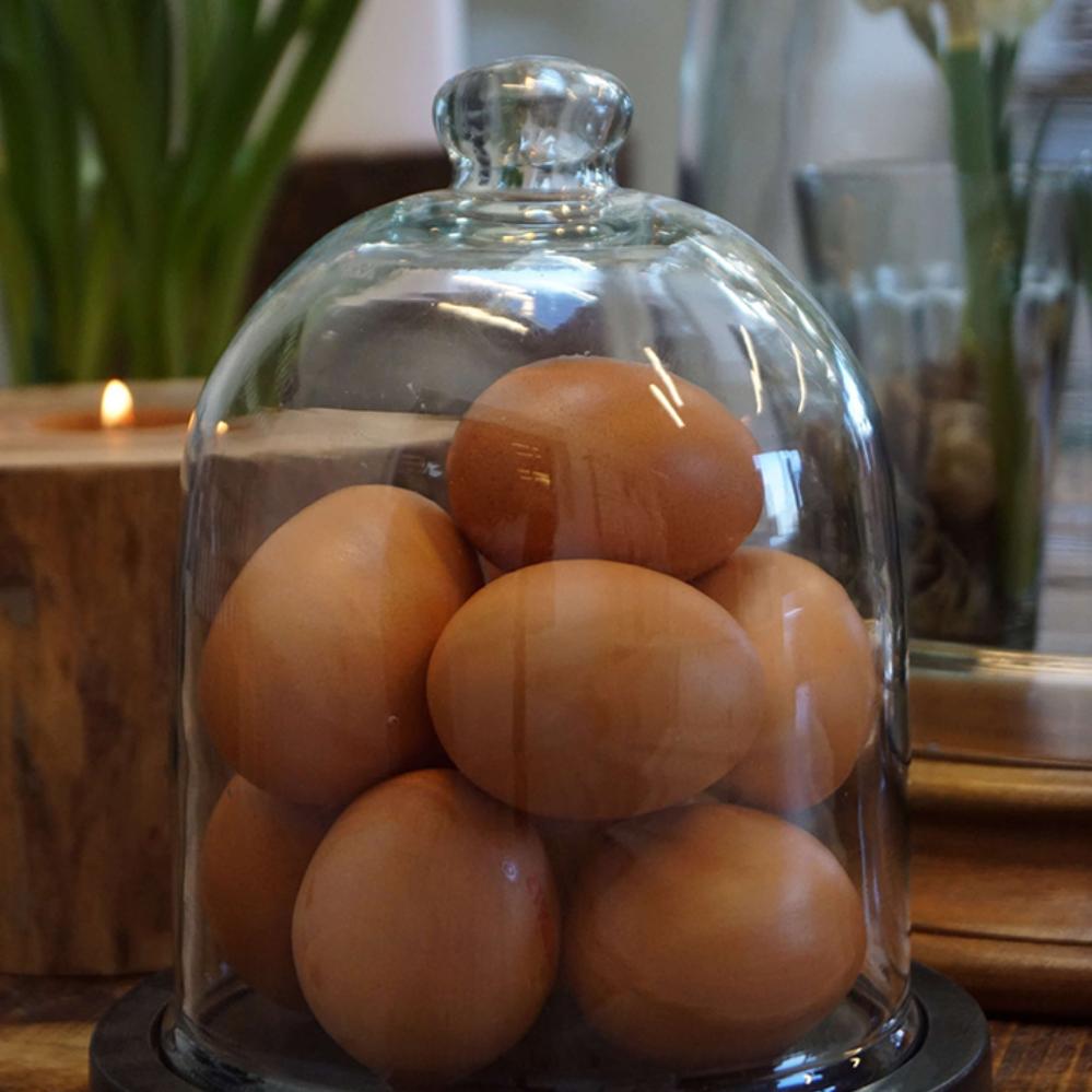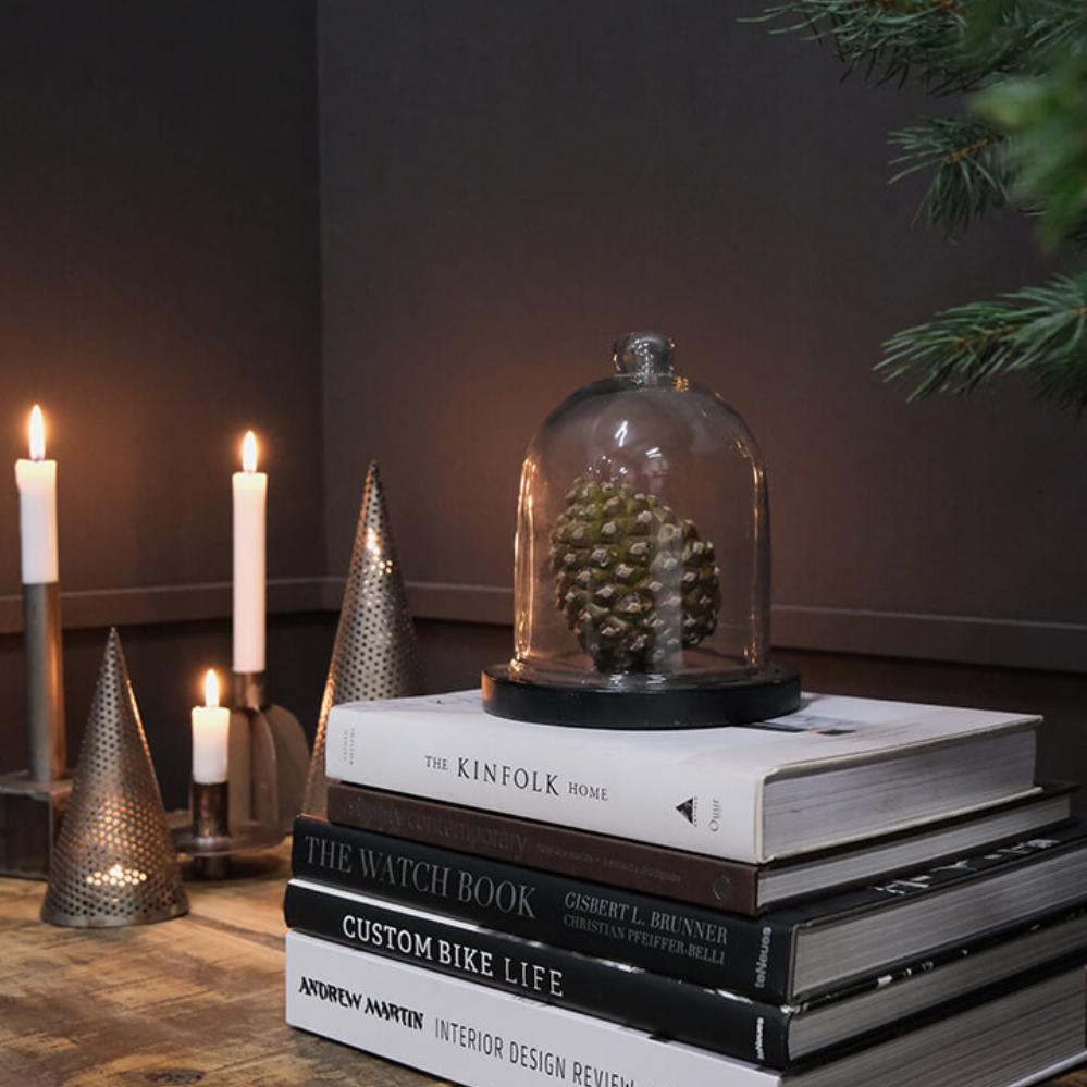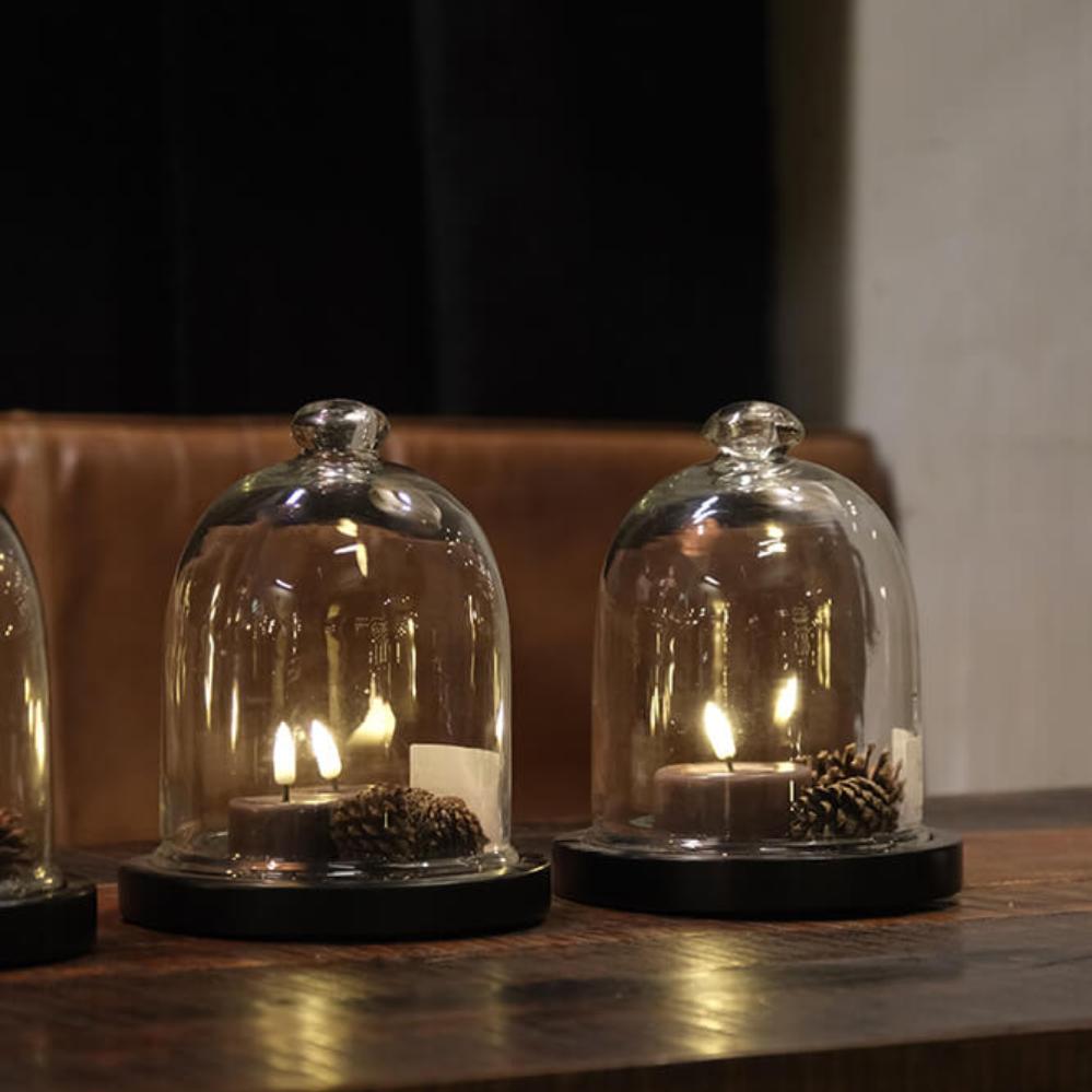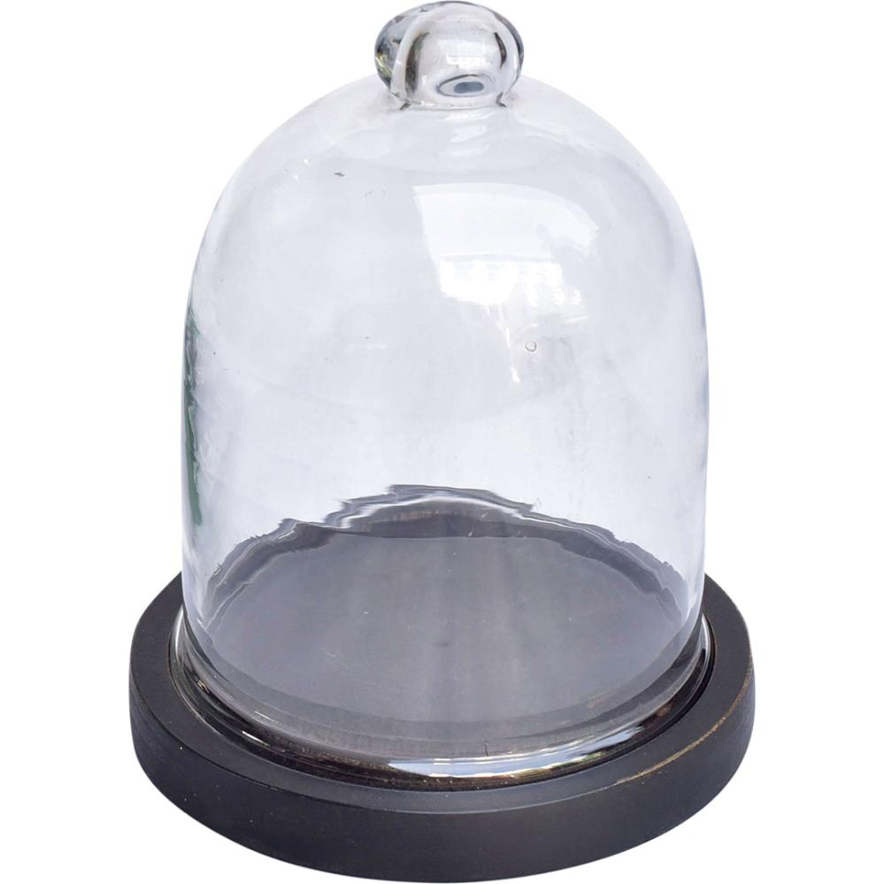 Fine and decorative glass dome with a black-painted wooden base. It is perfect for highlighting your favorite items in a simple and stylish way. Use it to display small artworks, jewelry, a string of lights, or other personal treasures that deserve a little extra attention. The glass dome can also easily be decorated according to the season, fill it with fir branches and ornaments for Christmas or with small Easter eggs and spring flowers for Easter. Whatever you choose to place under the dome, it will create a cozy and personal atmosphere in your home or shop.