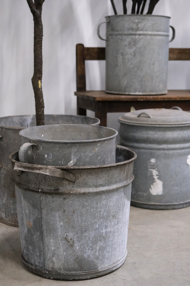 These old zinc buckets are full of patina and history. They feature the characteristic side handles that make them easy to move, and they vary slightly in size and shape, giving them a lively and authentic look. Use them as raw decorative elements, for trash cans, for plants, for storage, or as part of a shop display where they add an industrial vintage touch. Each bucket has its own character, but together they create a harmonious look.