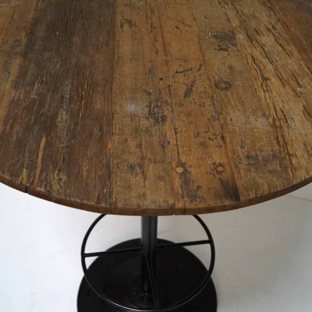 High round coffee table with rustic reclaimed wooden worktop and dark iron base with footrest. With this high coffee table and our wide selection of bar stools you can create a super cool and atmospheric environment.