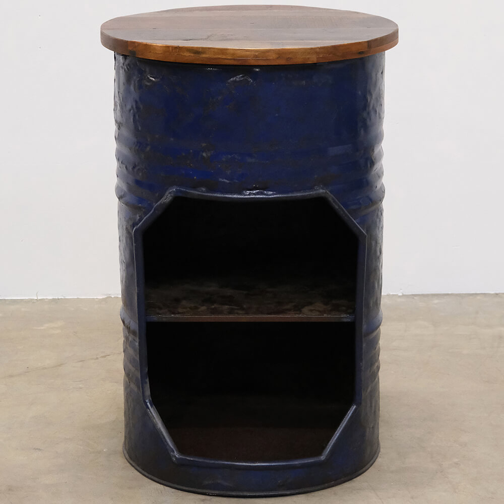 This bar table is created from an old barrel combined with a solid round wooden tabletop, giving it a raw and characterful expression. The barrel’s original surface and clear signs of previous use make each table completely unique and add plenty of personality to the space. The wooden tabletop creates a warm contrast to the metal and provides a solid, practical surface for serving. Inside the barrel, there is a practical shelf that can be used for storing bottles, glasses, or other bar essentials, allowing function and aesthetics to go hand in hand. The bar table is ideal for a home bar, showroom, café, or as a distinctive feature in a shop interior. A striking piece of furniture for those who appreciate reuse, craftsmanship, and furniture with history.