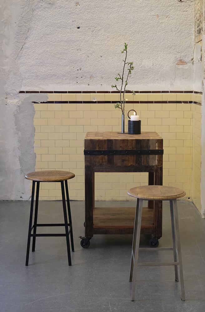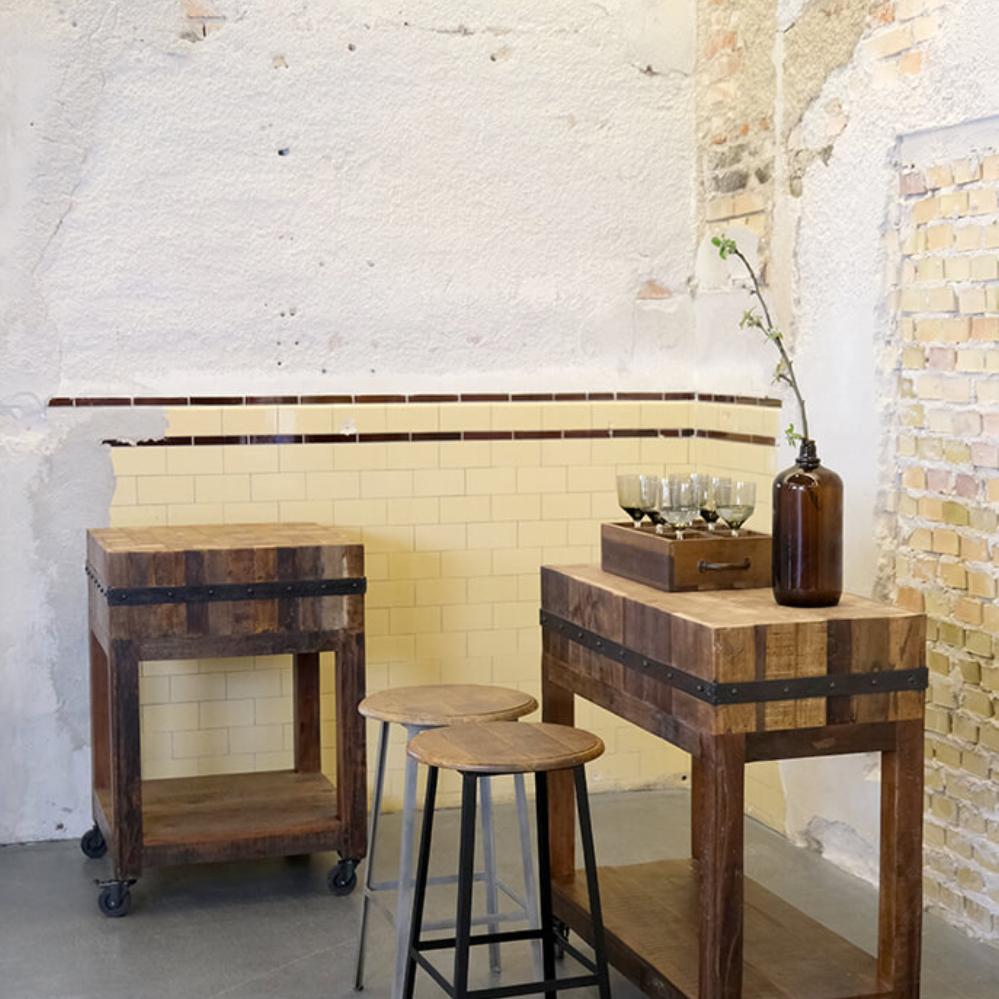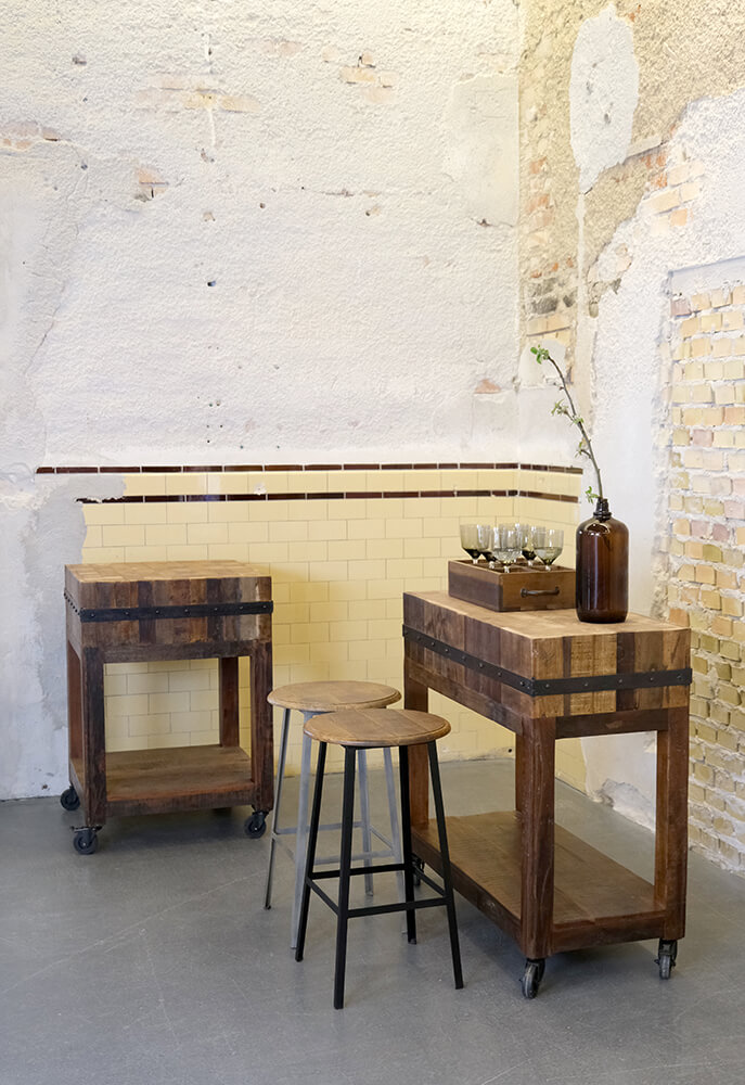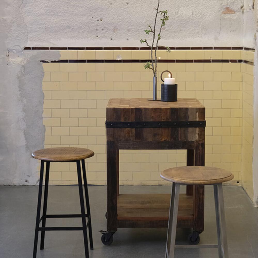This butcher block is built to last. With its solid dimensions and sturdy reclaimed wood, it radiates raw charm and industrial craftsmanship. The dark wood is full of texture, history, and patina – and the black metal frame with rivets adds the perfect rustic touch. Made from reclaimed wood, each butcher block is one of a kind. Scratches, color variations, and small marks all tell the story of a previous life – and only make the piece more authentic. Perfect for restaurants, bars, and cafés where both edge and function are essential. Or as a kitchen island or side table in a private home with a love for raw materials and industrial style. The practical wheels make it easy to move around, and the shelf underneath gives you space for everything from pots to glassware. A classic and timeless furniture type – now in a refreshed, recycled version. Psst… the butcher block is also available in a matching larger version (SG06080).