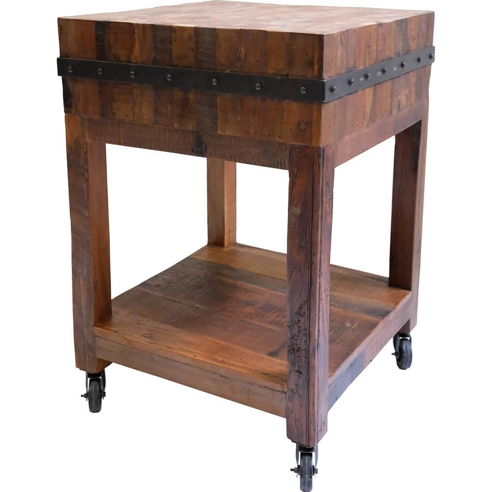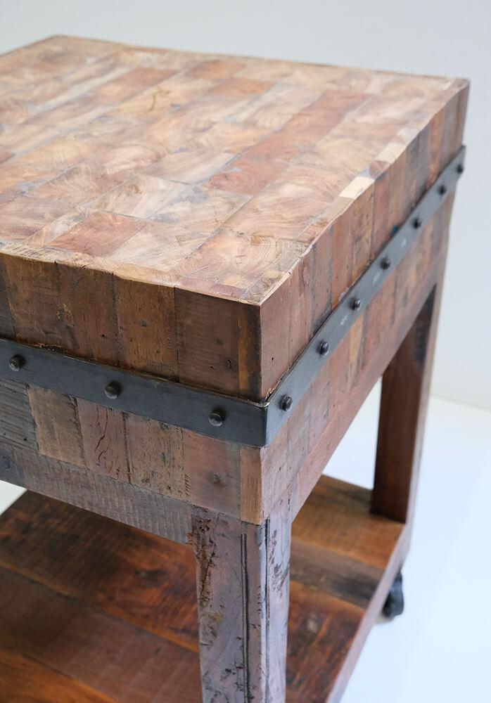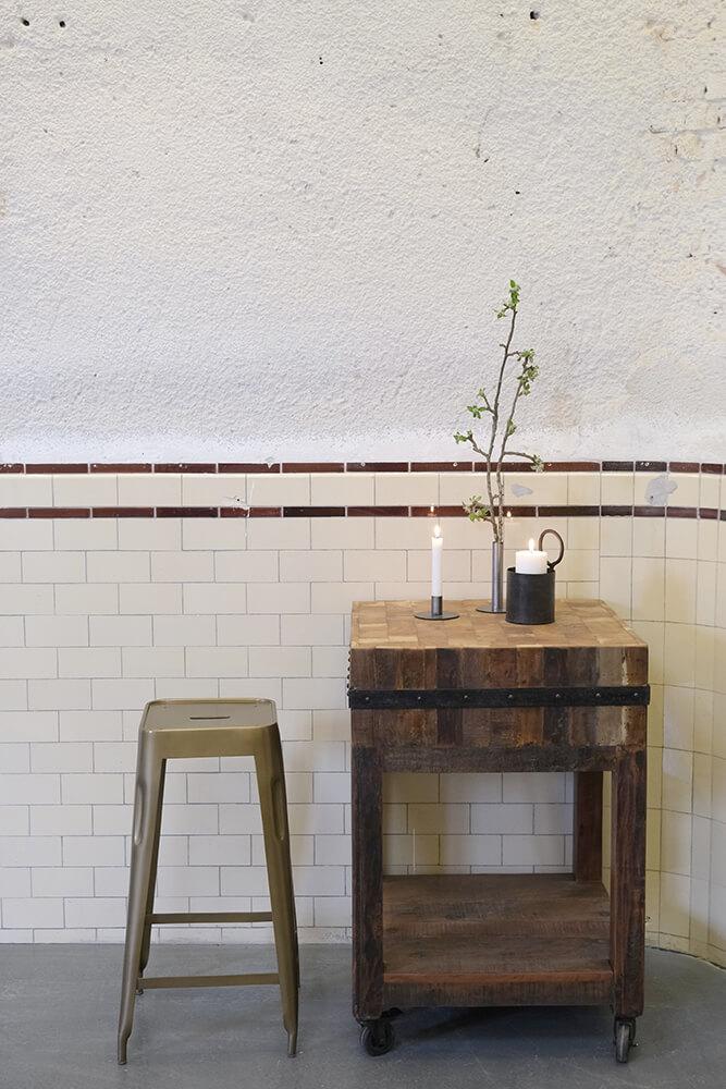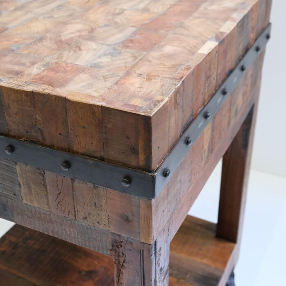 This butcher block is built to last. With its solid dimensions and sturdy reclaimed wood, it radiates raw charm and industrial craftsmanship. The dark wood is full of texture, history, and patina – and the black metal frame with rivets adds the perfect rustic touch. Made from reclaimed wood, each butcher block is one of a kind. Scratches, color variations, and small marks all tell the story of a previous life – and only make the piece more authentic. Perfect for restaurants, bars, and cafés where both edge and function are essential. Or as a kitchen island or side table in a private home with a love for raw materials and industrial style. The practical wheels make it easy to move around, and the shelf underneath gives you space for everything from pots to glassware. A classic and timeless furniture type – now in a refreshed, recycled version. Psst… the butcher block is also available in a matching larger version (SG06080).