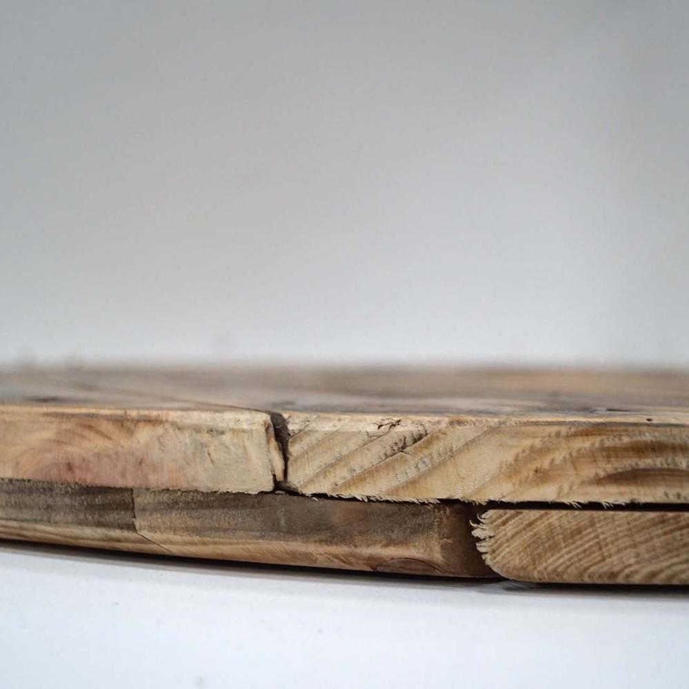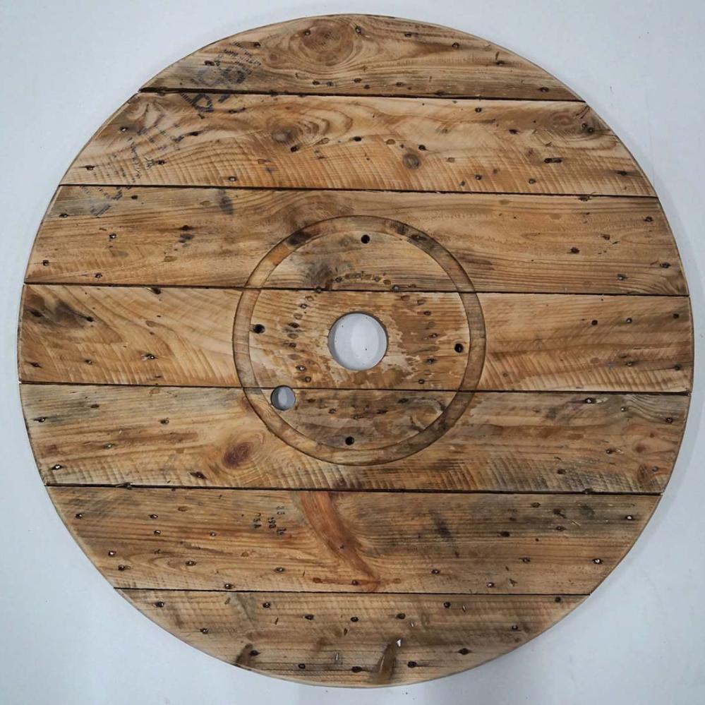 This rustic tabletop in reclaimed wood is made from old cable drums and is full of patina and character. The wood has been sanded and treated with a clear, matte lacquer that preserves its raw look while protecting the surface. The natural imperfections, knots, and holes from its previous function give the tabletop an authentic industrial style. Perfect for those who love upcycled design with an edge. This tabletop is exclusively compatible with our large SG1937 base.