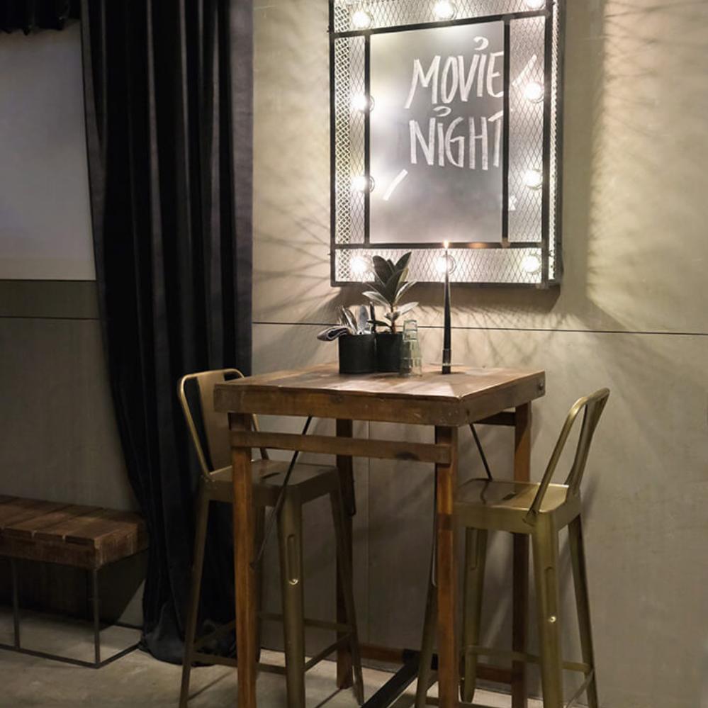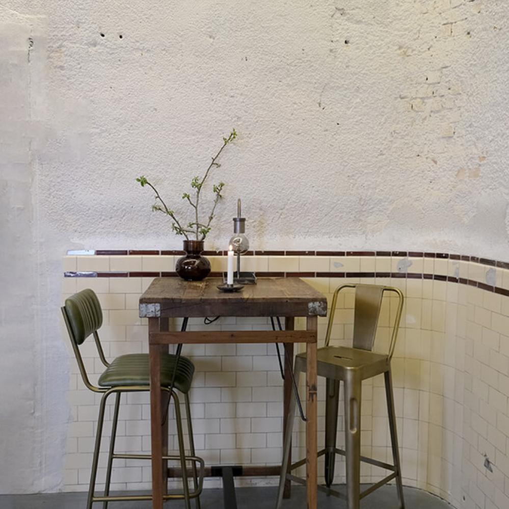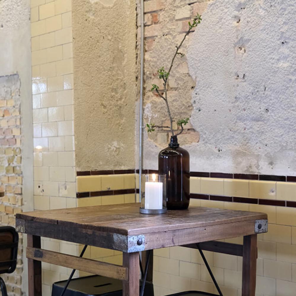 Raw and rustic wooden café/bar table for the individual decoration. The table is made of reclaimed wood and the uneven surface make each table unique. Our wide range of bar chairs are also super cool with this table.