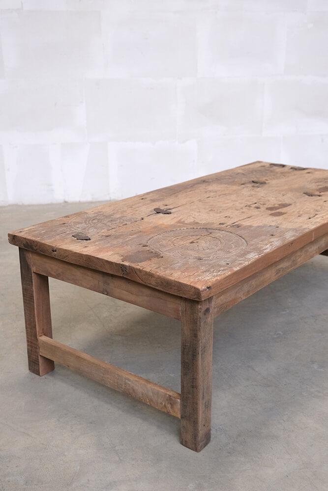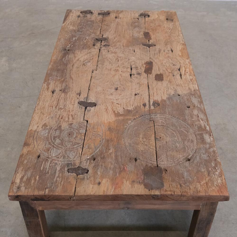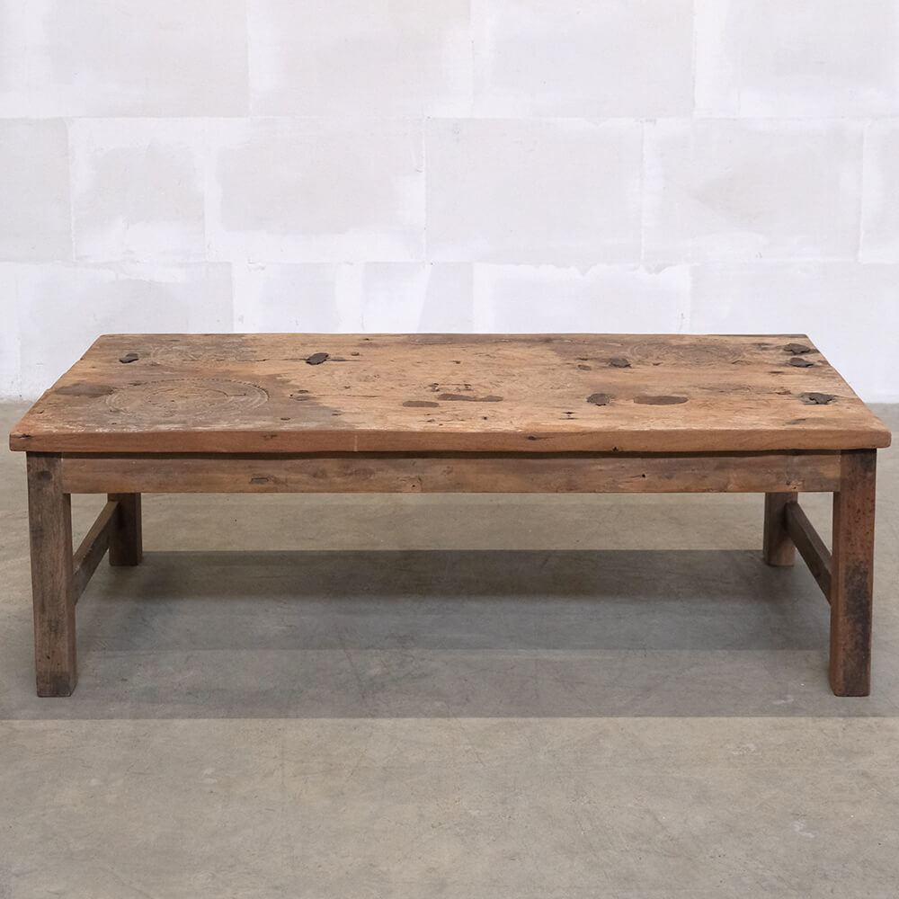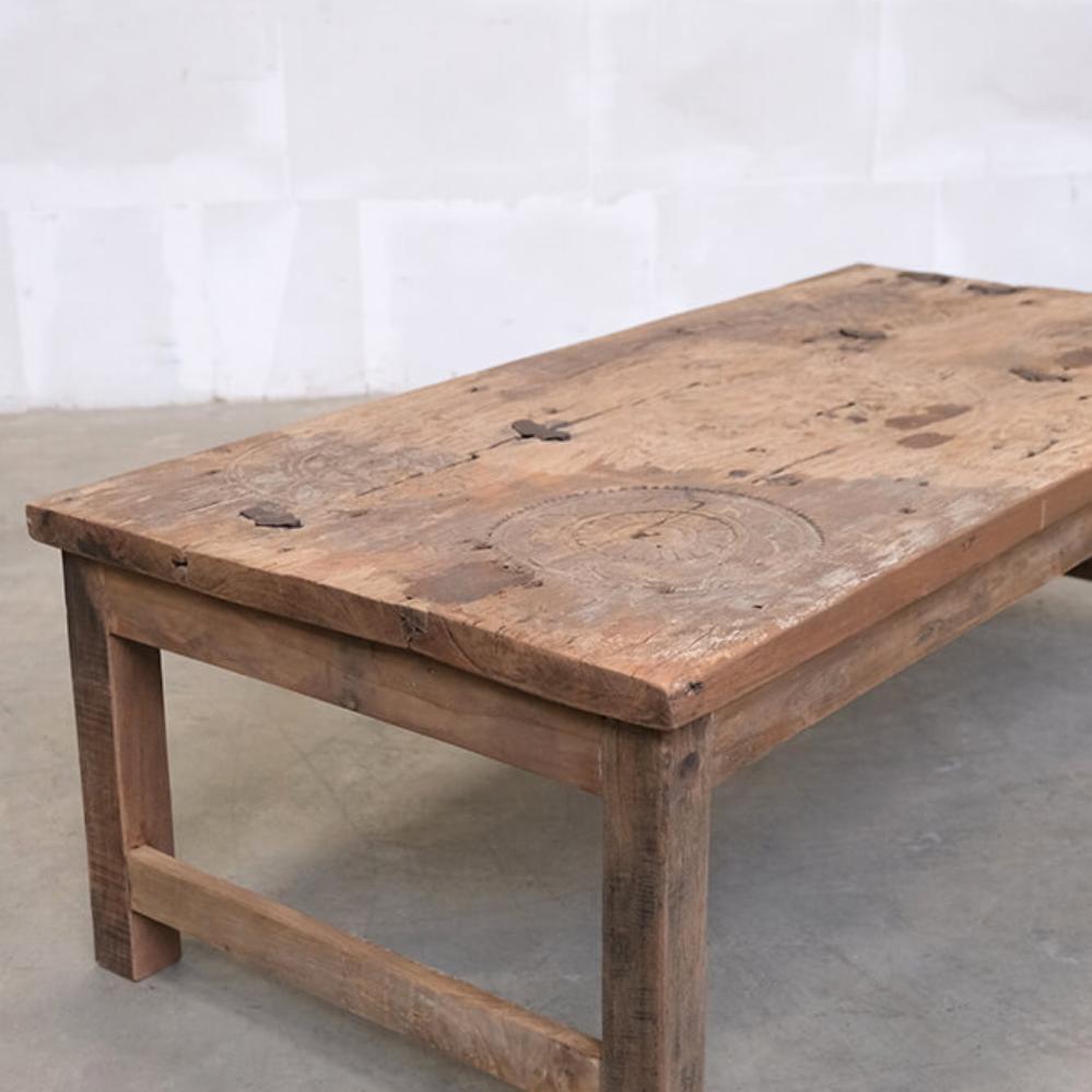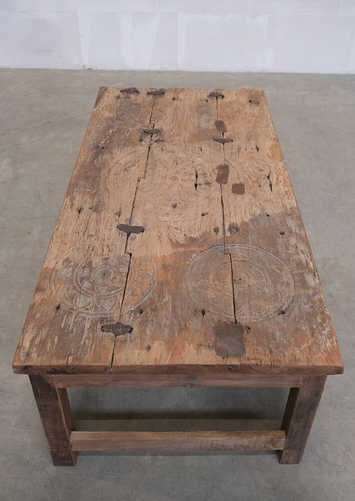 This coffee table is a piece of furniture with real character. The history is visible in every detail of the wood. The tabletop is made from an old door with beautifully hand-carved details that can still be seen in the wood’s surface. Natural cracks, joints, and marks from years of use have been preserved, giving the table an authentic and vibrant expression. The base is crafted from solid reclaimed wood that complements the tabletop’s rustic charm and underlines the table’s unique personality. Together, the materials create a piece that feels both raw, warm, and full of soul. This coffee table is perfect for anyone who appreciates furniture with history and individuality – whether it’s used as a striking contrast in a modern living room or as part of a more natural, rustic interior.