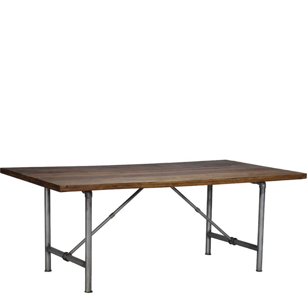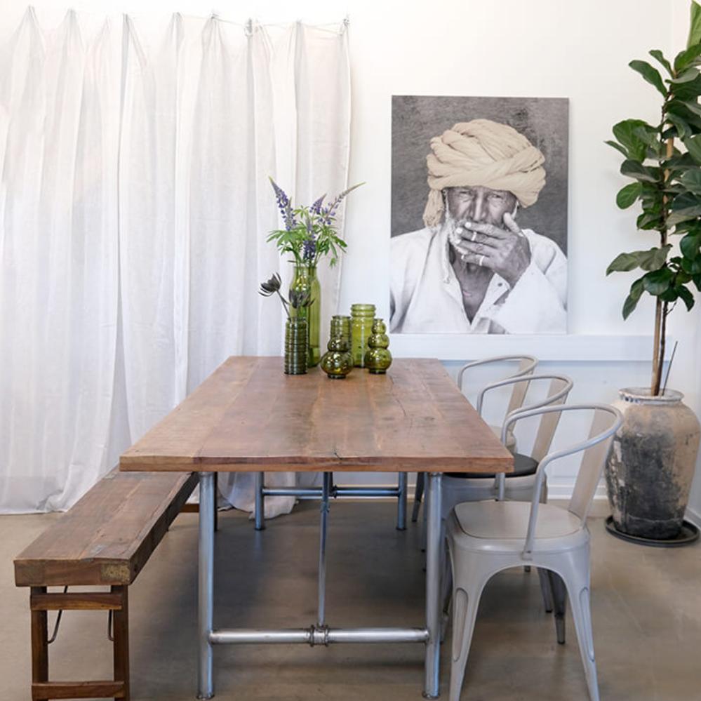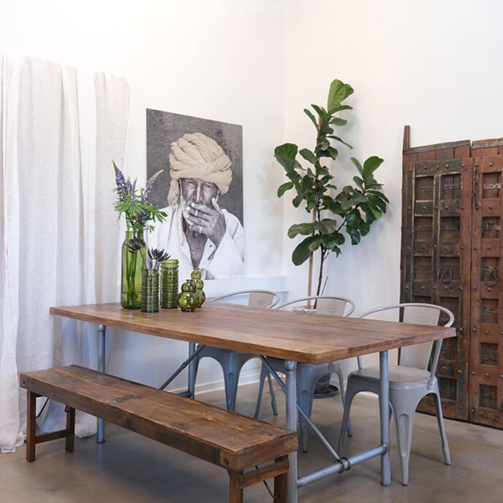 This dining table is made of reclaimed wood and supported by sturdy iron pipes, giving it a raw, industrial look. The wood features natural patinas that highlight the table’s authentic character and add charm to your kitchen or restaurant. The rustic iron pipe legs contribute to the table’s stability and emphasise its rugged, masculine design. It is perfect for modern and vintage-inspired interiors and is a rustic and functional centrepiece.