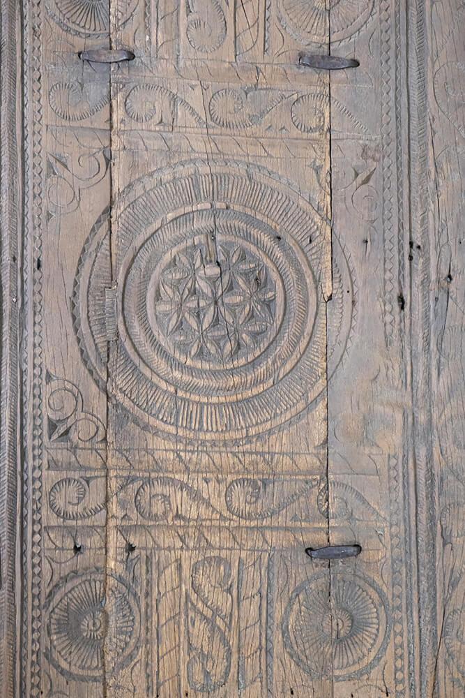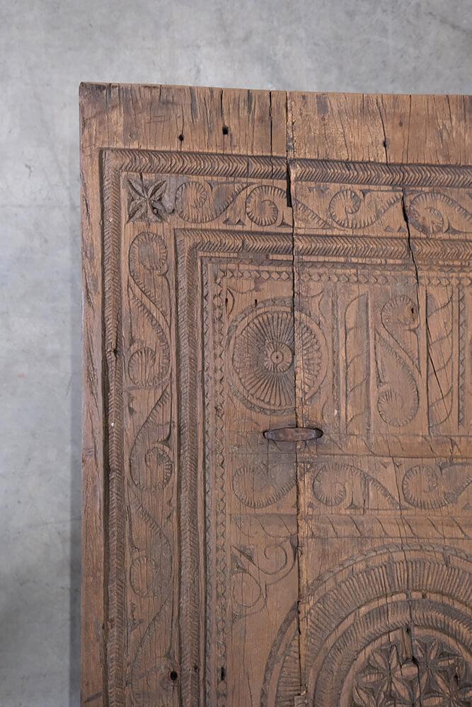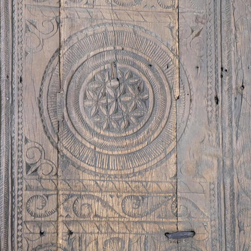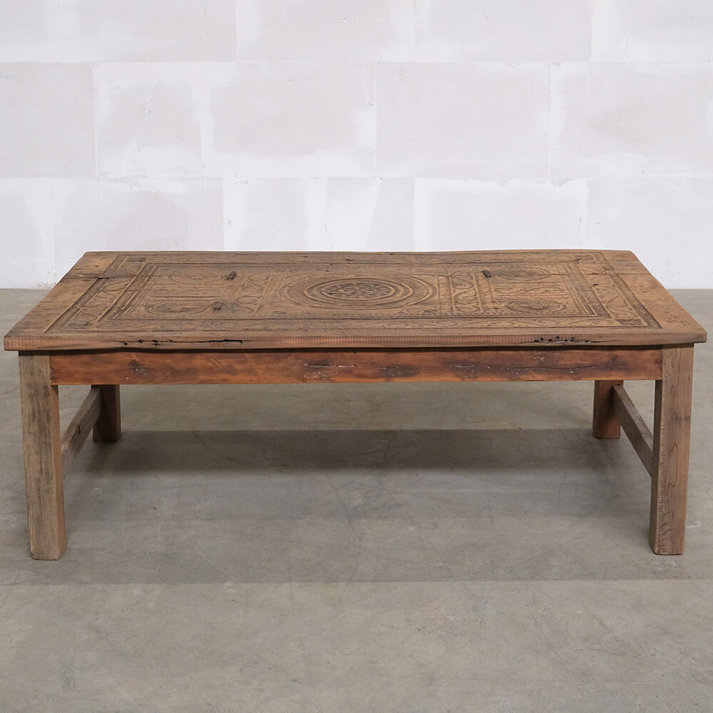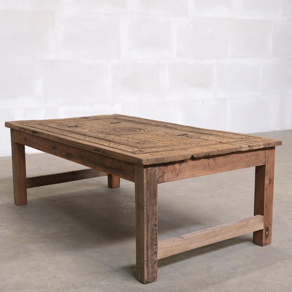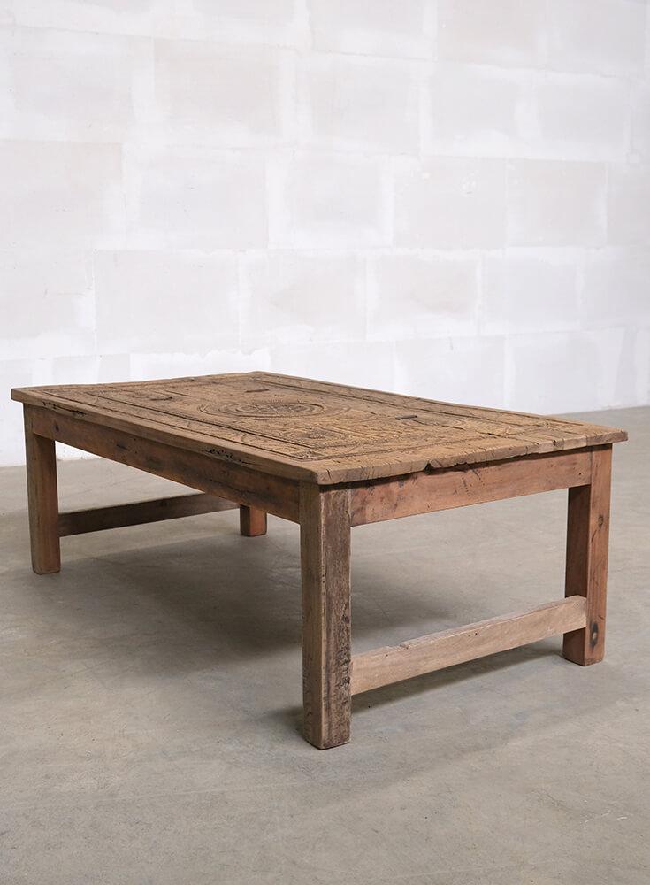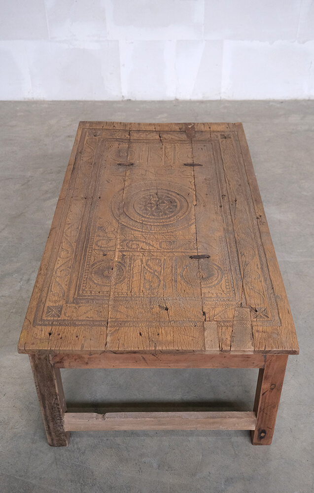 This unique coffee table is a piece of rustic and authentic craftsmanship. The tabletop is decorated with beautiful carvings, giving the furniture a distinctive and characterful appearance. The wood features a delightful natural patina and wear marks, telling stories of its previous life. Its robust design and handcrafted details make it ideal for interiors seeking charm and authenticity. Perfect as a centerpiece in the living room or as a decorative element in a setting that values vintage and unique character.