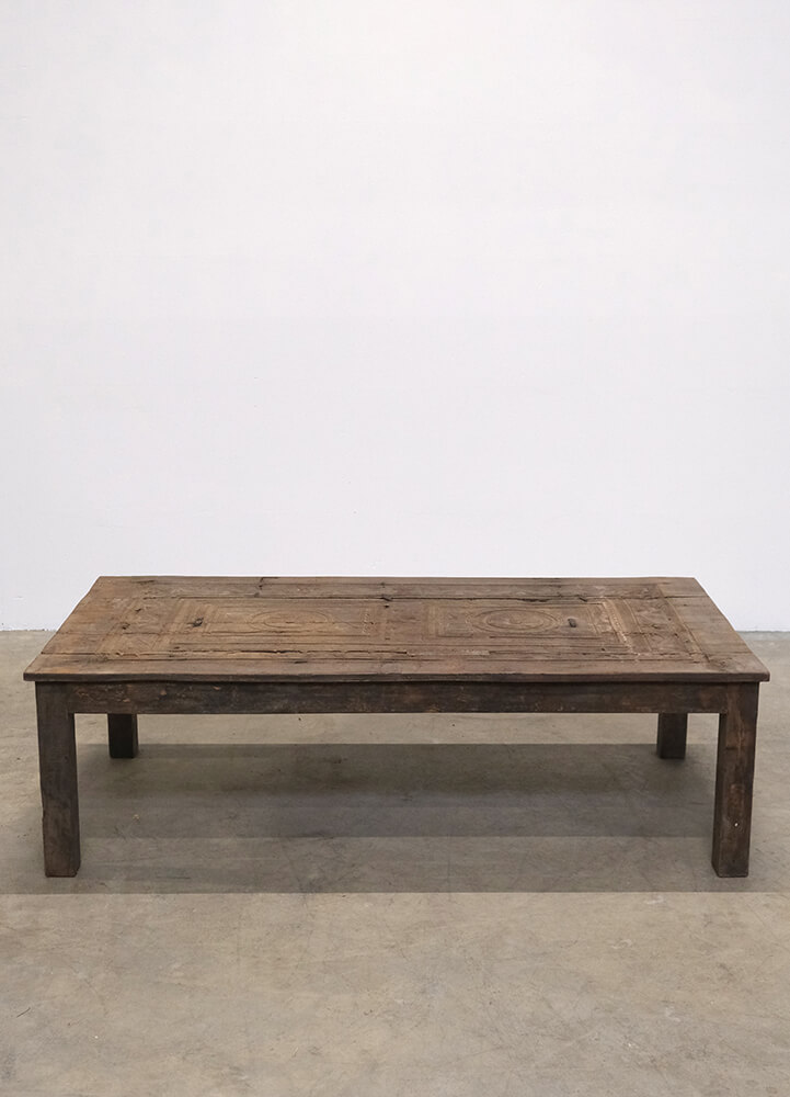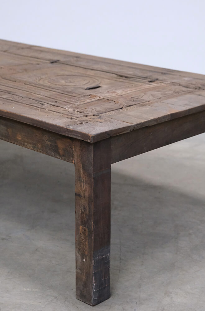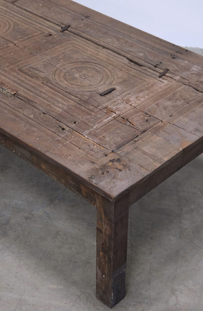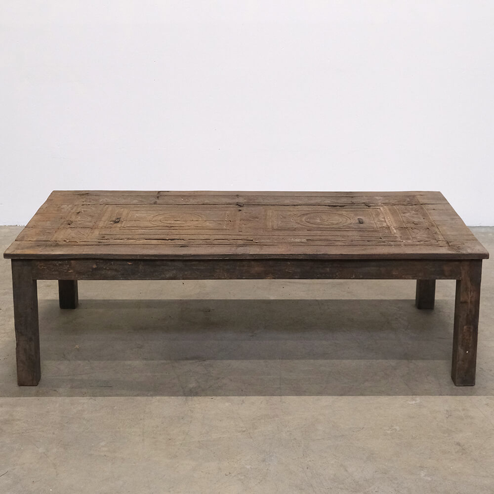 This unique coffee table is a piece of rustic and authentic craftsmanship. The tabletop is decorated with beautiful carvings, giving the furniture a distinctive and characterful appearance. The wood features a delightful natural patina and wear marks, telling stories of its previous life. Its robust design and handcrafted details make it ideal for interiors seeking charm and authenticity. Perfect as a centerpiece in the living room or as a decorative element in a setting that values vintage and unique character.