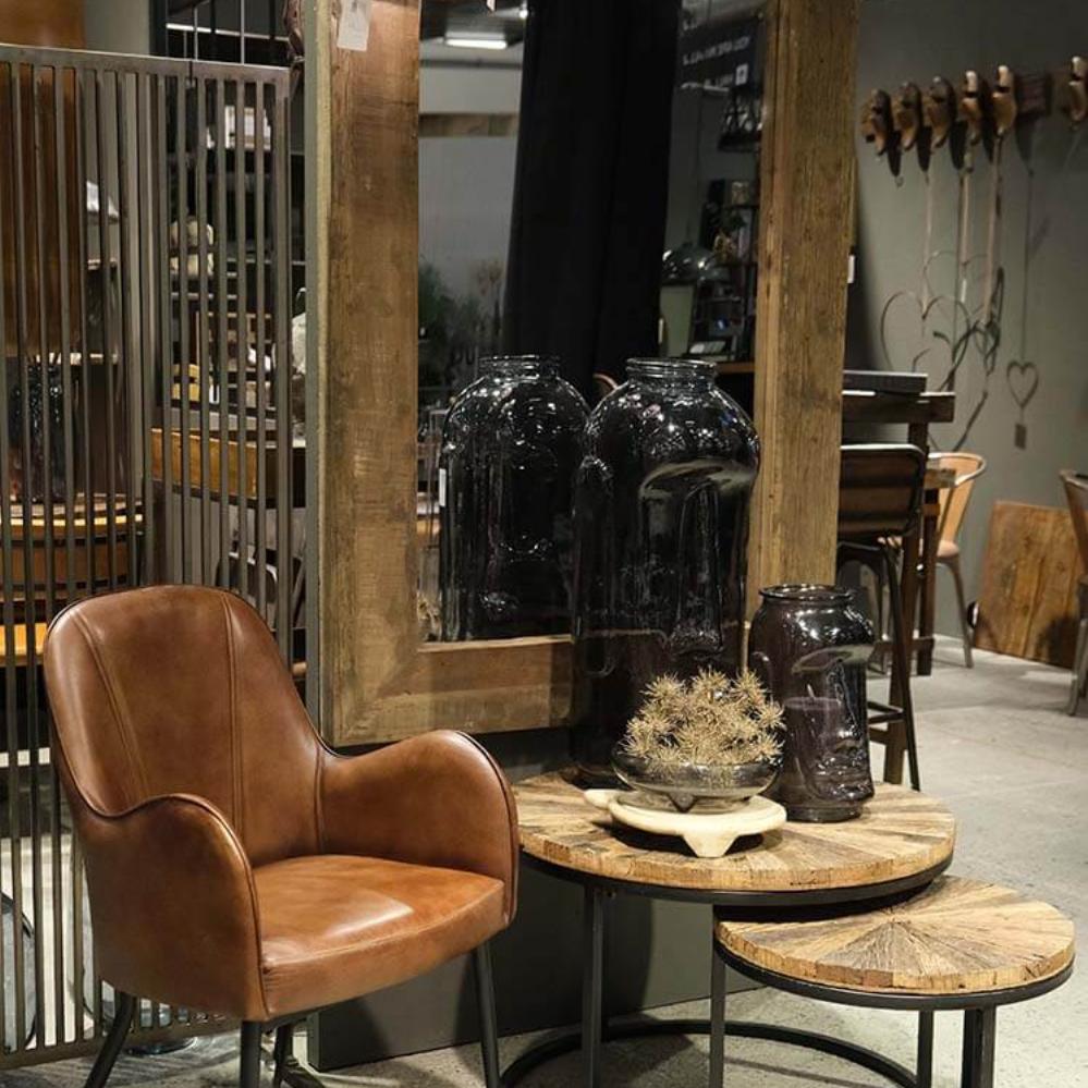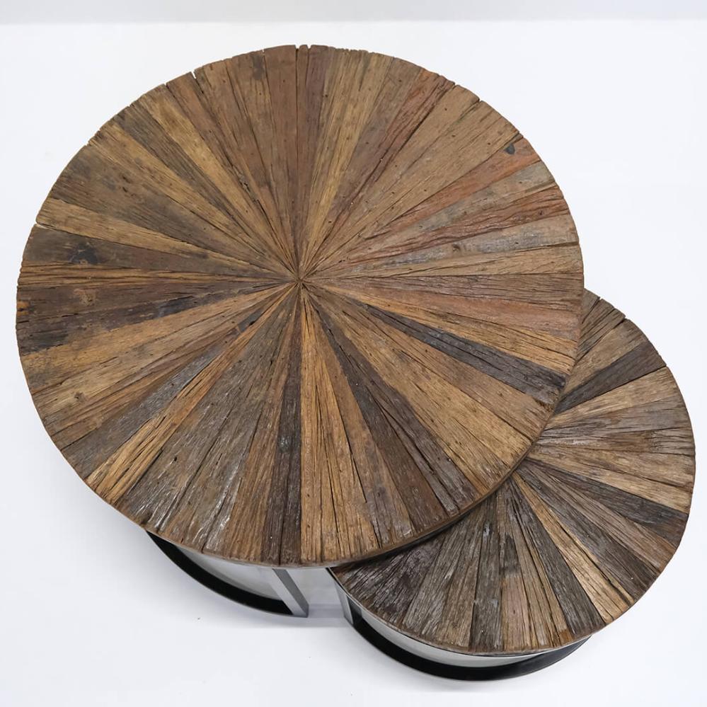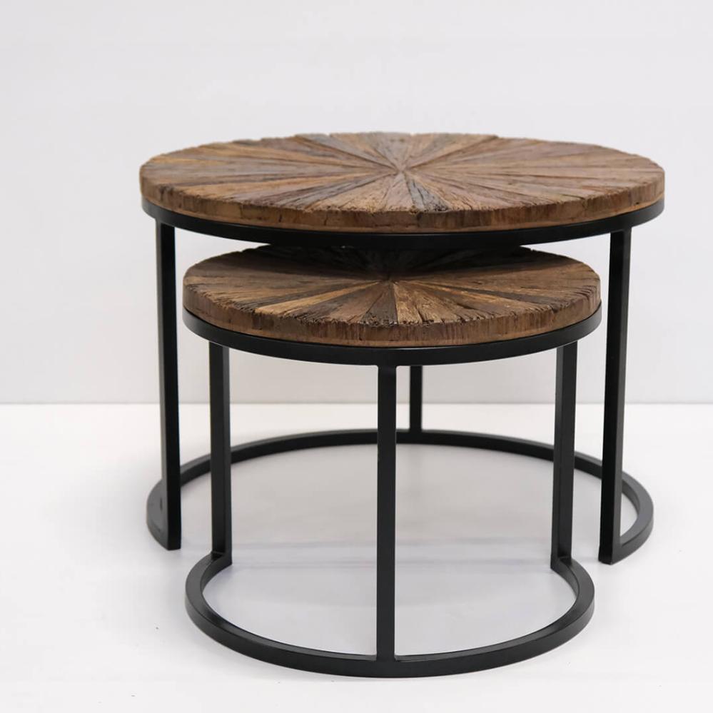Decorate with nature with this nesting table in reclaimed wood. With rustic table tops and a black lacquered iron frame, the table is a fantastic fusion of organic nature and raw industrial style. Use it as a coffee table in the living room, a café table or for a cozy corner at the office. Large: H: 49cm x W: 70cm x D: 70cm Small: H: 40cm x W: 50cm x D: 50cm