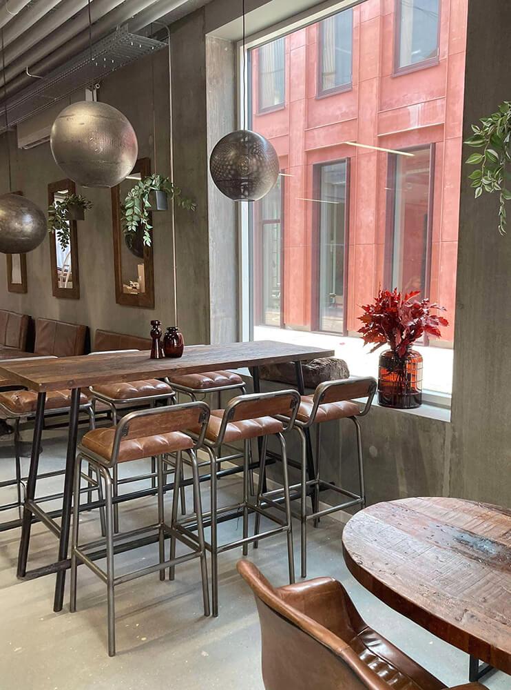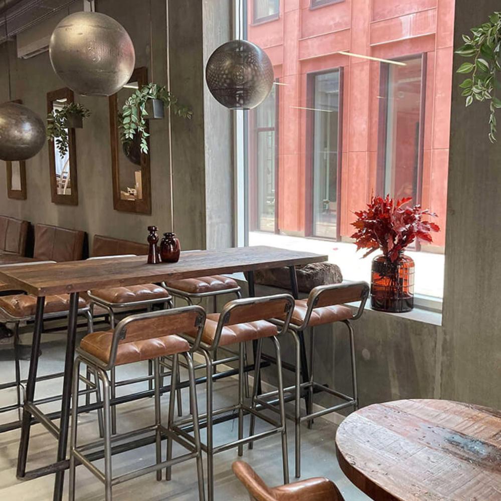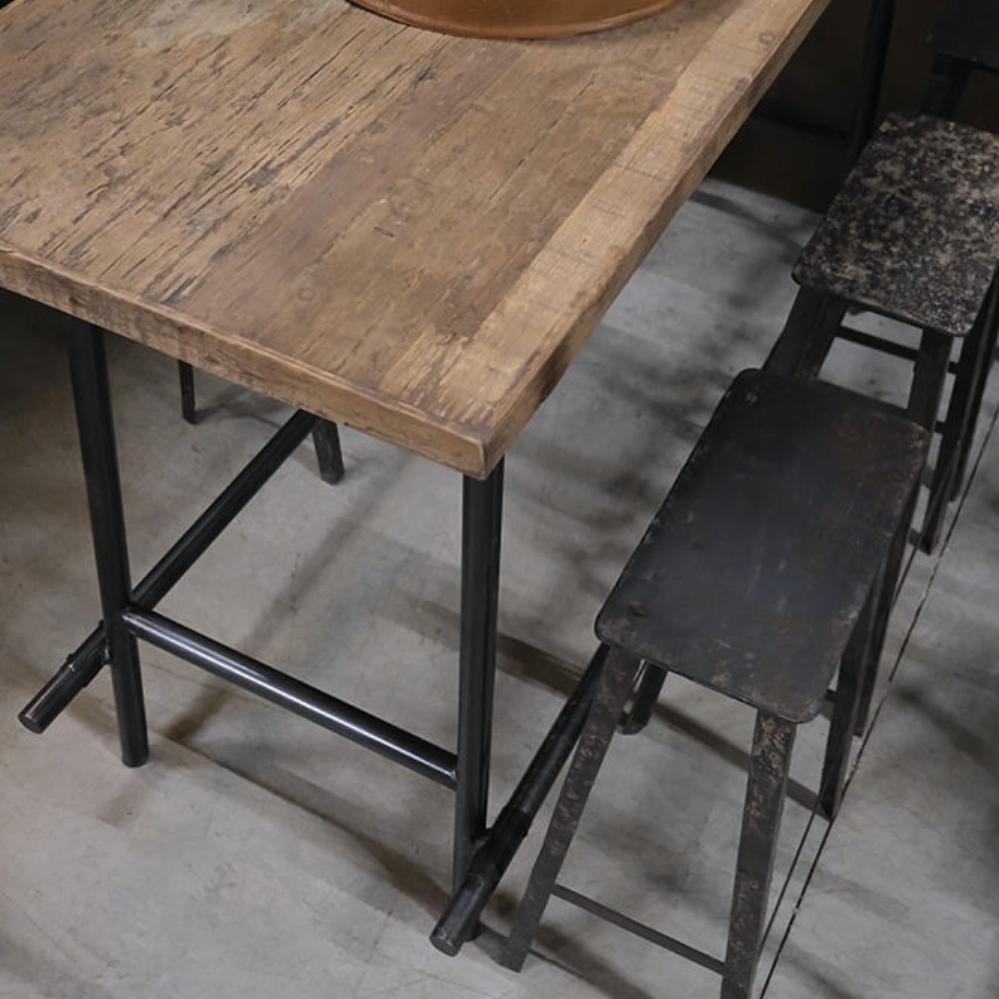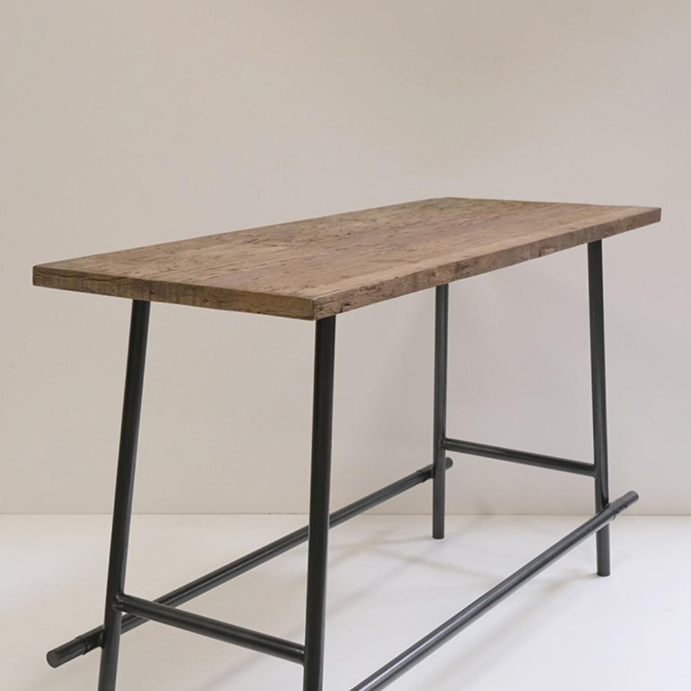 This bar table combines raw wood and iron in a design that is as simple as it is striking. The sleek frame supports a textured tabletop with warm tones from the wood. The table's clean expression makes it perfect for a modern interior style.