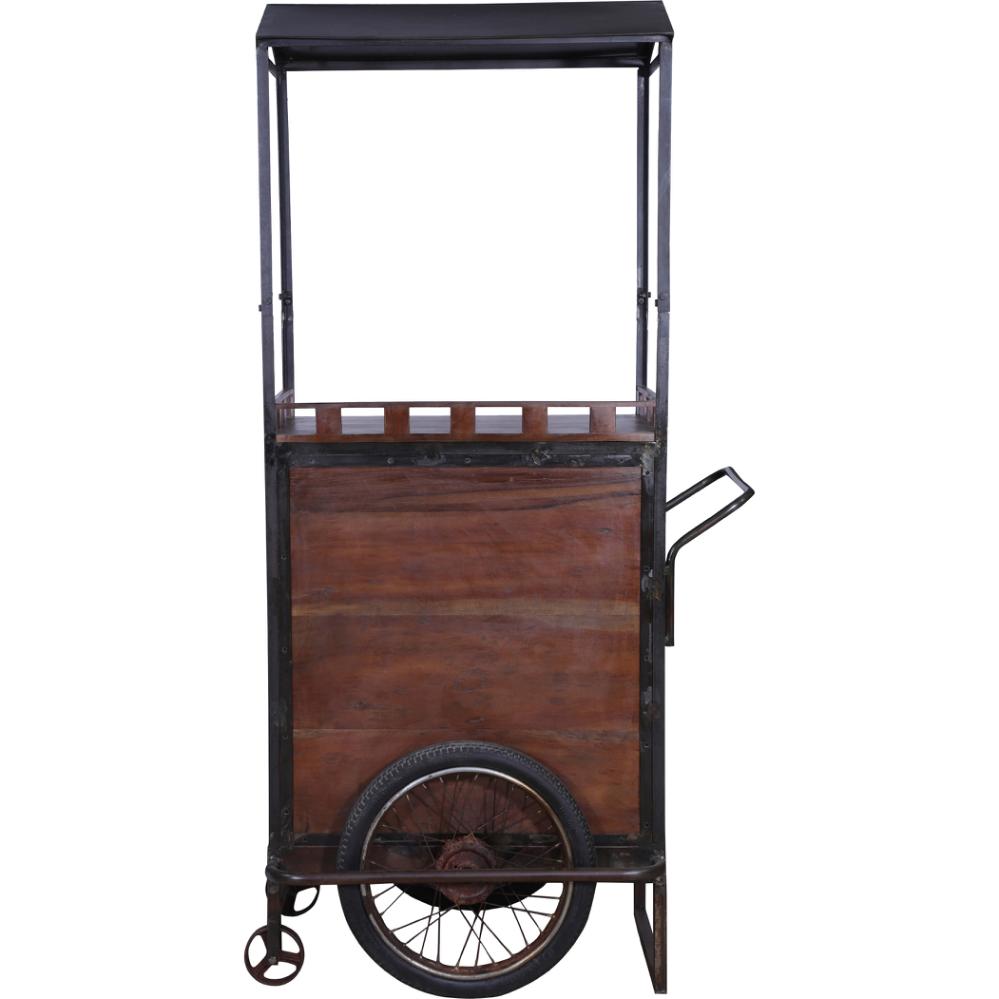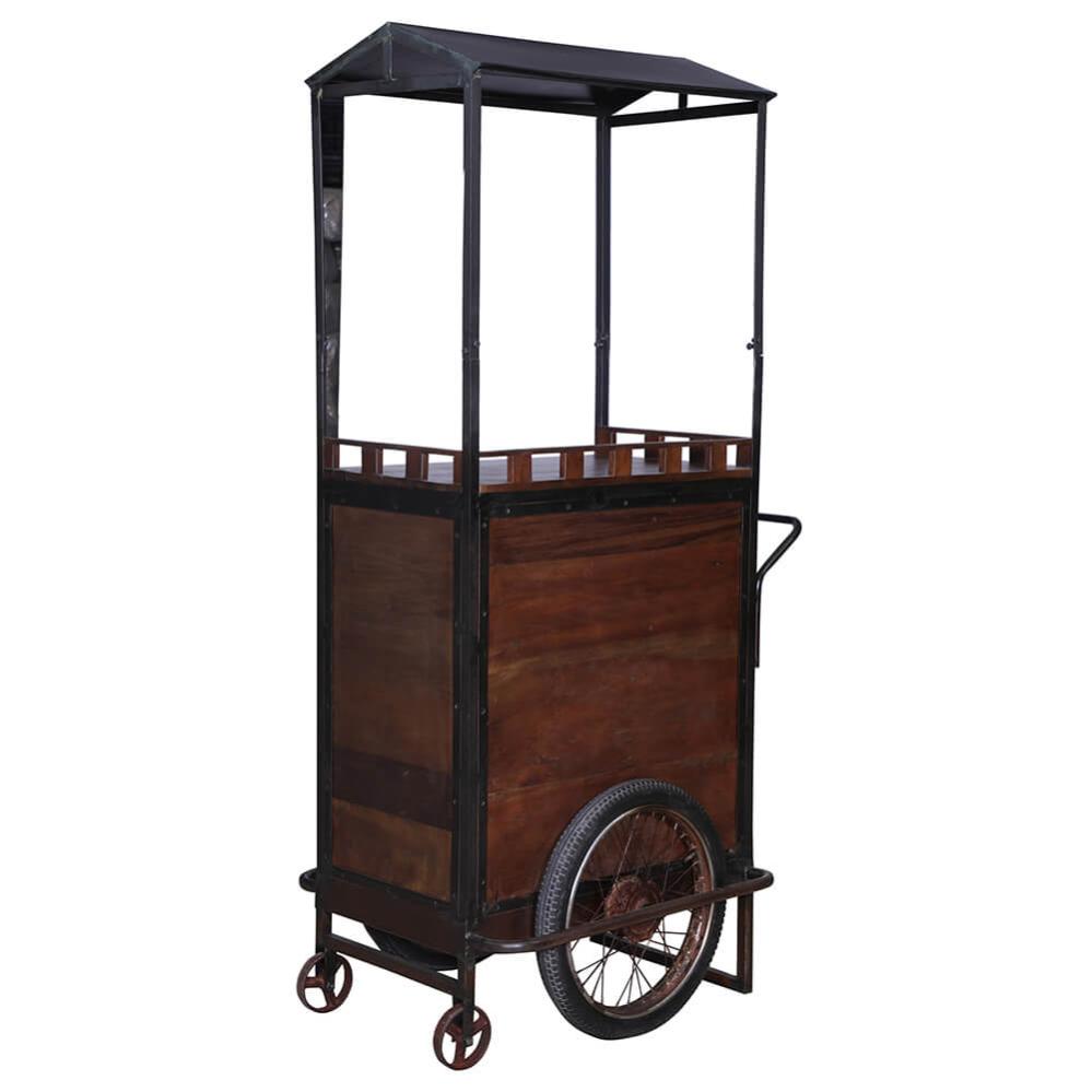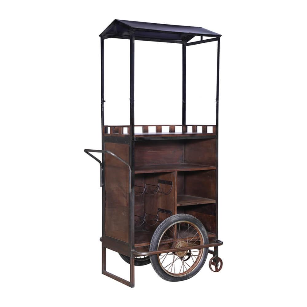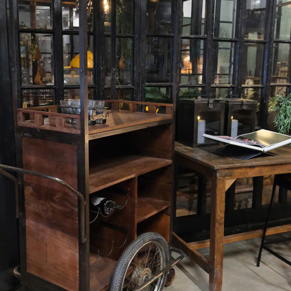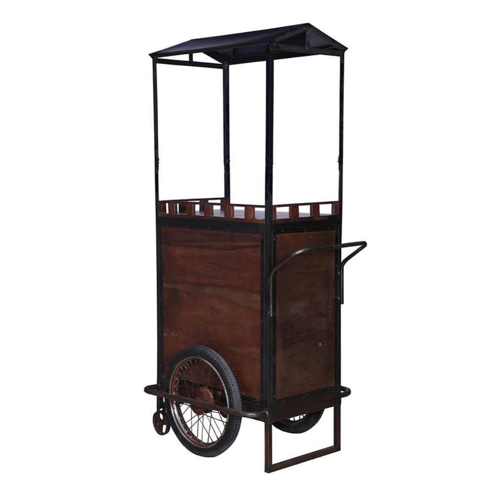 May we present our festive bar cart with a metal top and wheels. This bar cart features fun details, including charming bicycle wheels, small decorative wheels, and a lovely wooden edge on the tabletop. With ample storage space on the shelves, the bar cart provides plenty of room for your favorite beverages and glasses. Crafted of iron and dark wood, this cart combines style and user-friendliness, making it a great addition to your home bar or your next event. Elevate your hosting role with this fantastic bar cart that exudes nostalgia and charm.