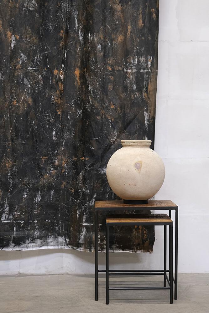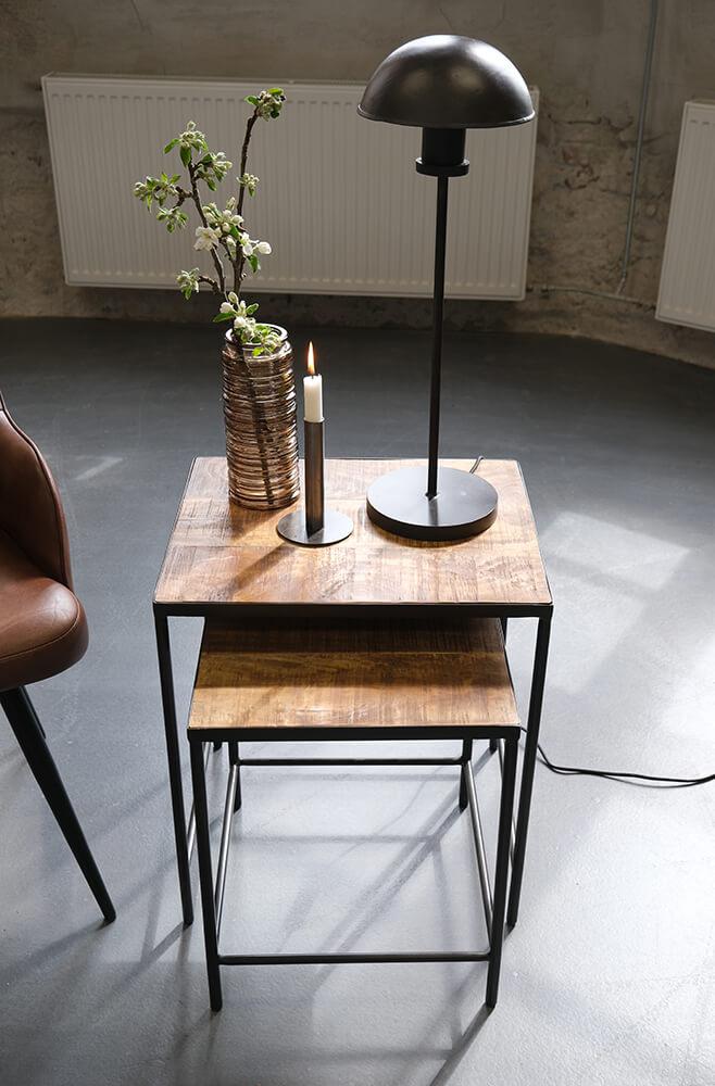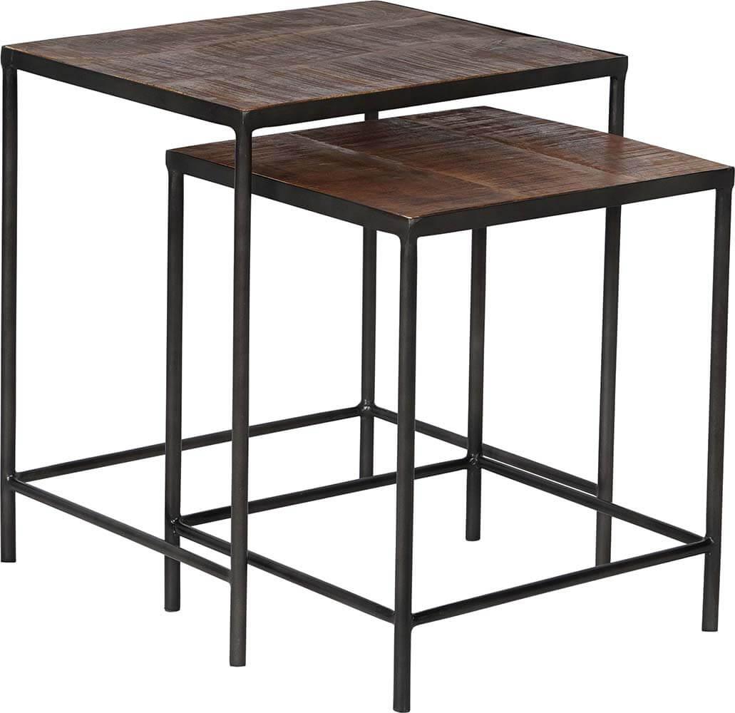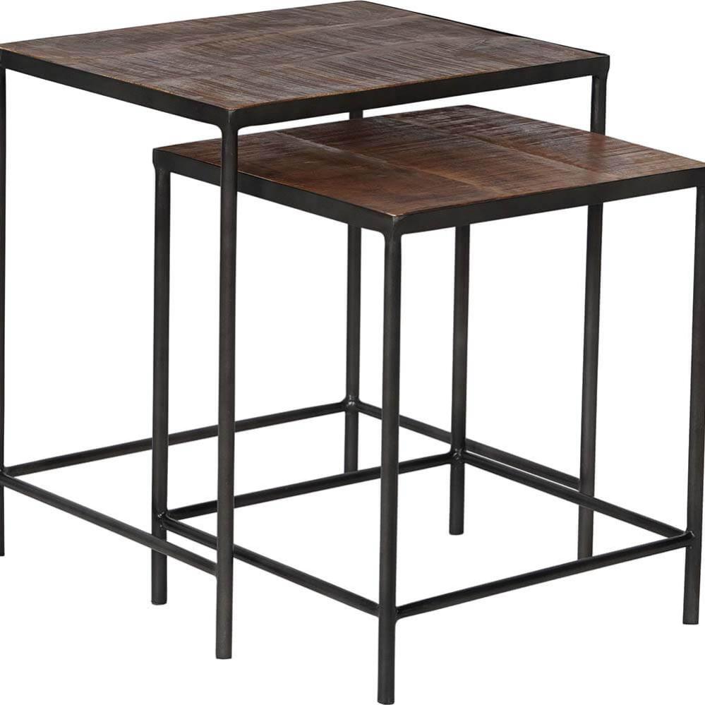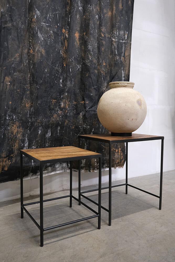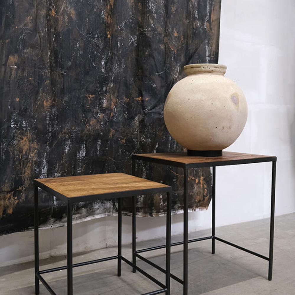 This nesting table set is a minimalist duo combining rustic wood with a sleek metal frame. The larger table has a simple square shape, mirrored by the smaller table that can easily slide underneath. The tabletops are made of dark wood, creating a beautiful contrast with the thin metal legs. Perfect for saving space while adding industrial charm to the room. This set is not only practical but also incredibly versatile, - use it as coffee tables, side tables, or to display your favorite decorative items. The design is clean and understated, yet with a touch of raw aesthetics that speaks to both modern and vintage-inspired interiors. Large: H: 54cm x W: 48cm x D: 40cm Small: H: 46cm x W: 40cm x D: 38cm