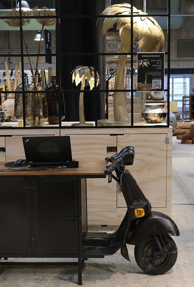 Upcycling the cool way. Here we used an old scooter and made a fun and unique bar counter out of it. A real eye catcher that is both practical and adds a fun story to your decor. The bar counter is ideal in your café or restaurant and can also be perfectly placed in the company canteen. The counter has two iron doors on each side and a continuous lower shelf and a middle shelf in the iron cabinet. The pictures speak for themselves. Please note that when ordering this counter, there may be a big difference in the color and finish of the scooter part and the top made of reclaimed wood. Top dimensions: 167 cm in length and 49 cm in depth. Tabletop height: 89.5 cm.