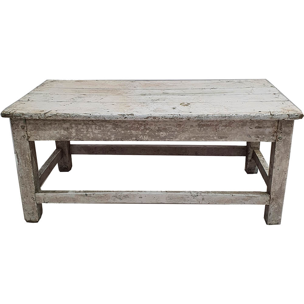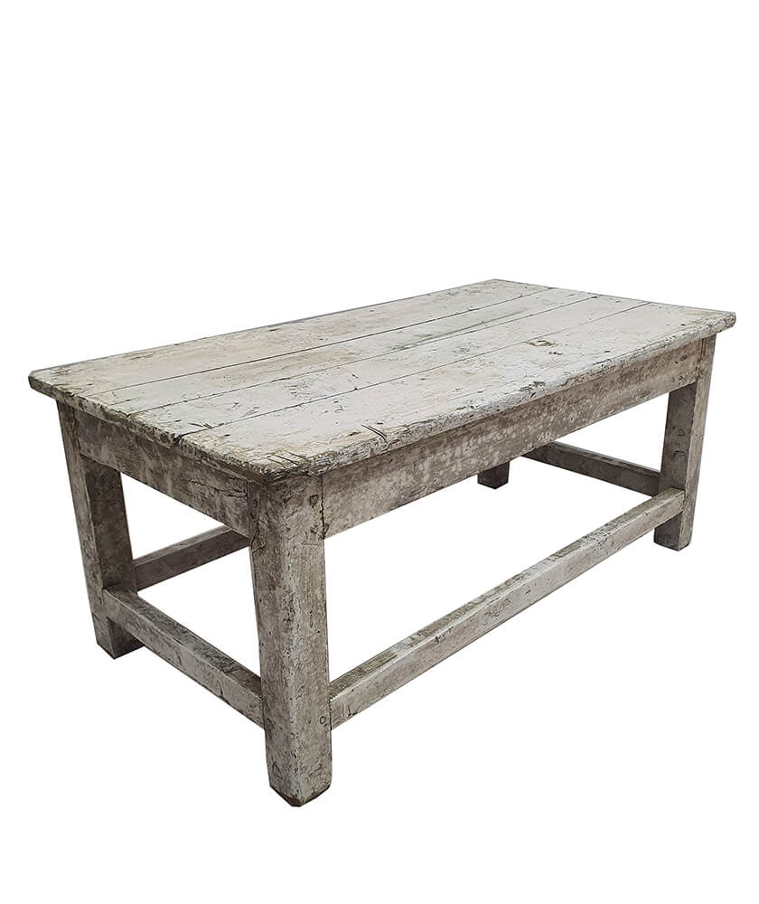 This old rustic coffee table has a simple and solid look with plenty of soul and patina. Made of solid wood, it shows clear signs of previous use in the form of wear, irregularities, and a beautiful, slightly peeling surface that gives it an authentic and lively expression. The light, muted colour fits beautifully into modern, Nordic, and more raw interiors. The construction is robust, with sturdy legs and a stable frame, making the table an ideal gathering point in the living room. The tabletop offers a good size for books, coffee cups, and decorative elements. Tip. With a height of approx. 45 cm, the table can also be used as a bench, for example, in the hallway, by the dining table, or at the foot of the bed. A unique piece of furniture where functionality and history go hand in hand.